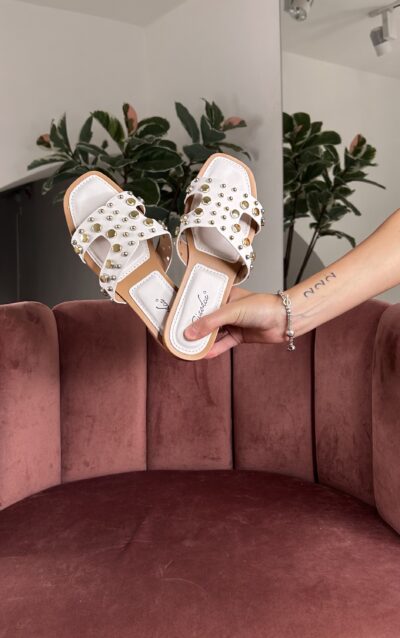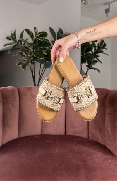 Molto morbida, cinturino effetto paglia, con dettagli gioiello