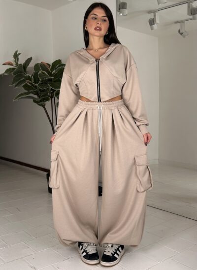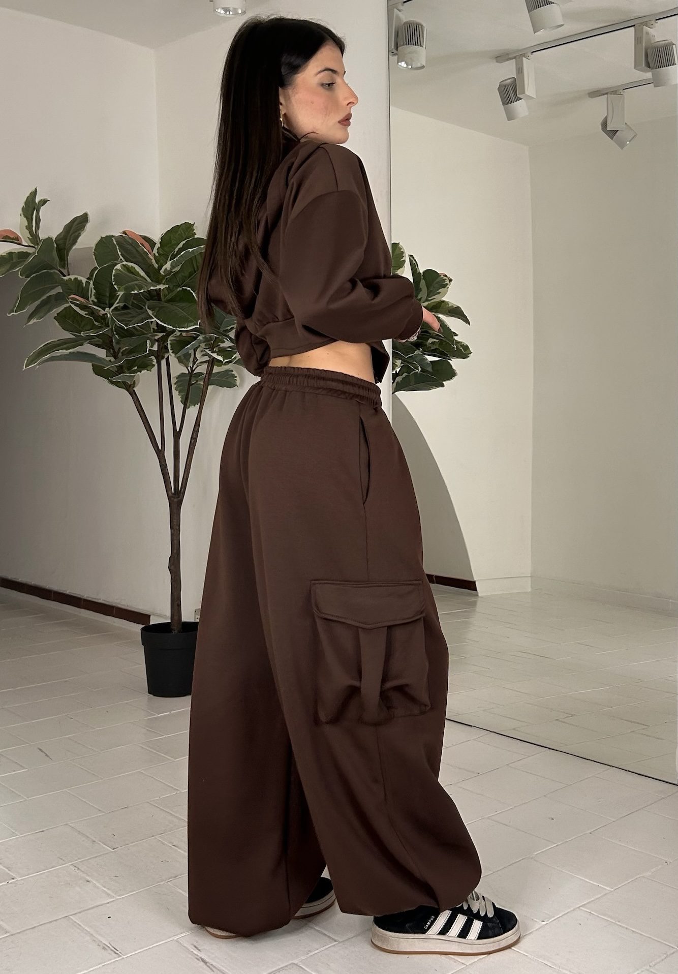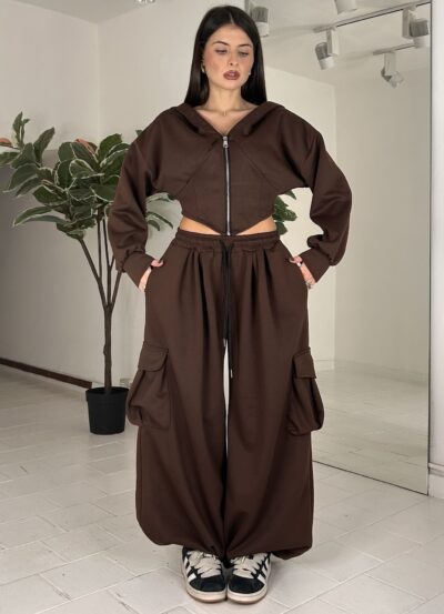 In tuta, consiglio da xs ad XL. Felpa con zip, con cappuccio. Pantalone con elastico in vita e alle caviglie. Molto comoda La modella è una taglia S ed è alta 1.60cm