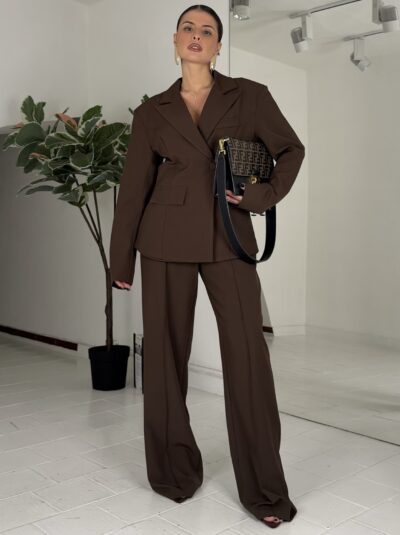 Consiglio da xs ad L. Pantalone con elastico sul retro, passanti, tasche, bottone e cerniera. Blazer foderato, con bottoni e tasca a filo. La modella è una taglia S ed è alta 1.60cm