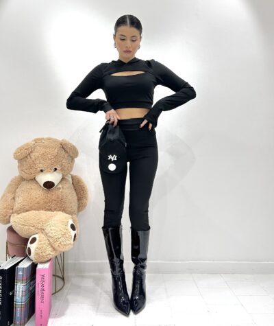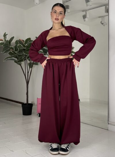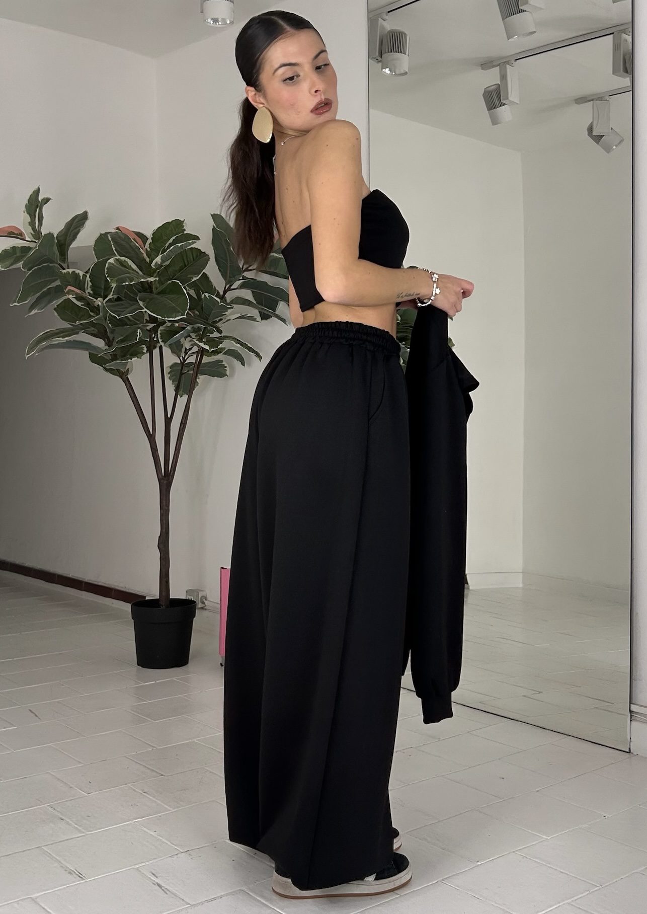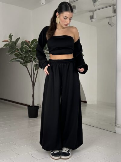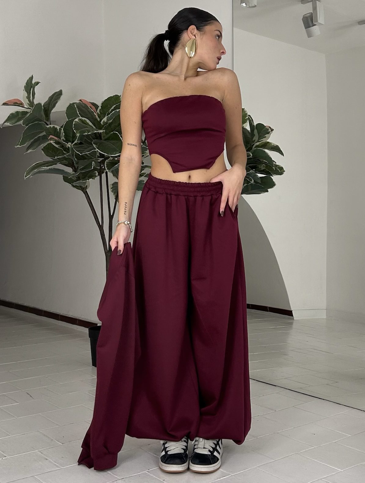 28,00 €Tre pezzi. Consiglio da xs ad XL. Pantalone con elastico in vita, alla caviglia e con tasche. Top con coppe. La modella è una taglia S ed è alta 1.60cm