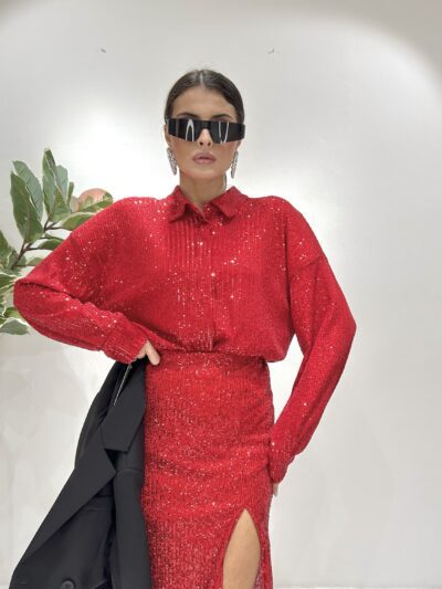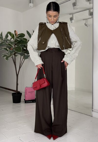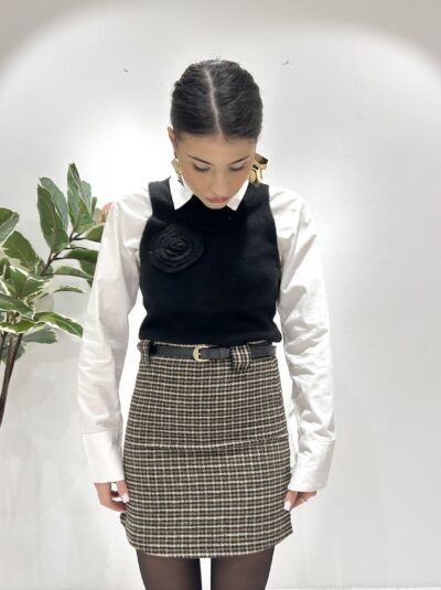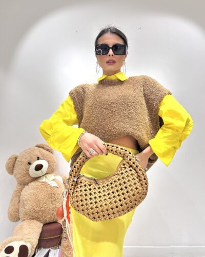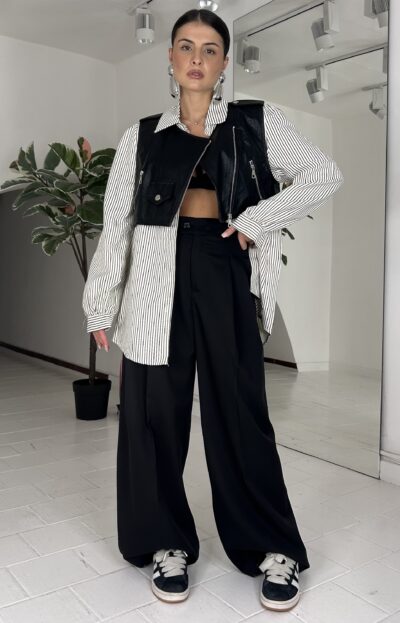 Coordinato scomponibile, gilet in ecopelle, con cerniera, bottoni, foderato. Camicia over, con bottoni e taschino