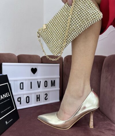 Tacco a stiletto, 5cm. In cavallino con dettagli in oro. Cinturino dietro il tallone regolabile