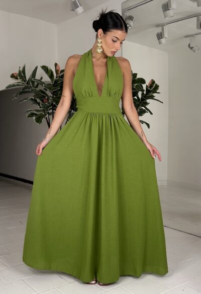 Consiglio da xs ad XL, elasticizzato, in lino, regolabile dietro il collo. La modella è alta 1.60cm ed è una taglia S