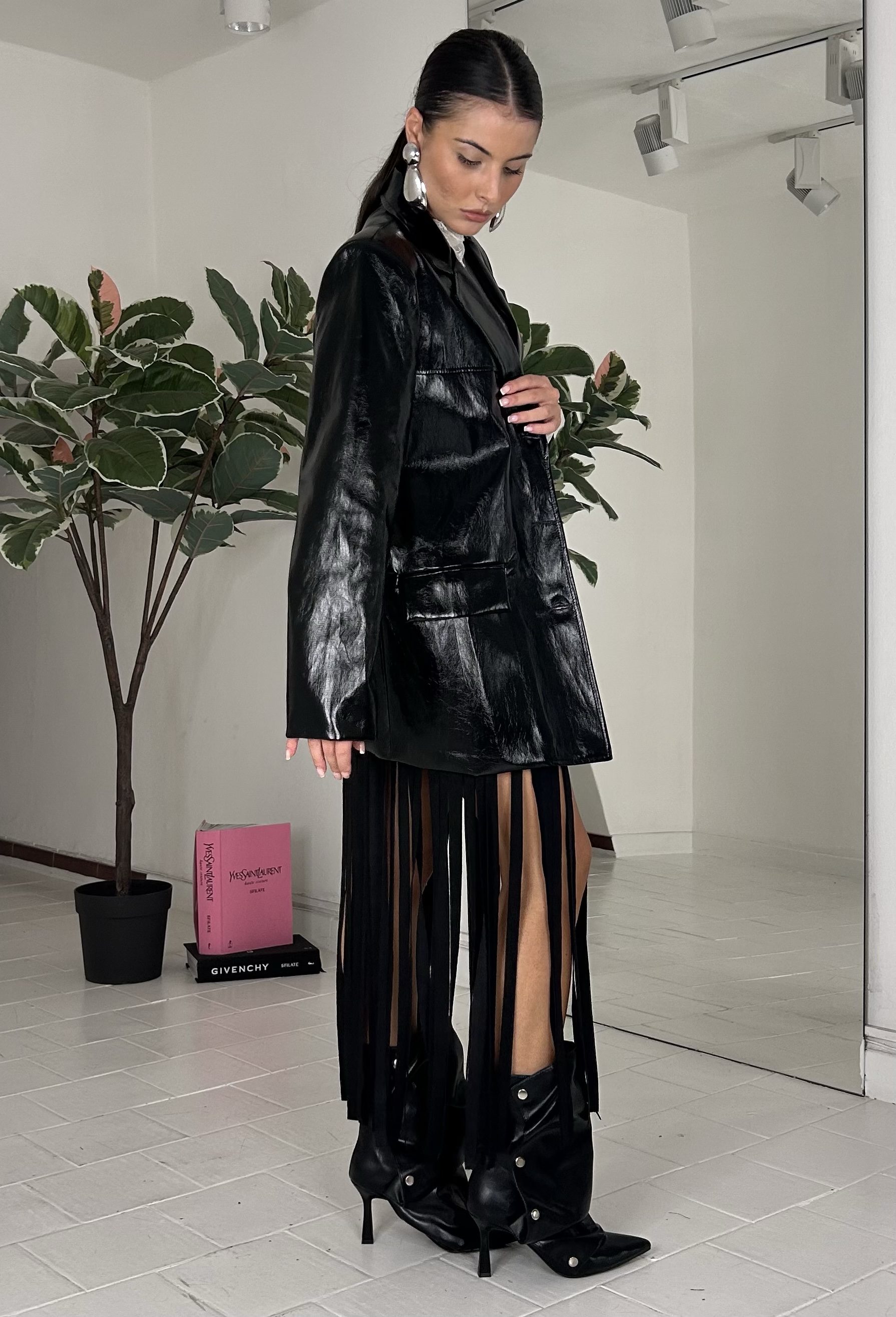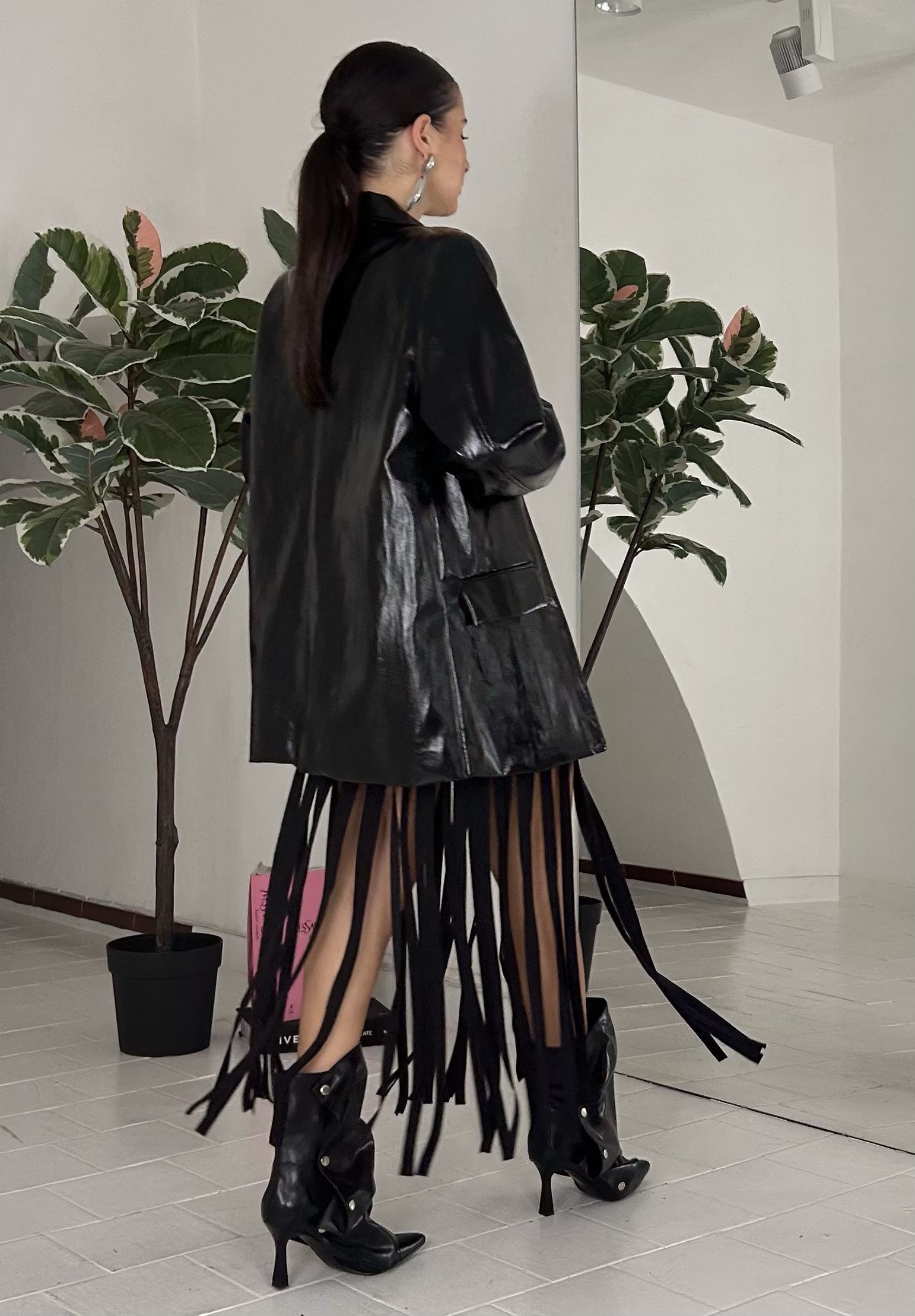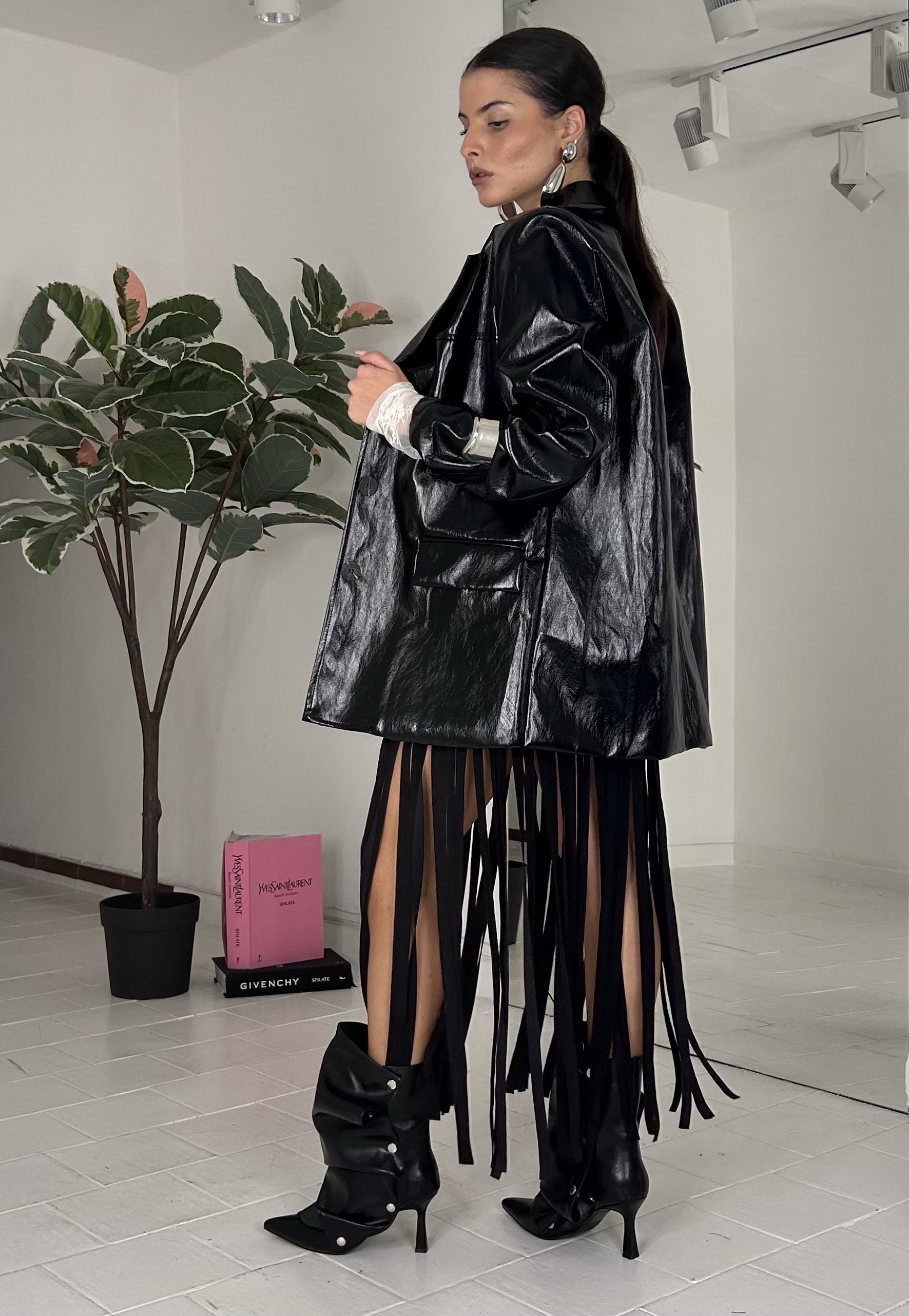 Consiglio da xs ad XL, oversize, strutturato, con bottoni, in vinile. La modella รจ una taglia S