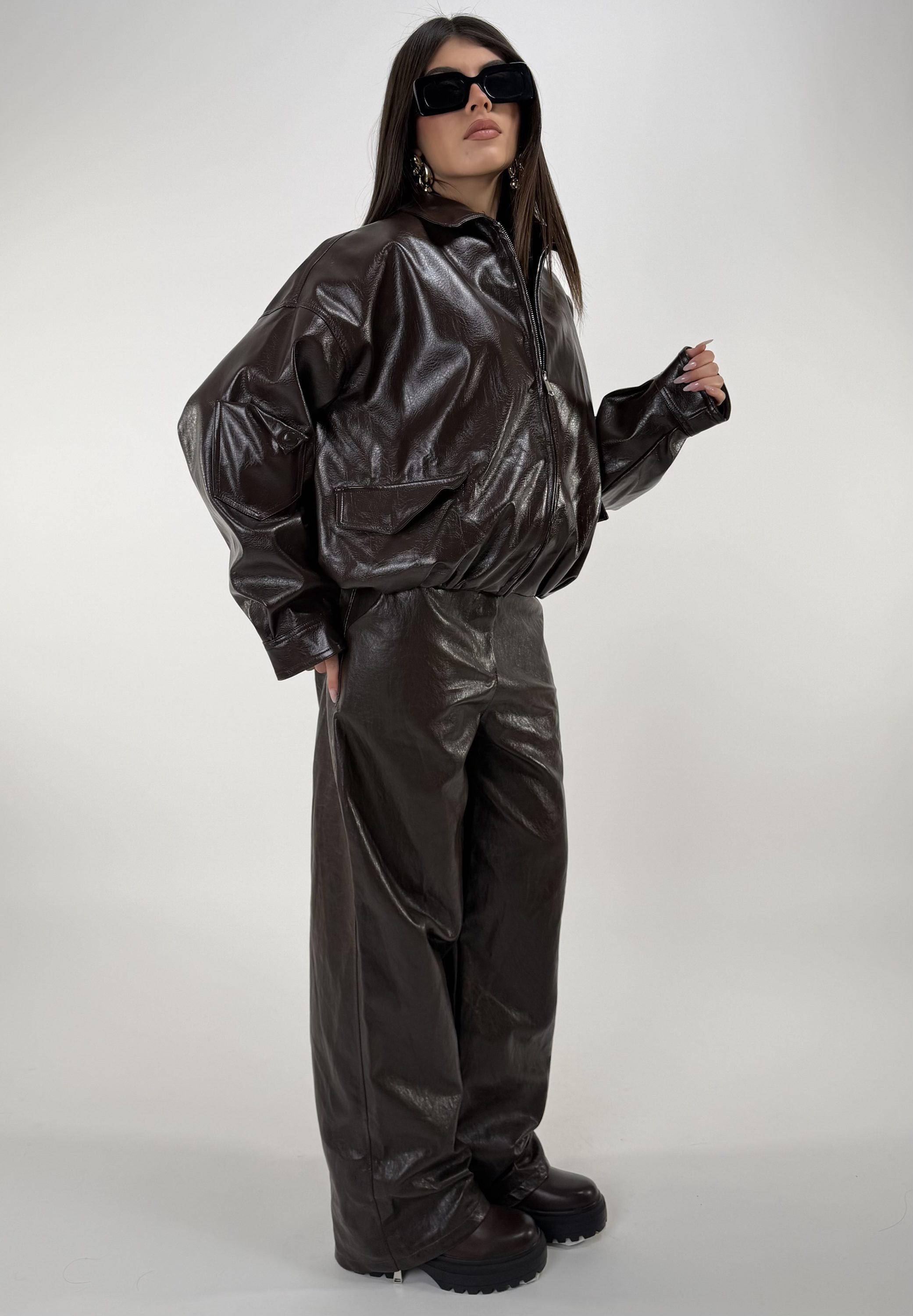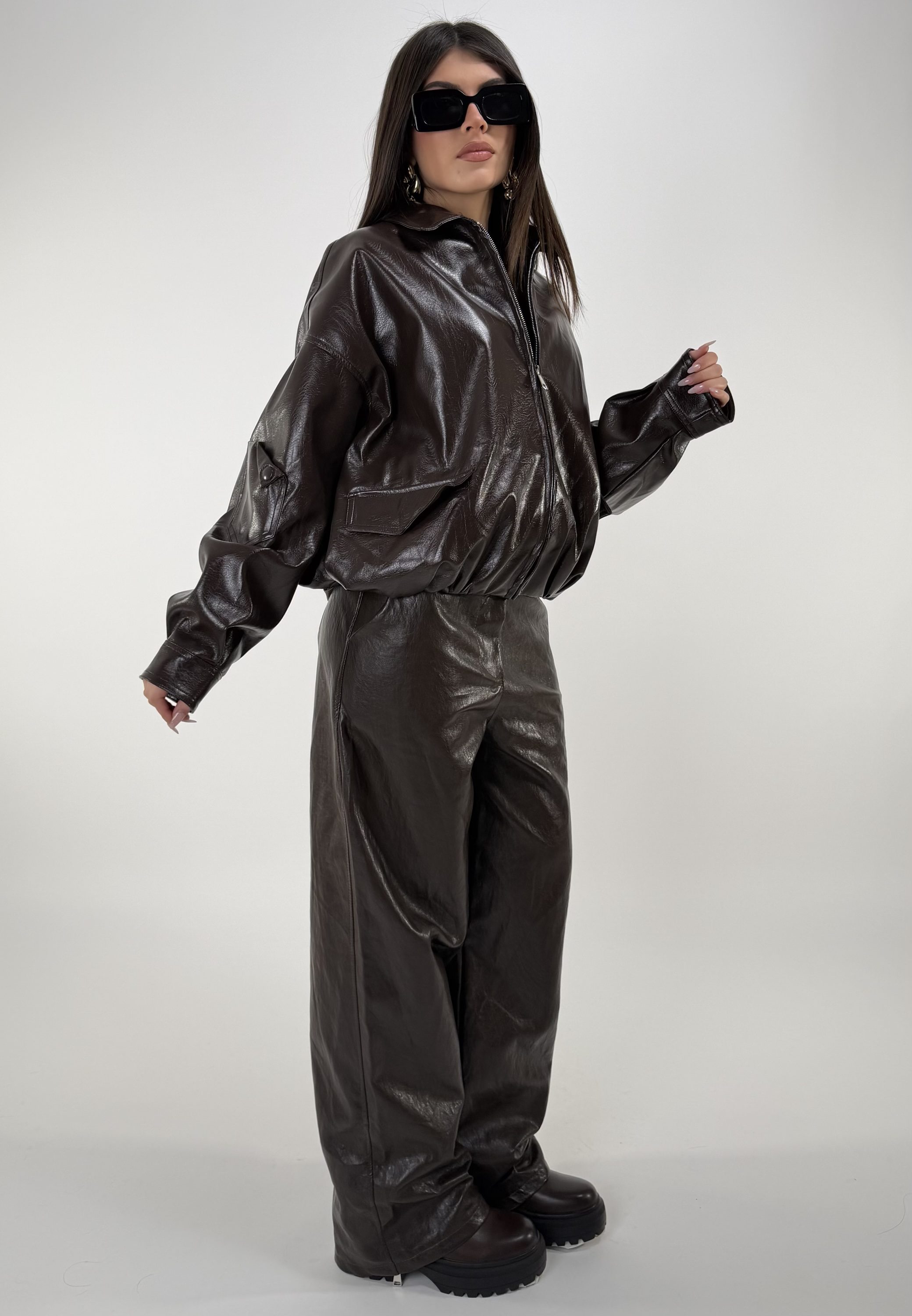 Consiglio da xs ad L, oversize, con elastico sulla base, zip. In ecopelle. La modella รจ una taglia S ed รจ alta 1.65cm
