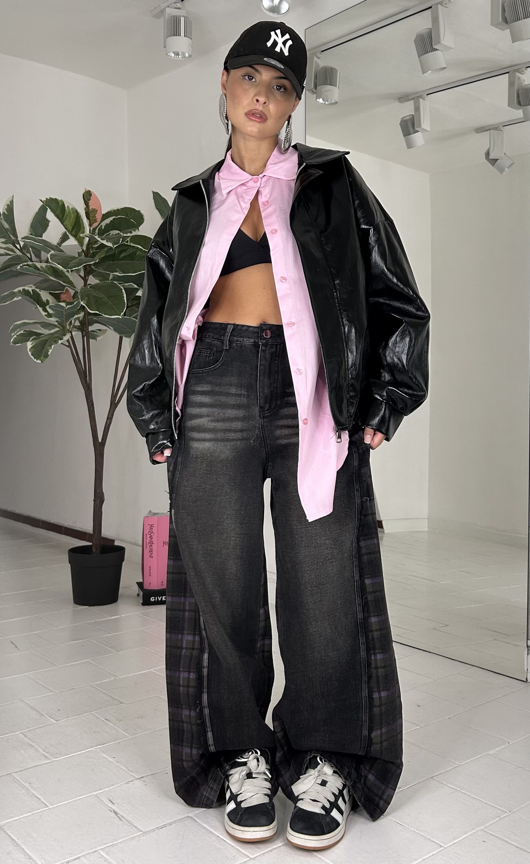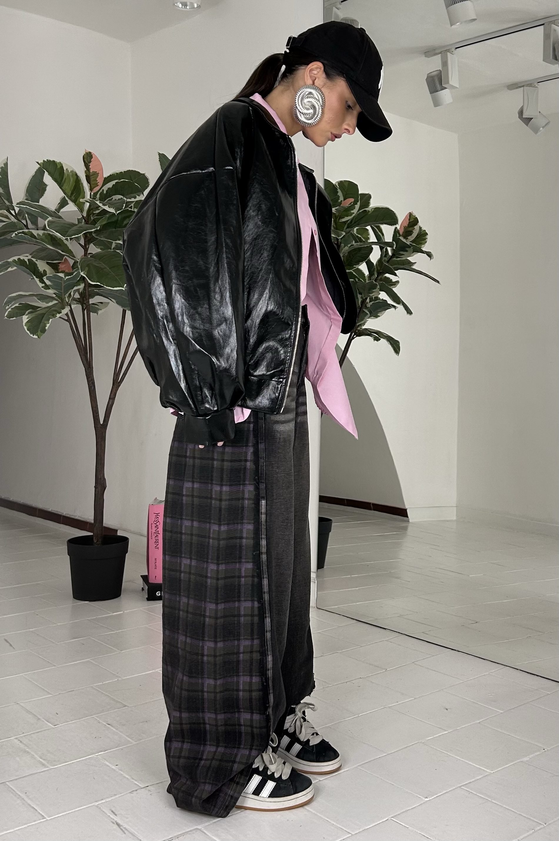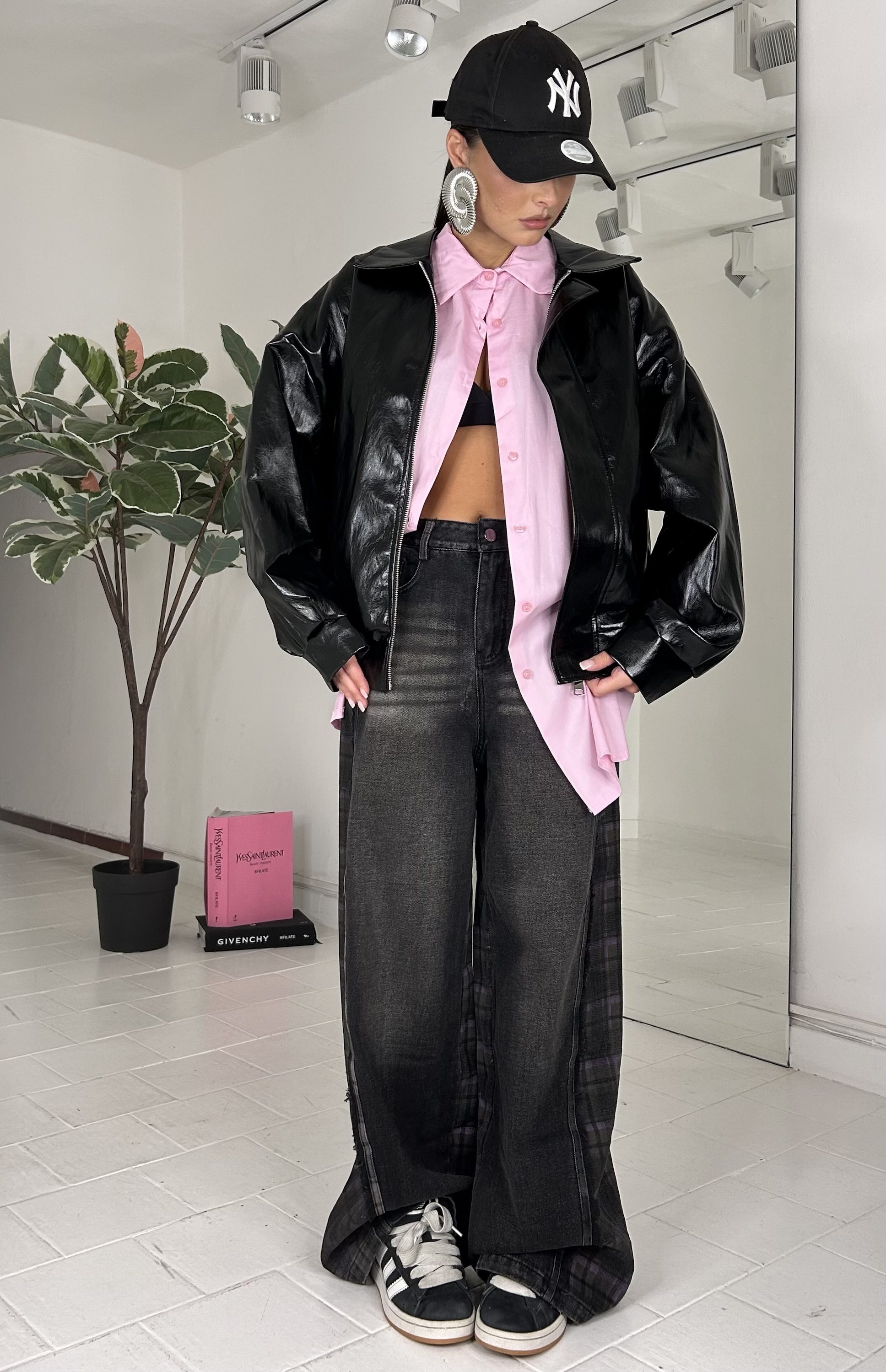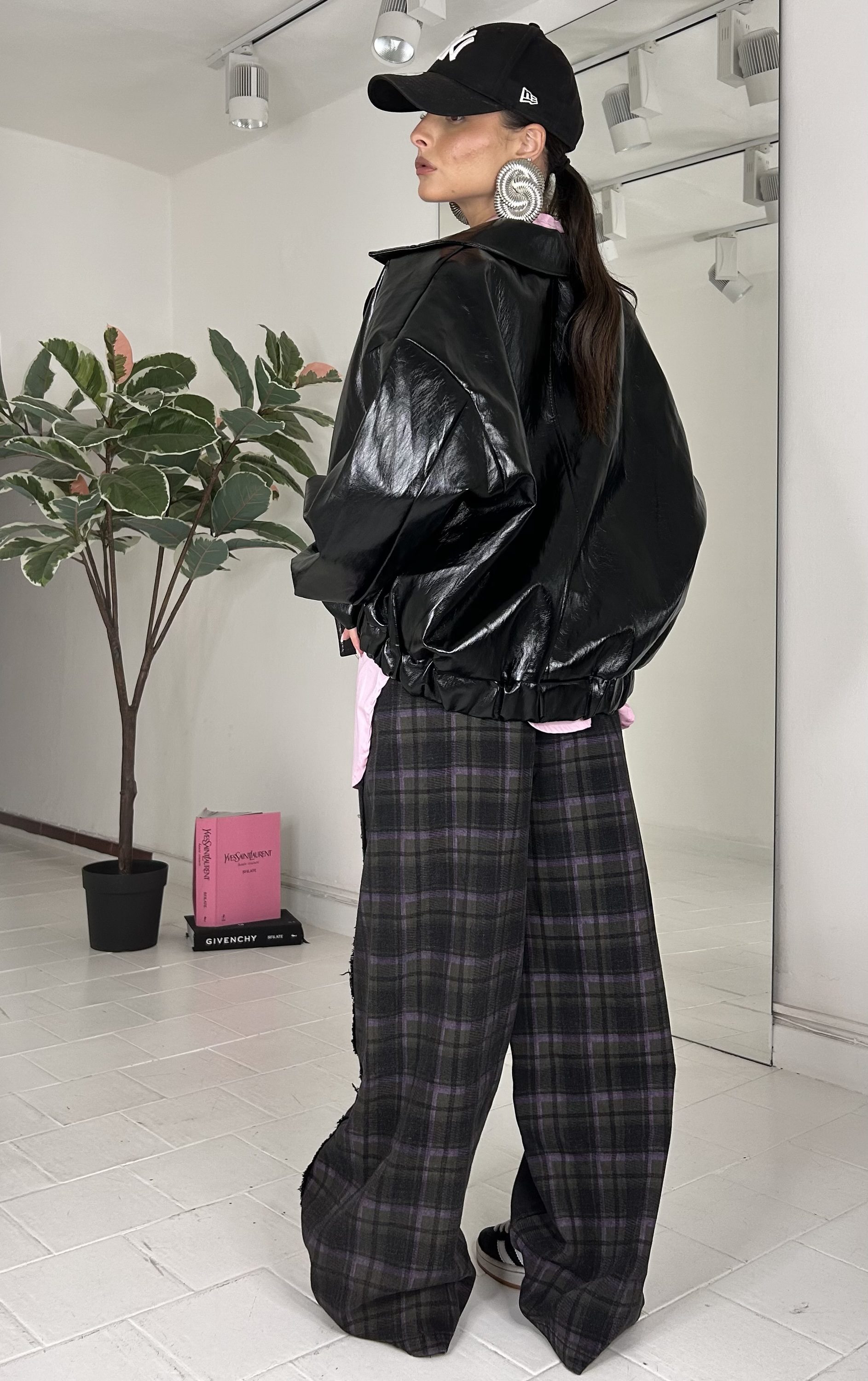 Consiglio da xs ad XL, in vinile, oversize, con elastico alla base, con zip. La modella รจ una taglia S