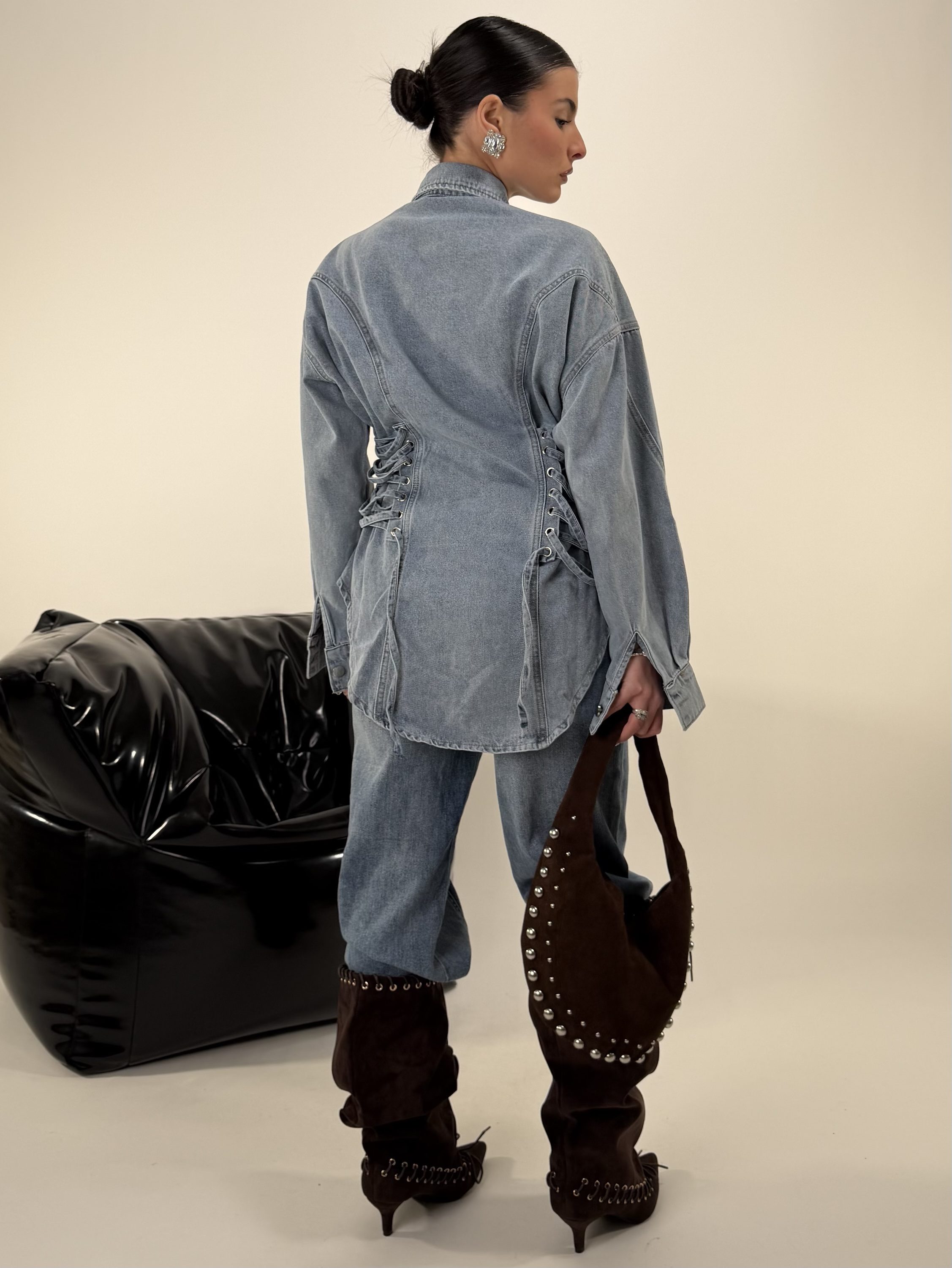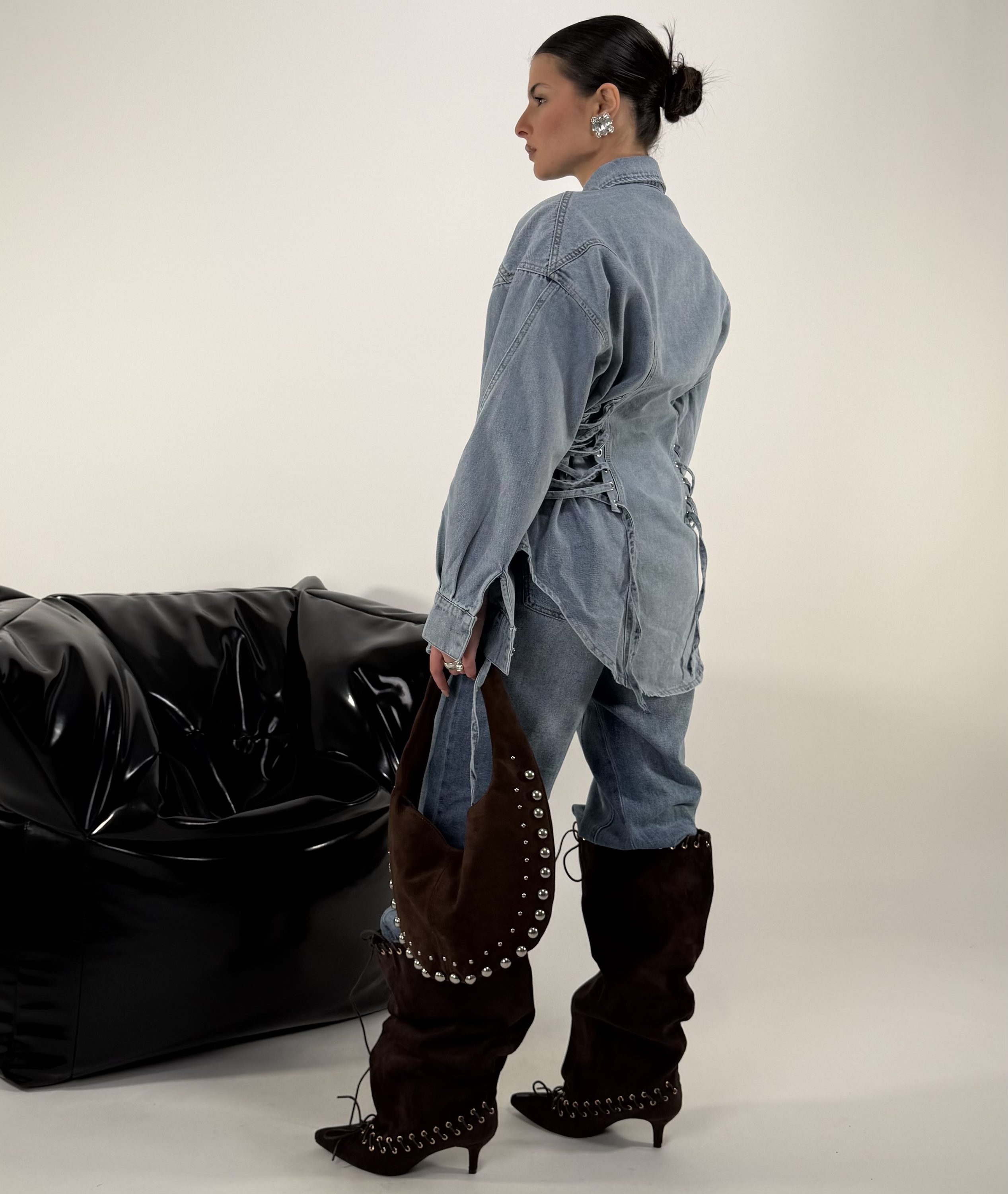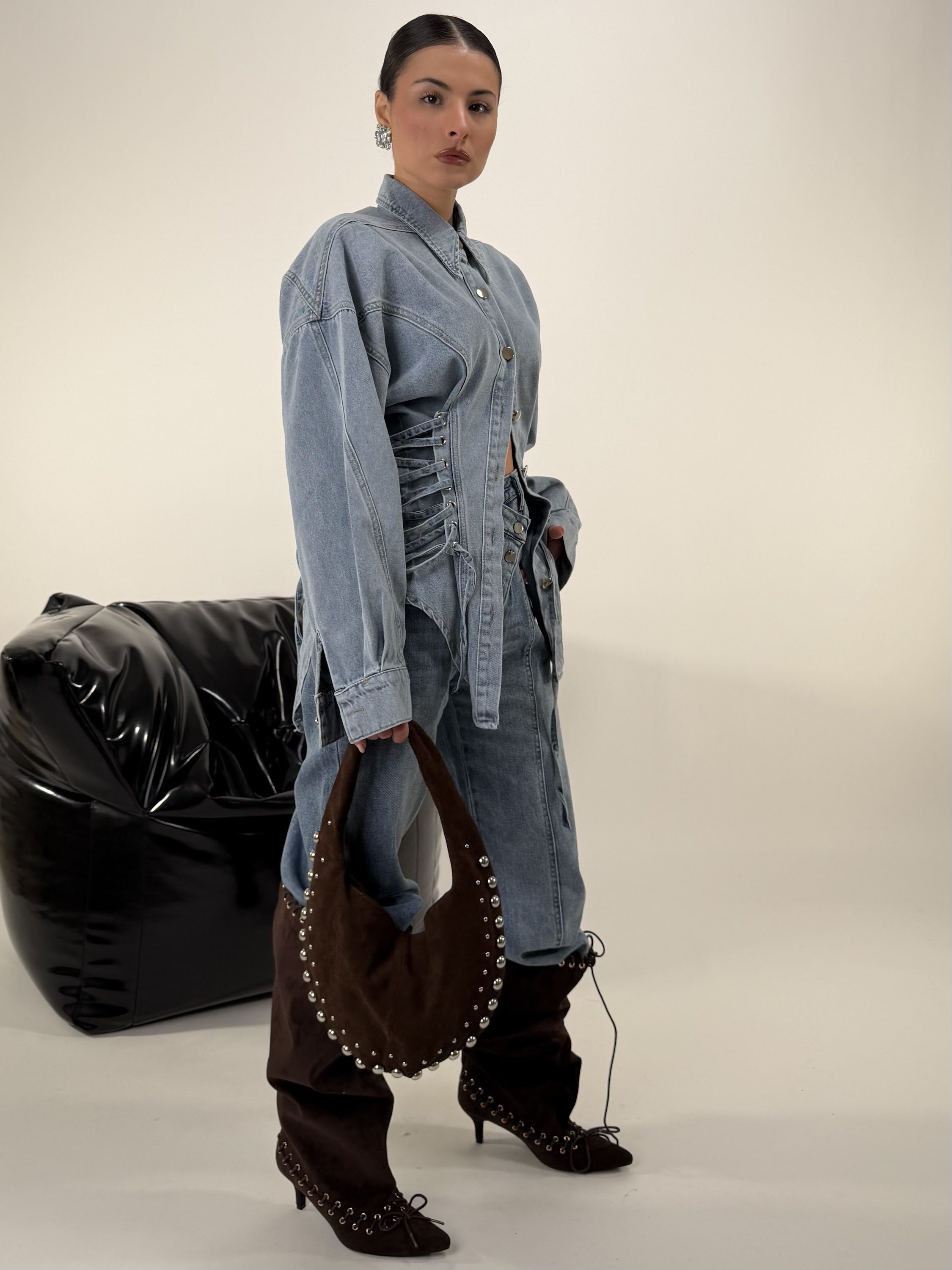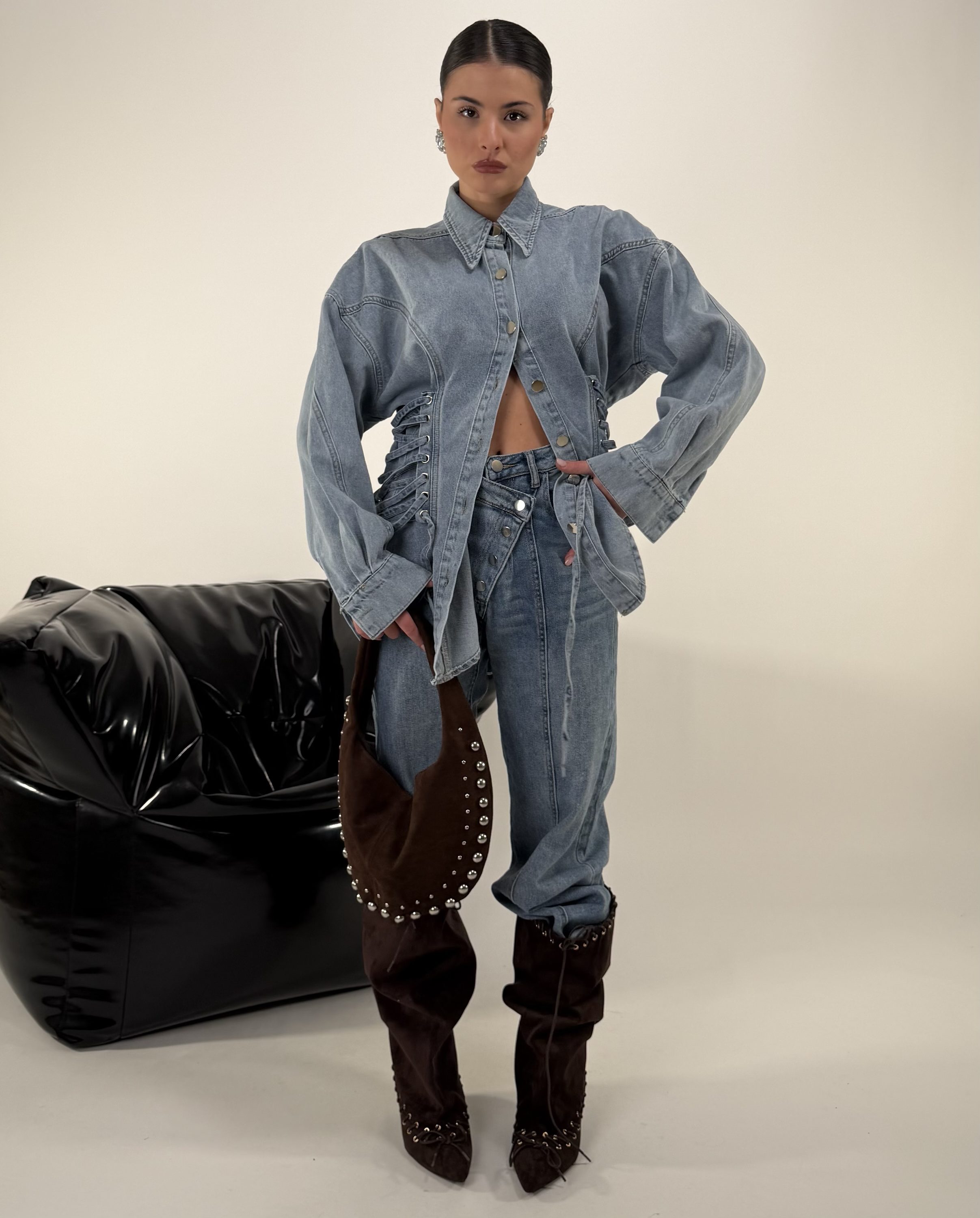 Consiglio da xs ad XL, regolabile, con bottoni. La modella è una taglia S ed è alta 1.60cm