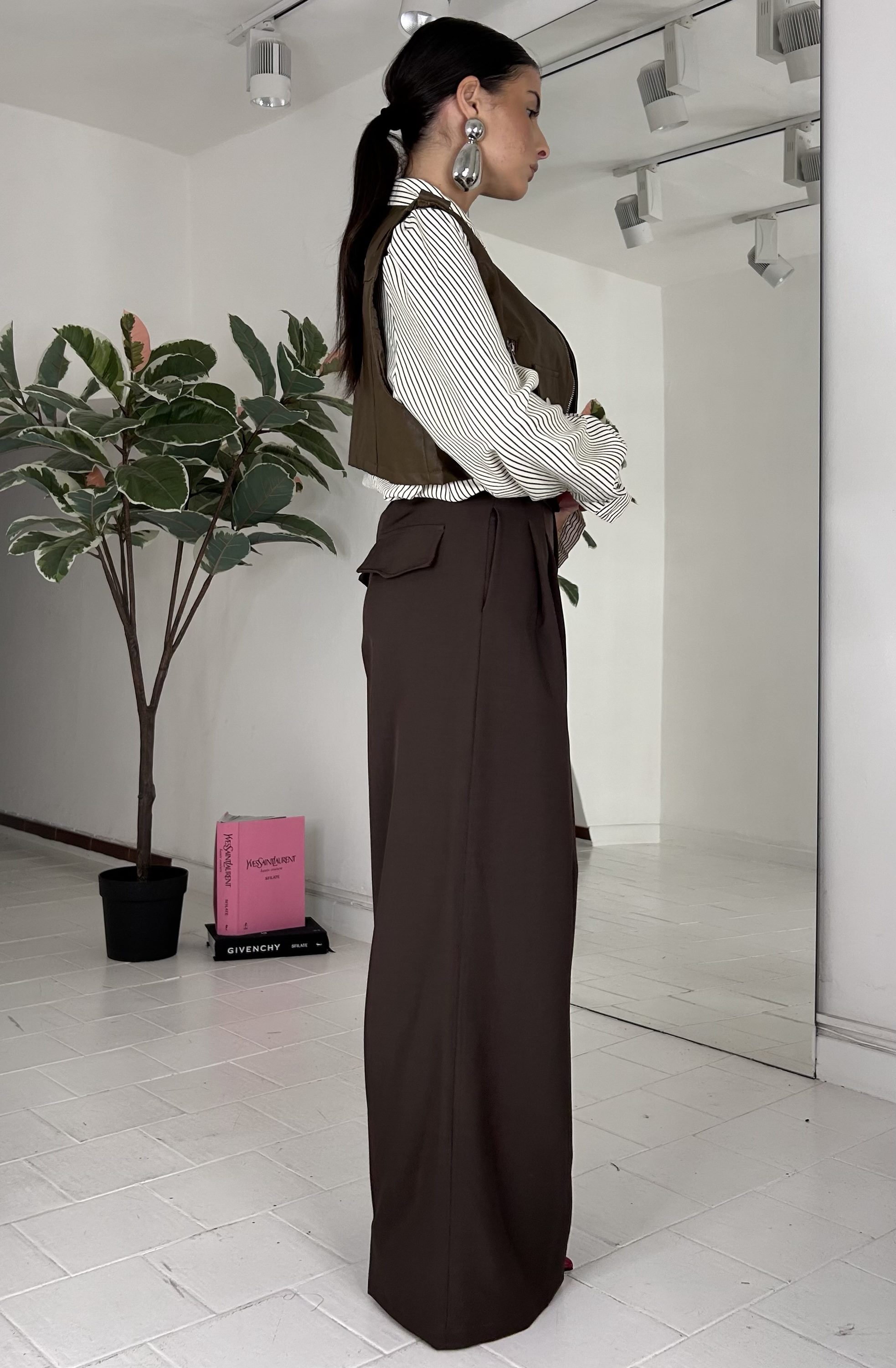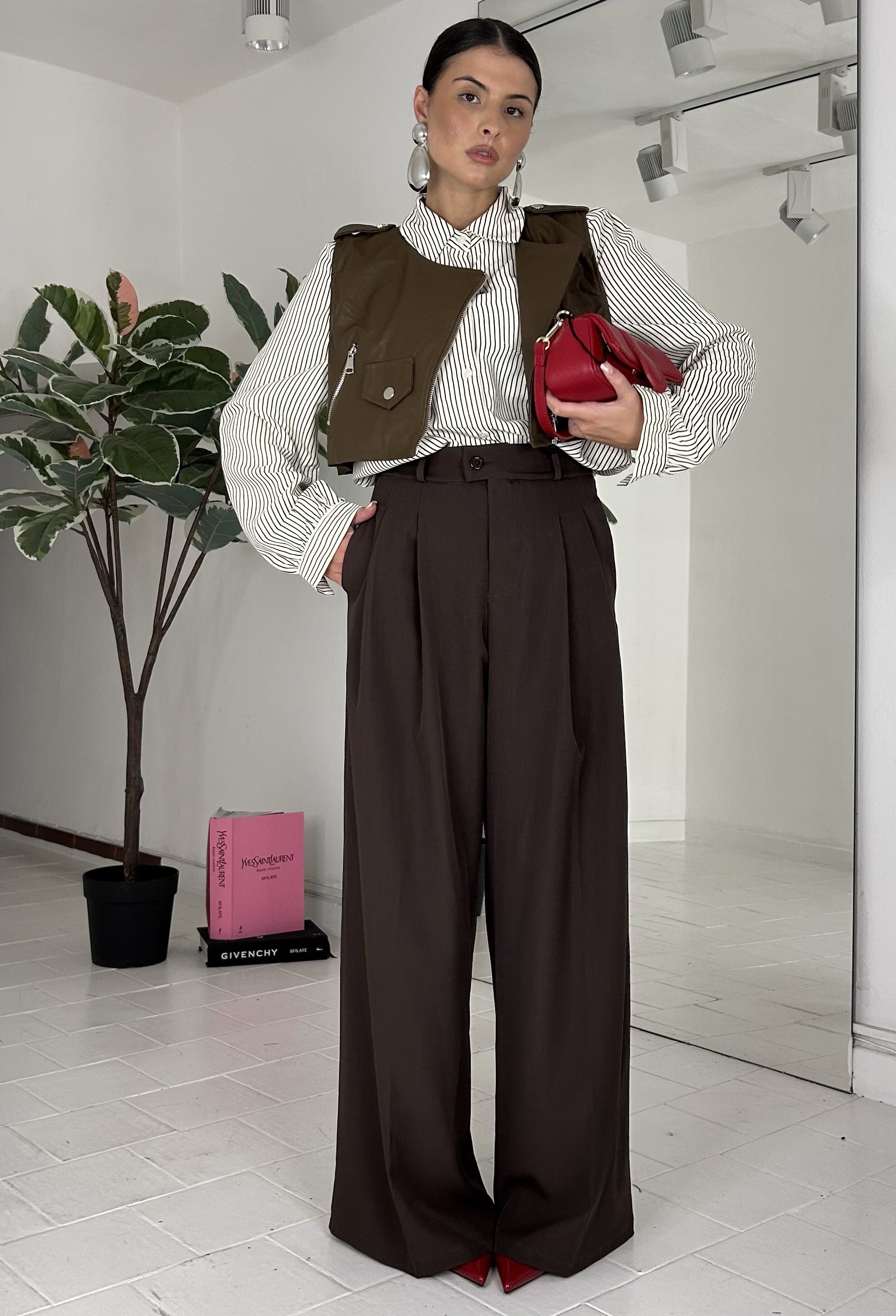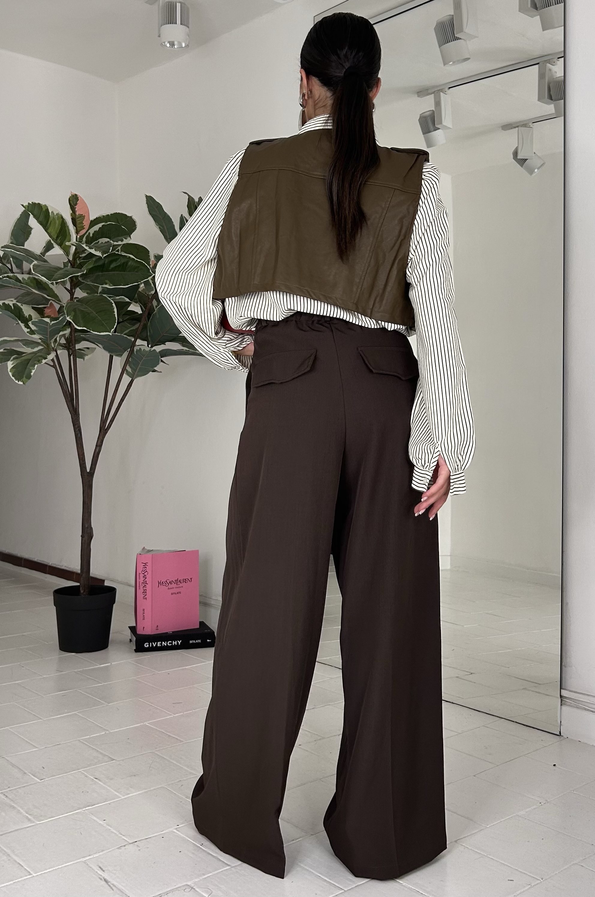 Coordinato scomponibile, gilet in ecopelle, con cerniera, bottoni, foderato. Camicia over, con bottoni e taschino