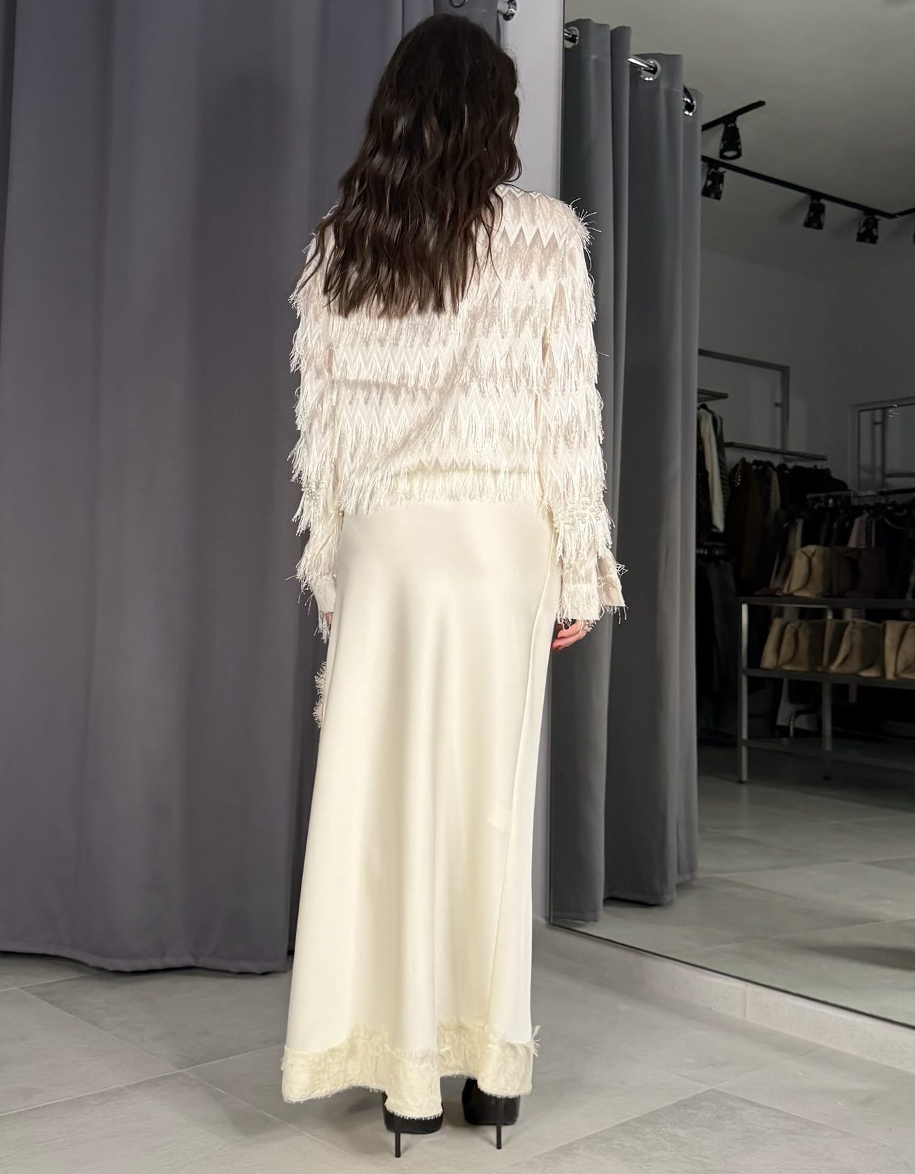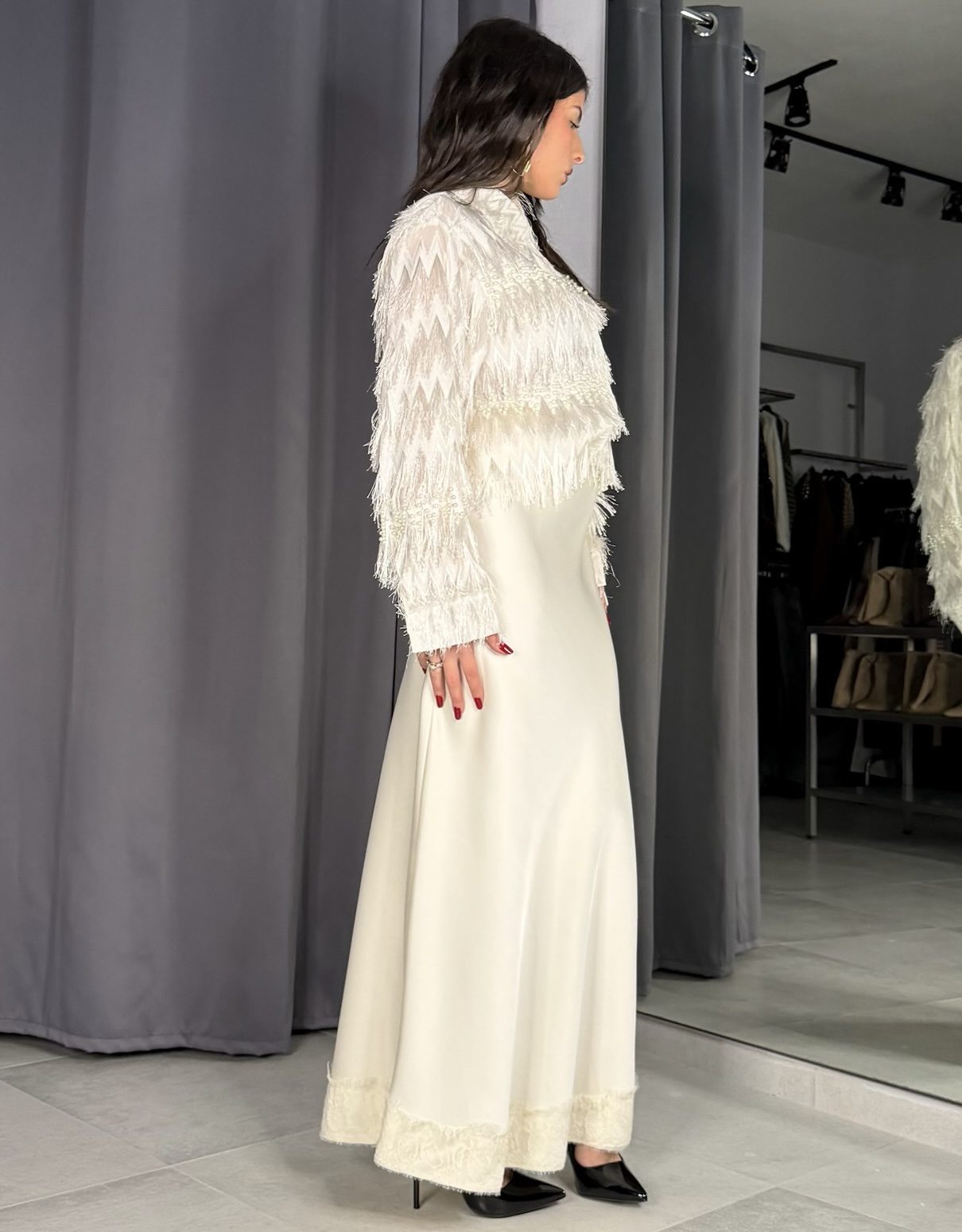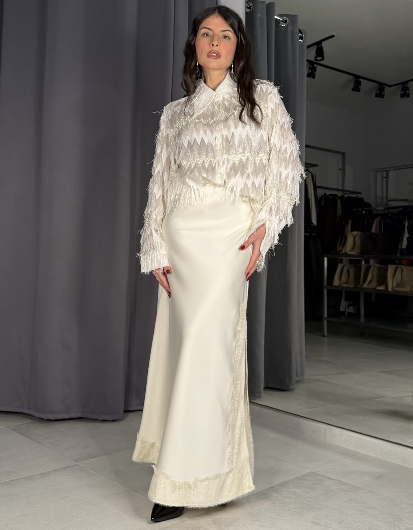 Consiglio da xs ad L, strutturata, Top Quality, dettaglio perla, leggero effetto in trasparenza. La modella รจ una taglia S ed รจ alta 1.60cm