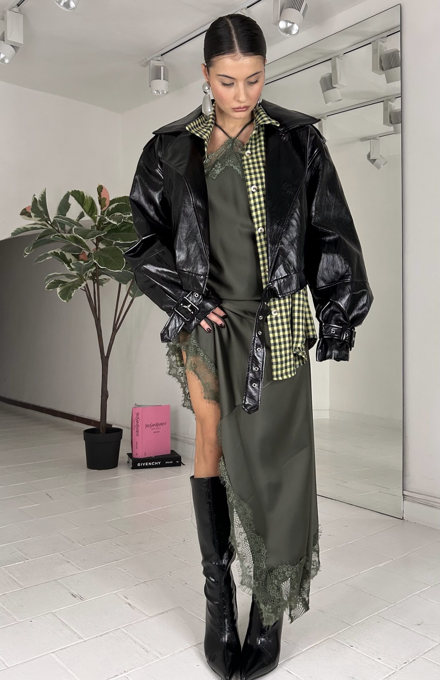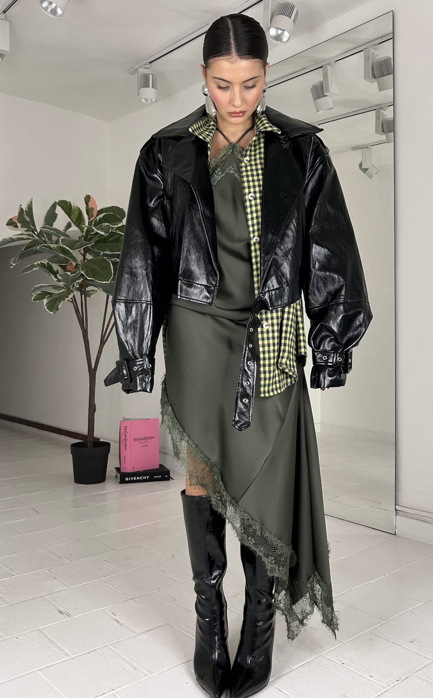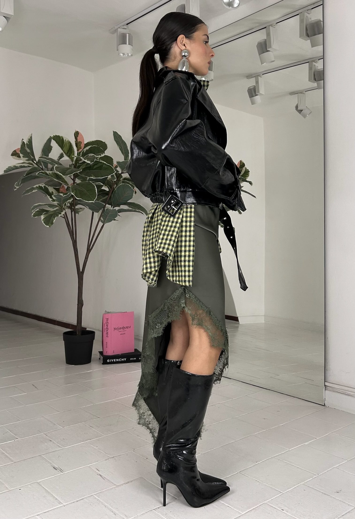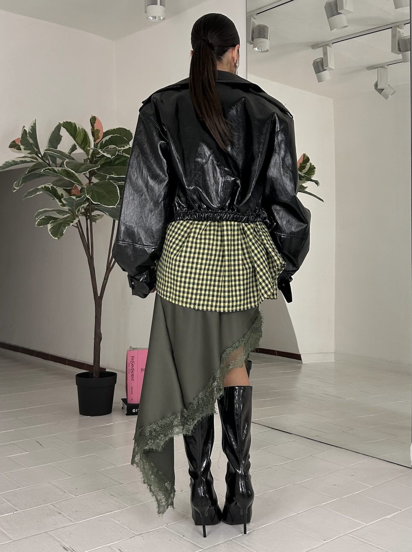 In ecopelle, consiglio da xs ad L, con elastico alla base, cintura, zip e tasche. La modella รจ una taglia S