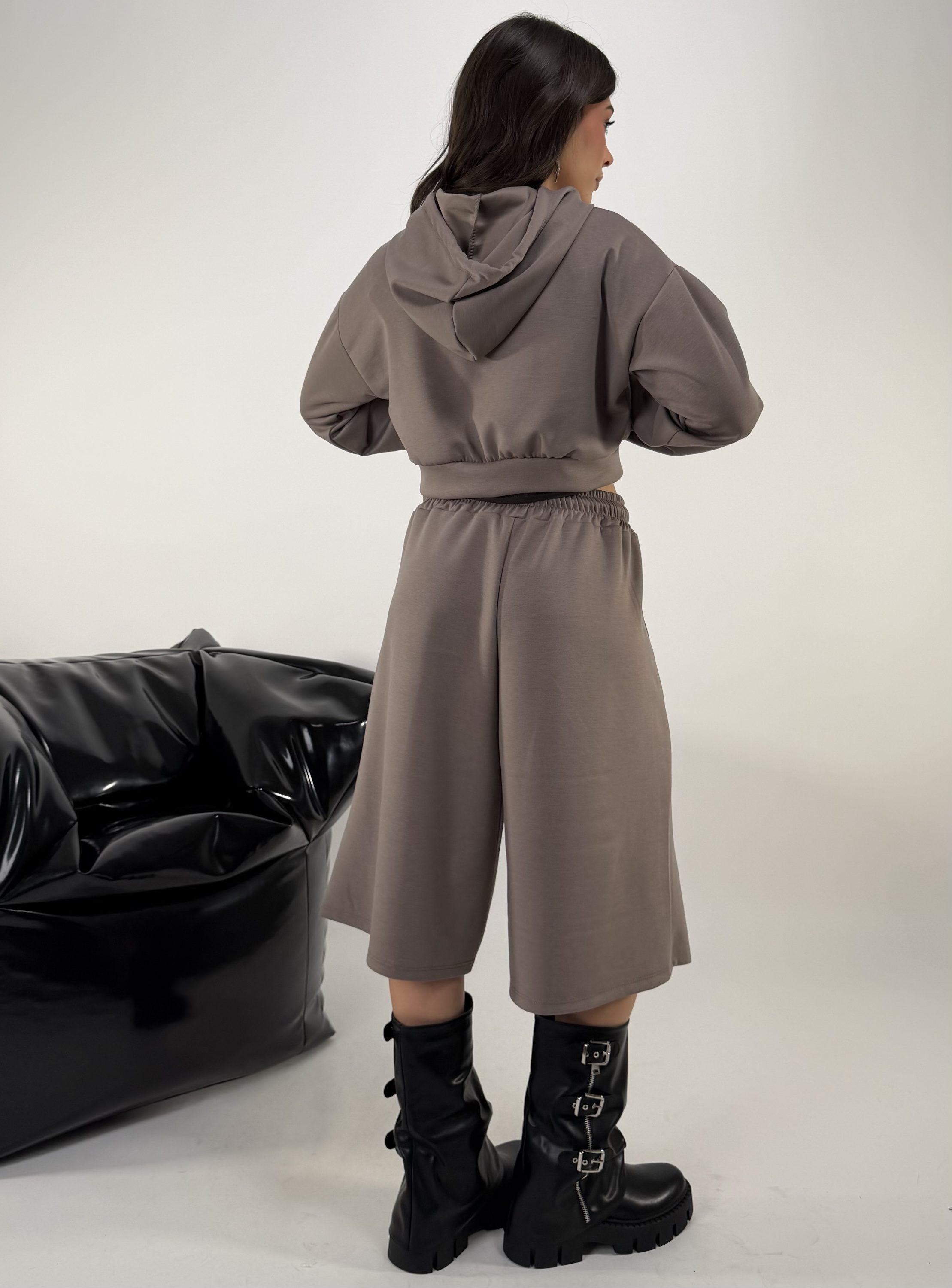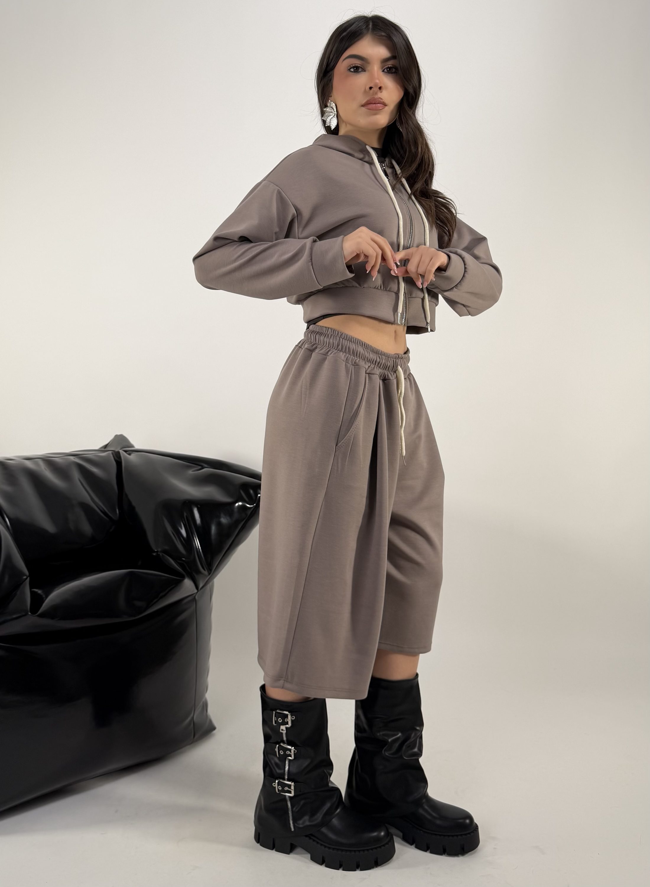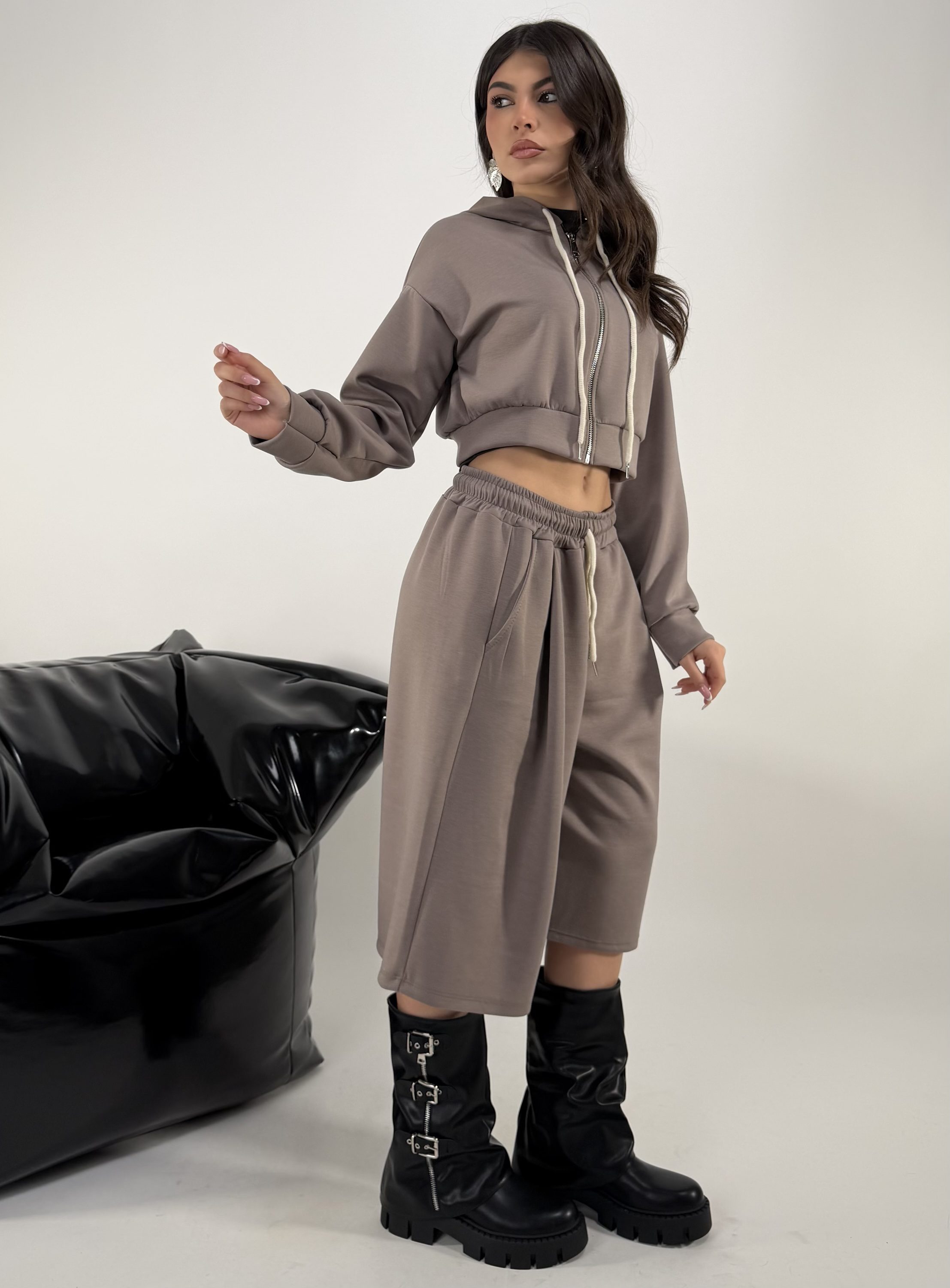 Consiglio da xs ad XL. Pantalone con elastico in vita e tasche. Felpa con zip e cappuccio. La modella รจ una taglia S ed รจ alta 1.65cm