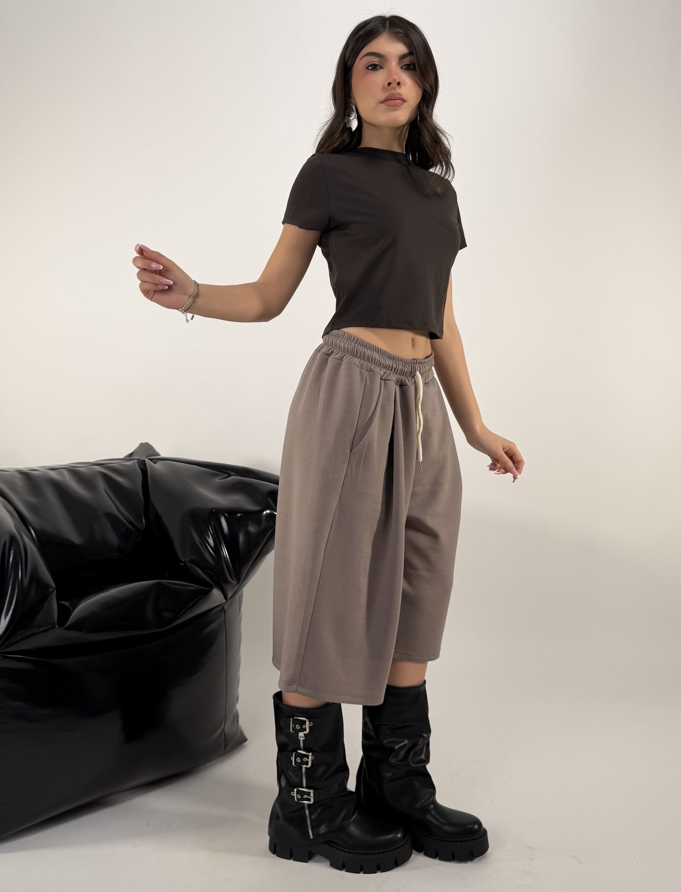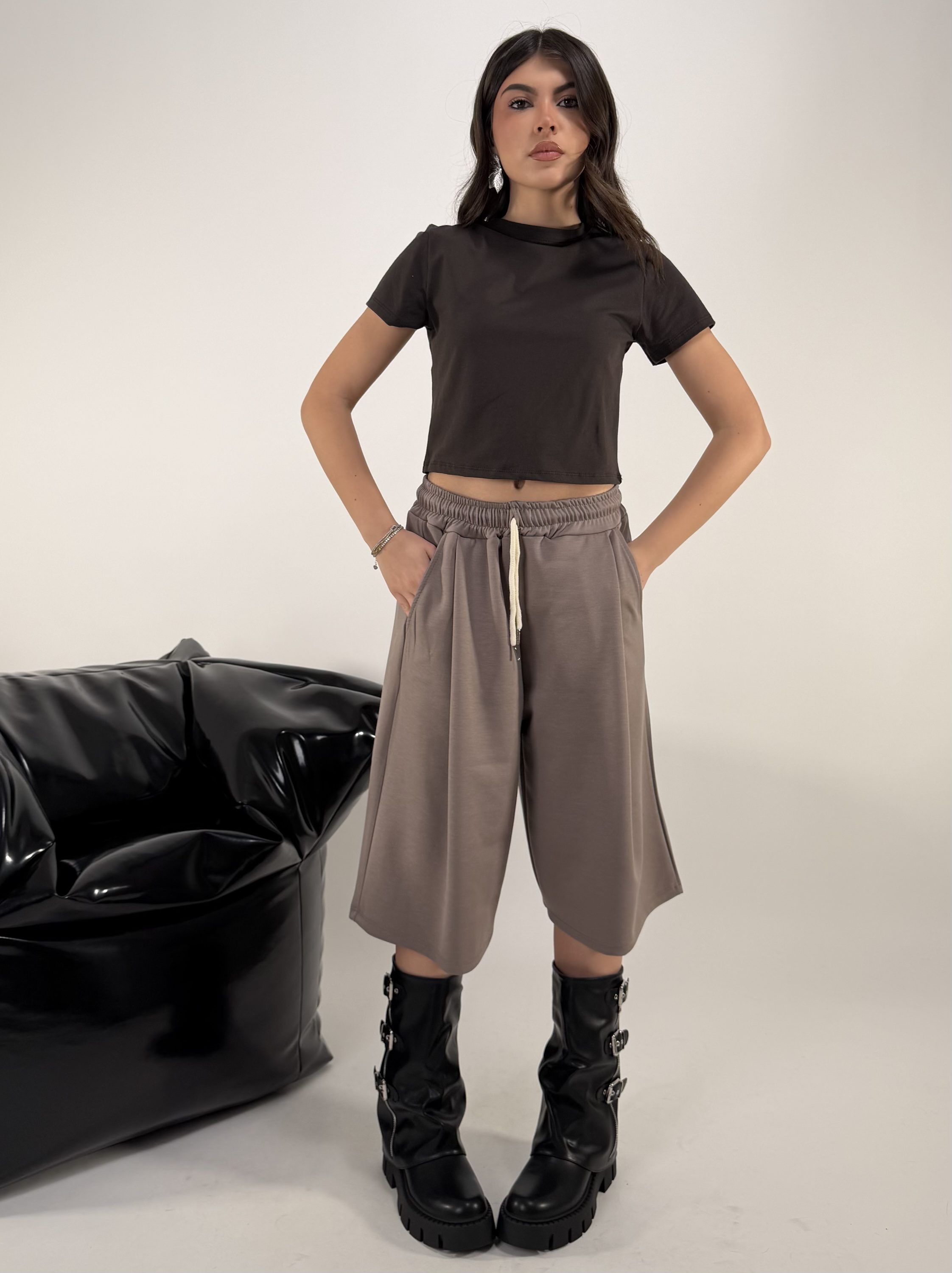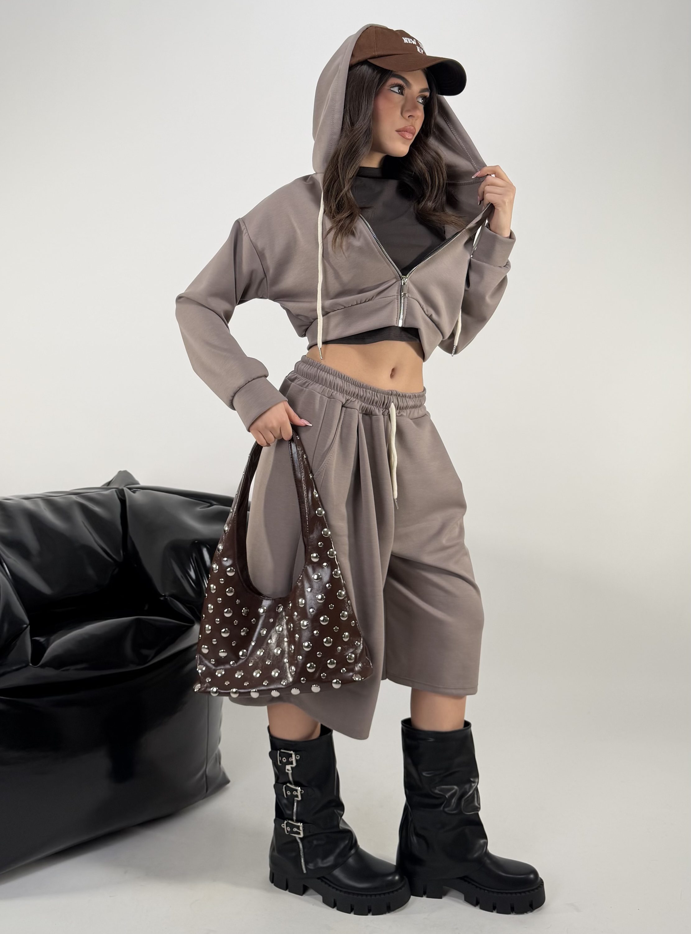 Consiglio da xs ad XL. Pantalone con elastico in vita e tasche. Felpa con zip e cappuccio. La modella รจ una taglia S ed รจ alta 1.65cm