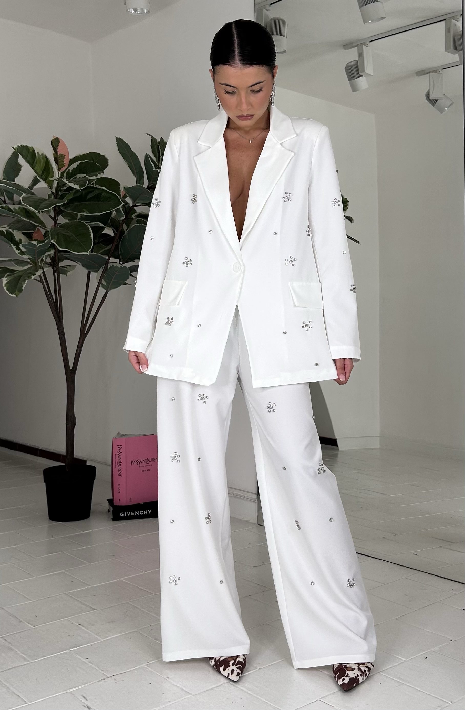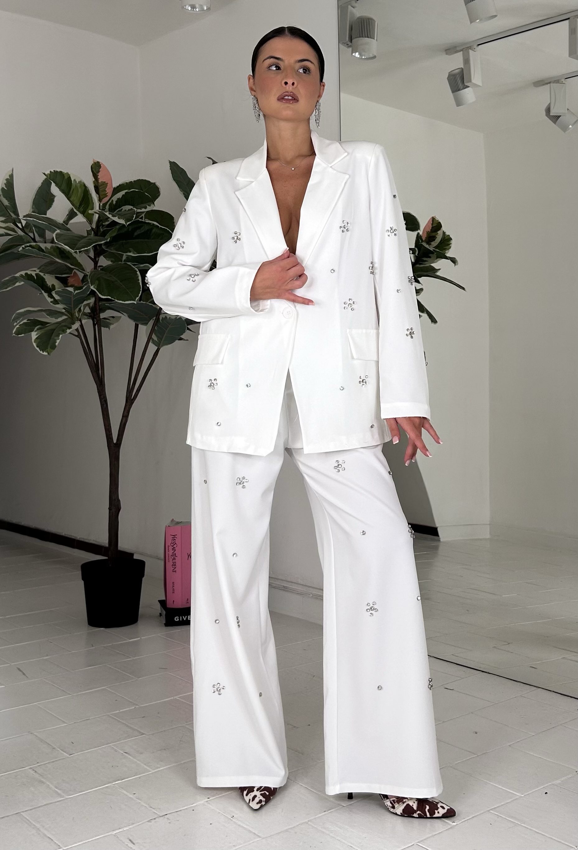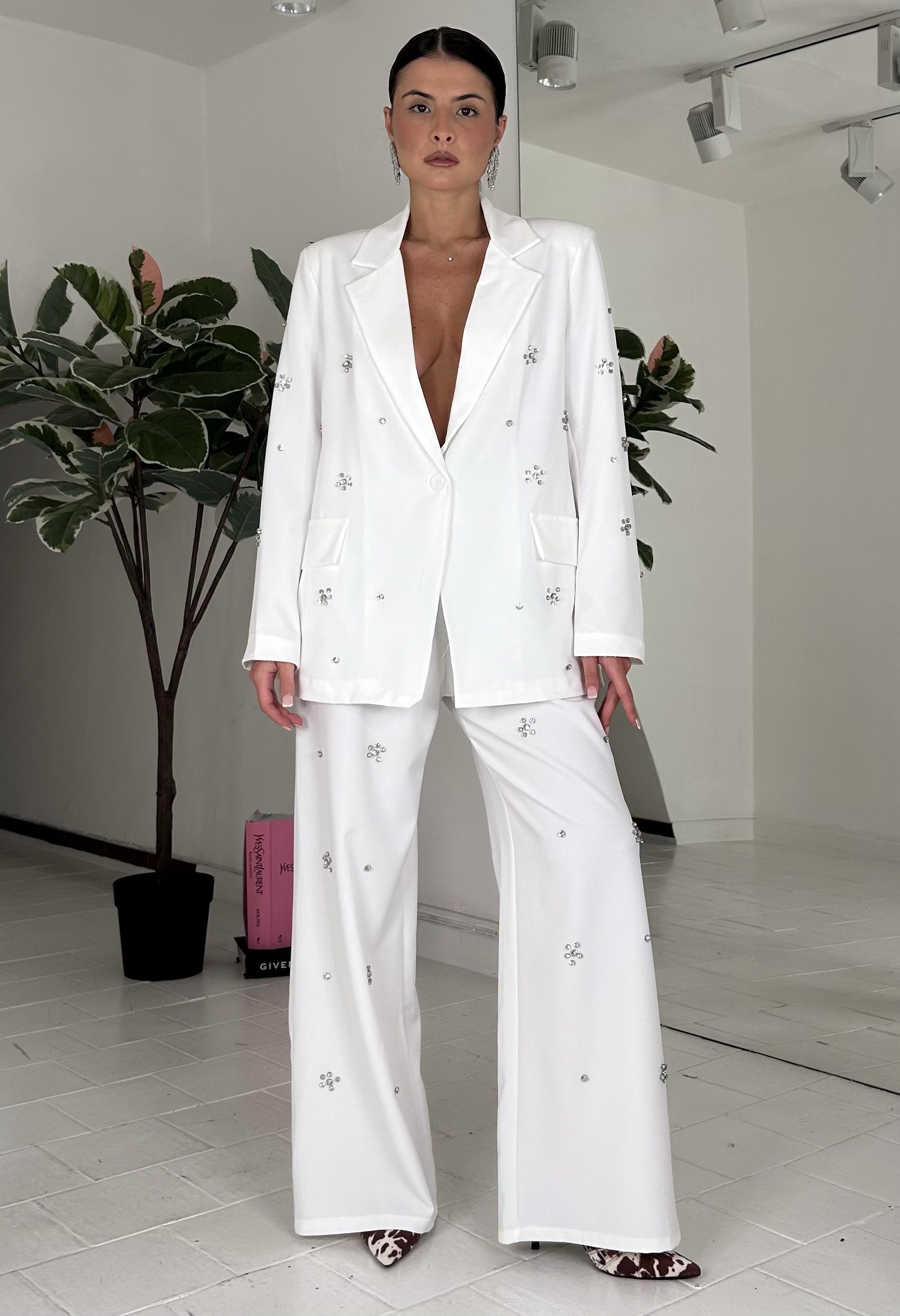 Consiglio da xs ad L. Pantalone con elastico in vita, tasche e passanti. Blazer foderato, spallina rinforzata. La modella รจ una taglia S ed รจ alata 1.60cm