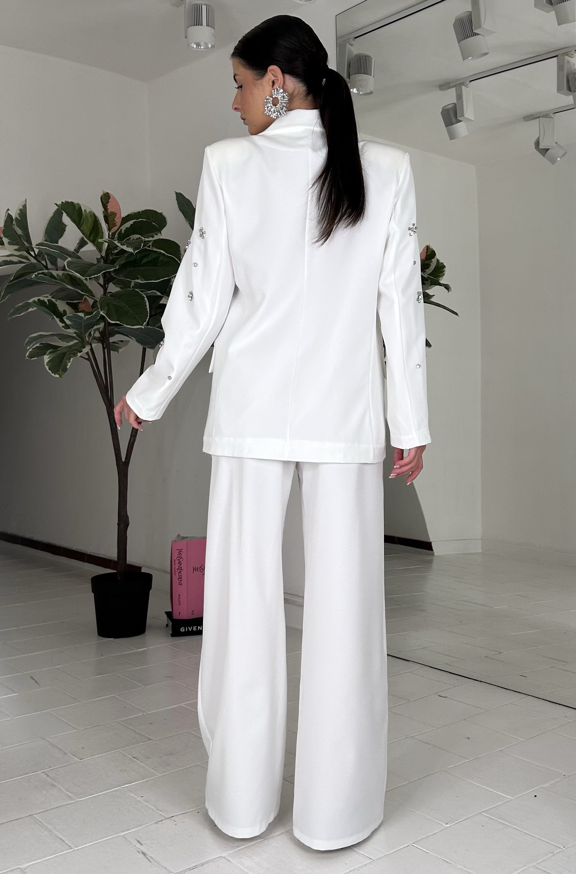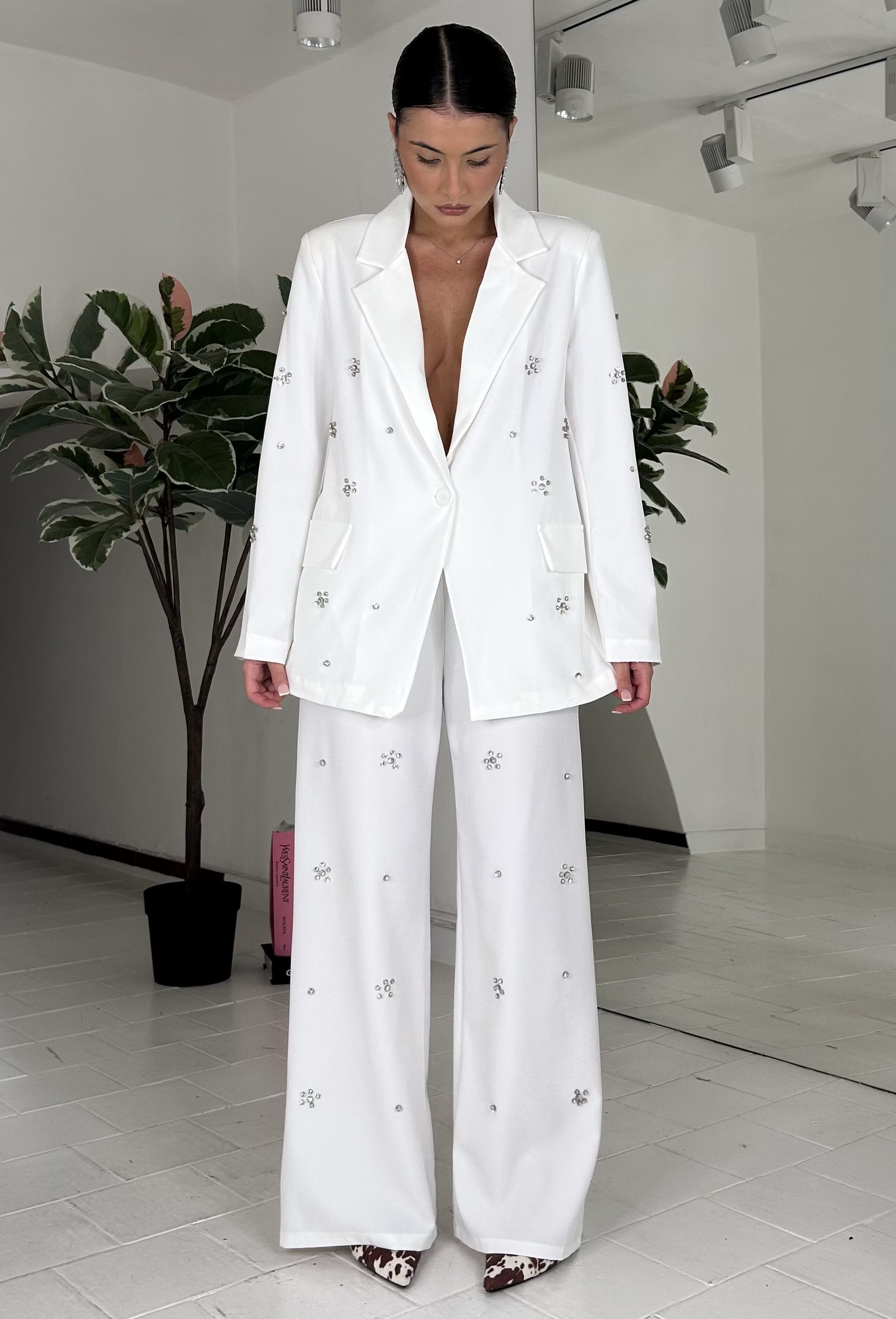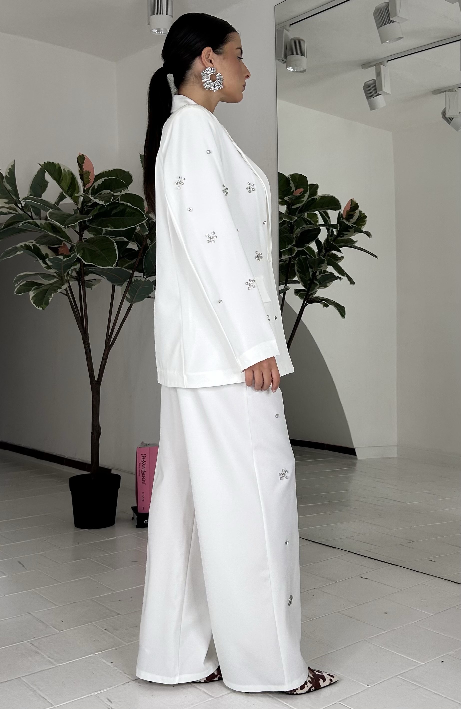 Consiglio da xs ad L. Pantalone con elastico in vita, tasche e passanti. Blazer foderato, spallina rinforzata. La modella รจ una taglia S ed รจ alata 1.60cm
