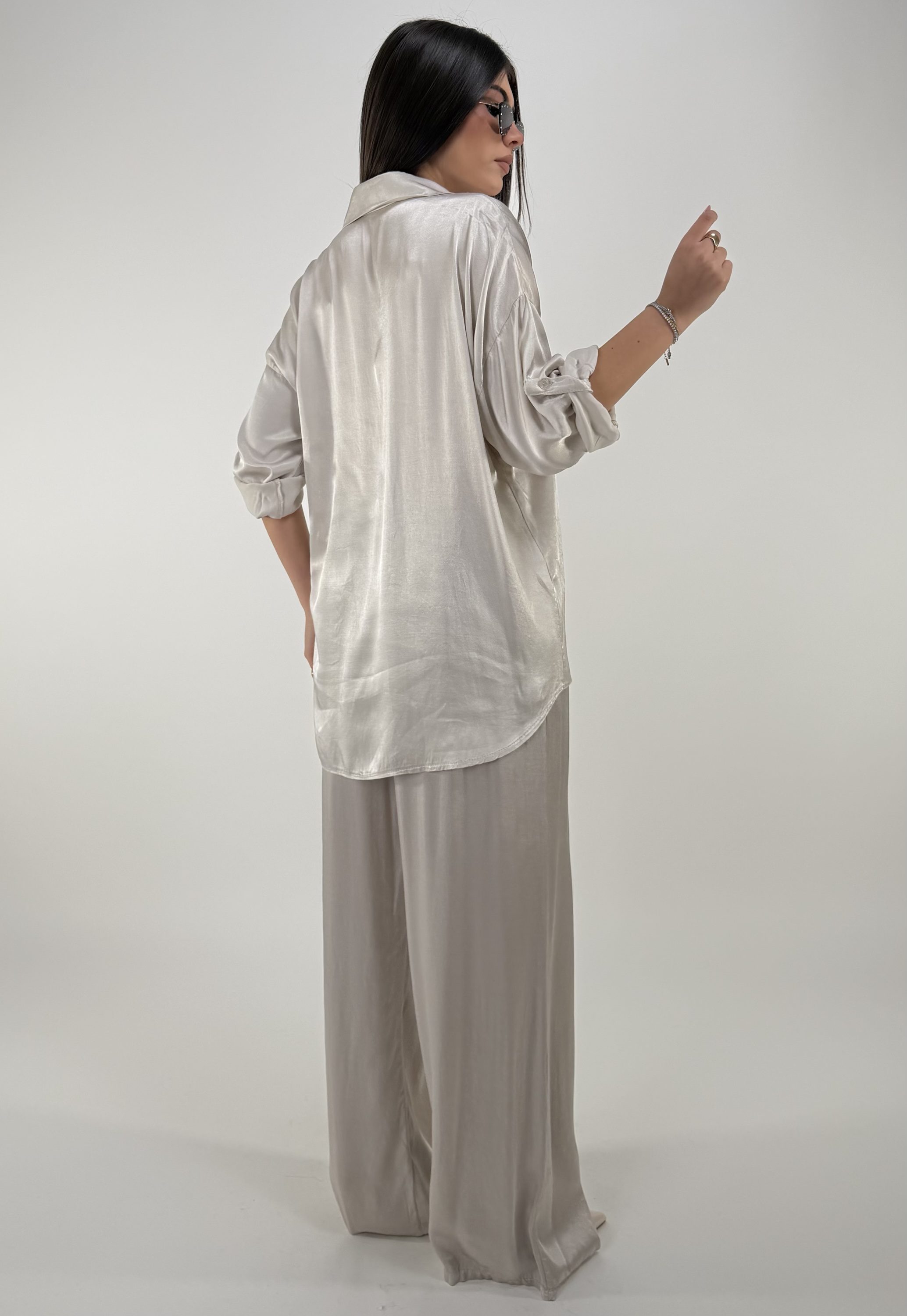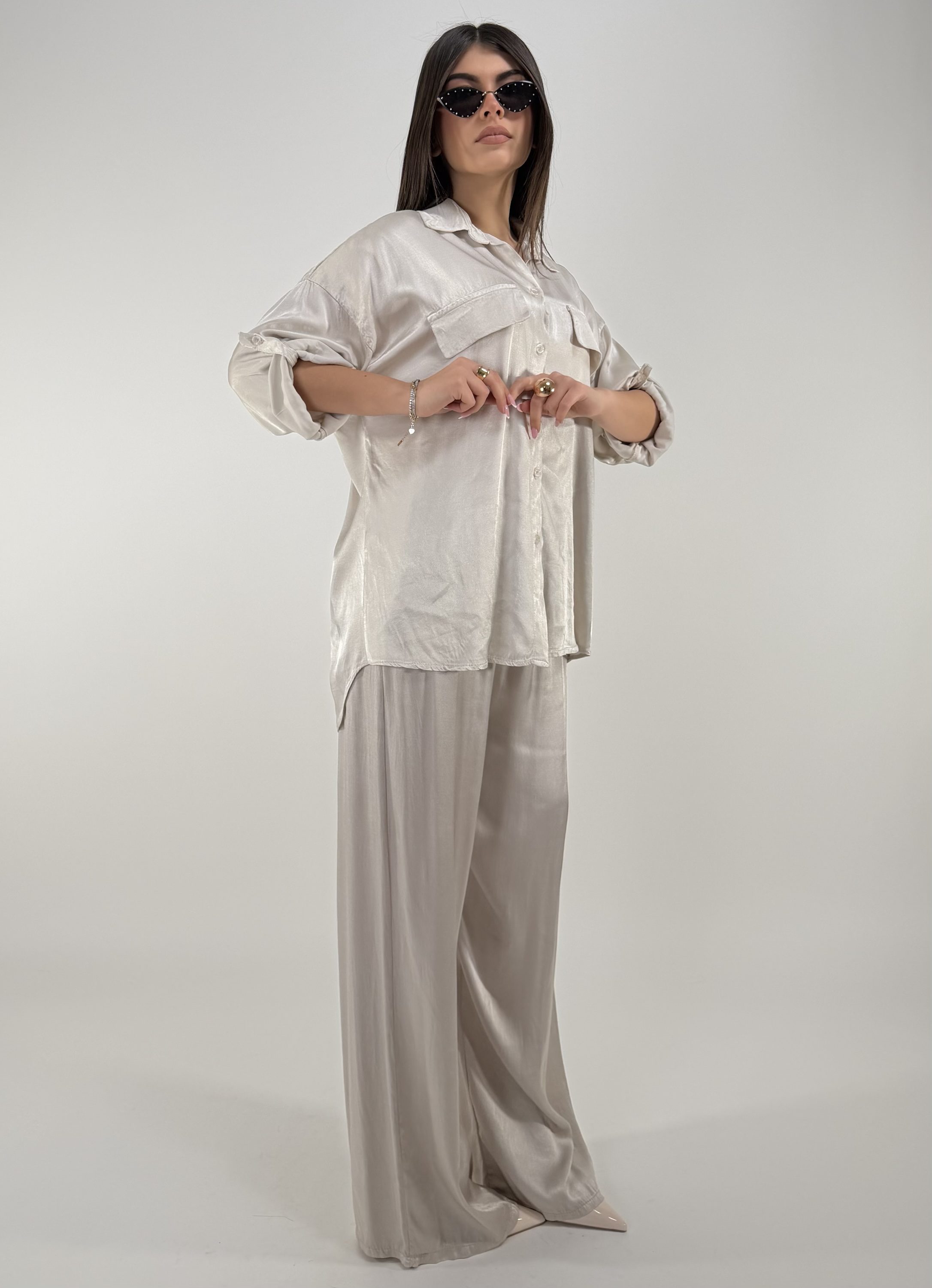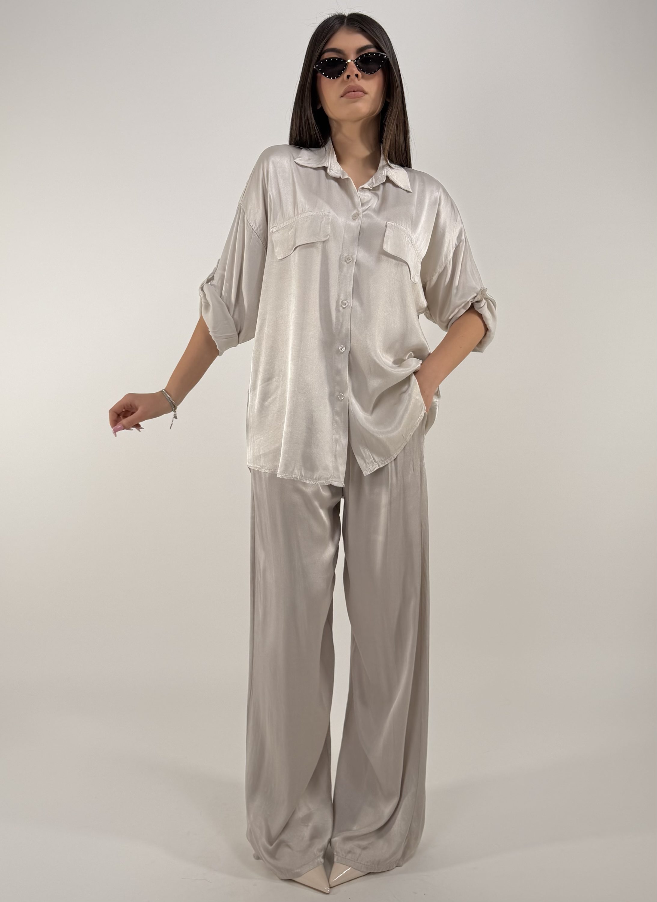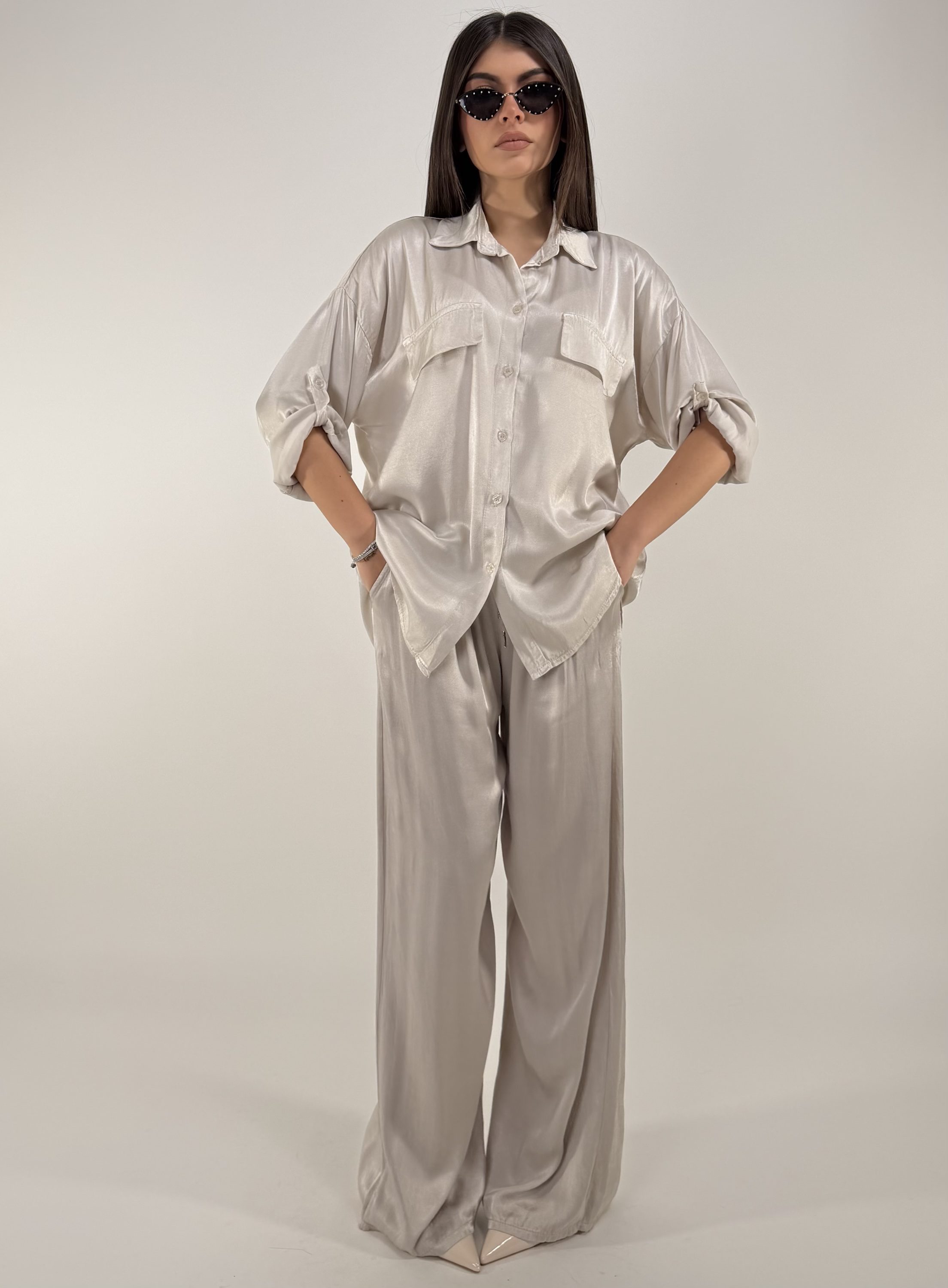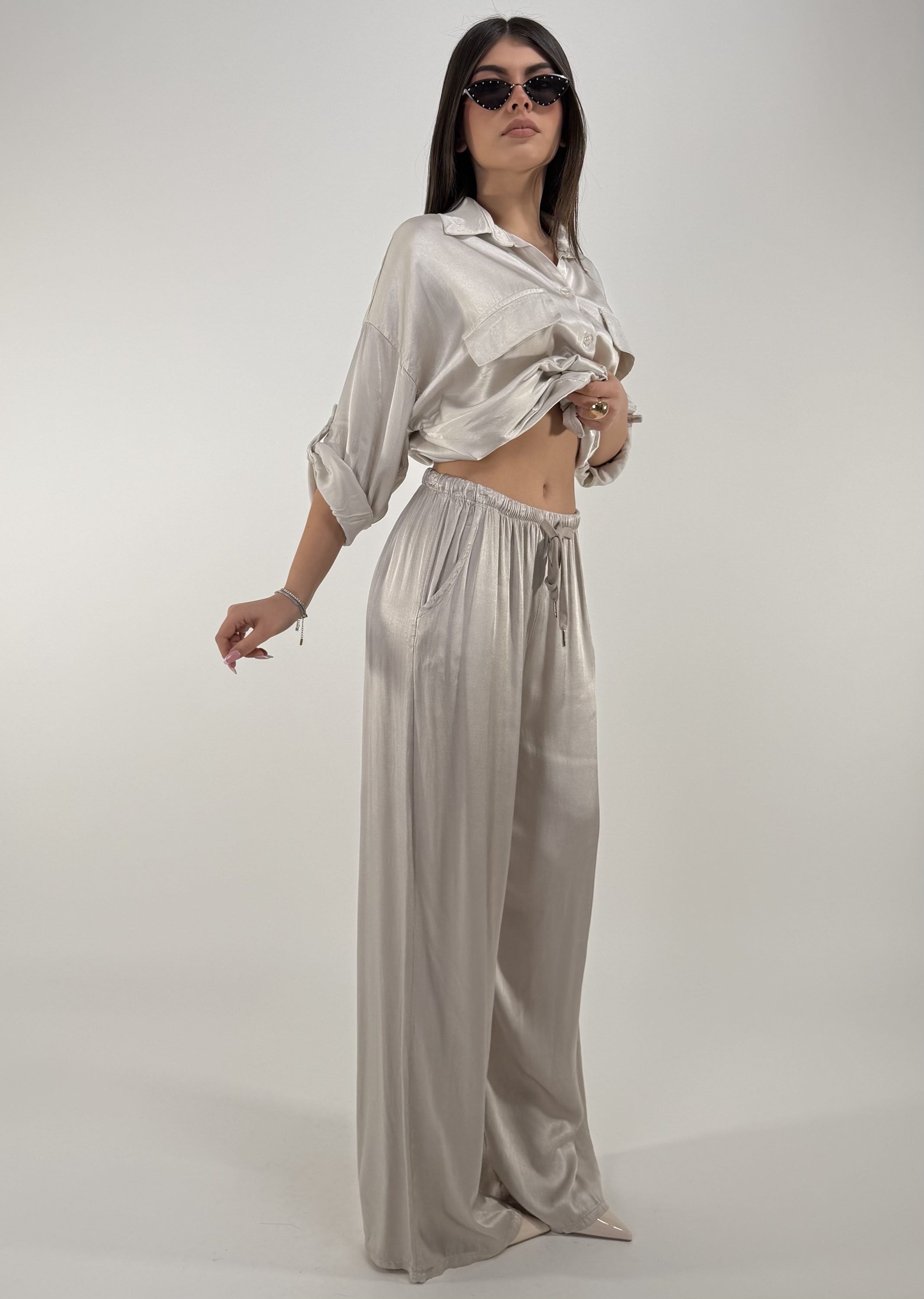 Consiglio da xs ad XL. Pantalone con elastico in vita, laccetto e tasche. Camicia con bottoni frontali e sulle maniche. La modella รจ una taglia S ed รจ alta 1.65cm