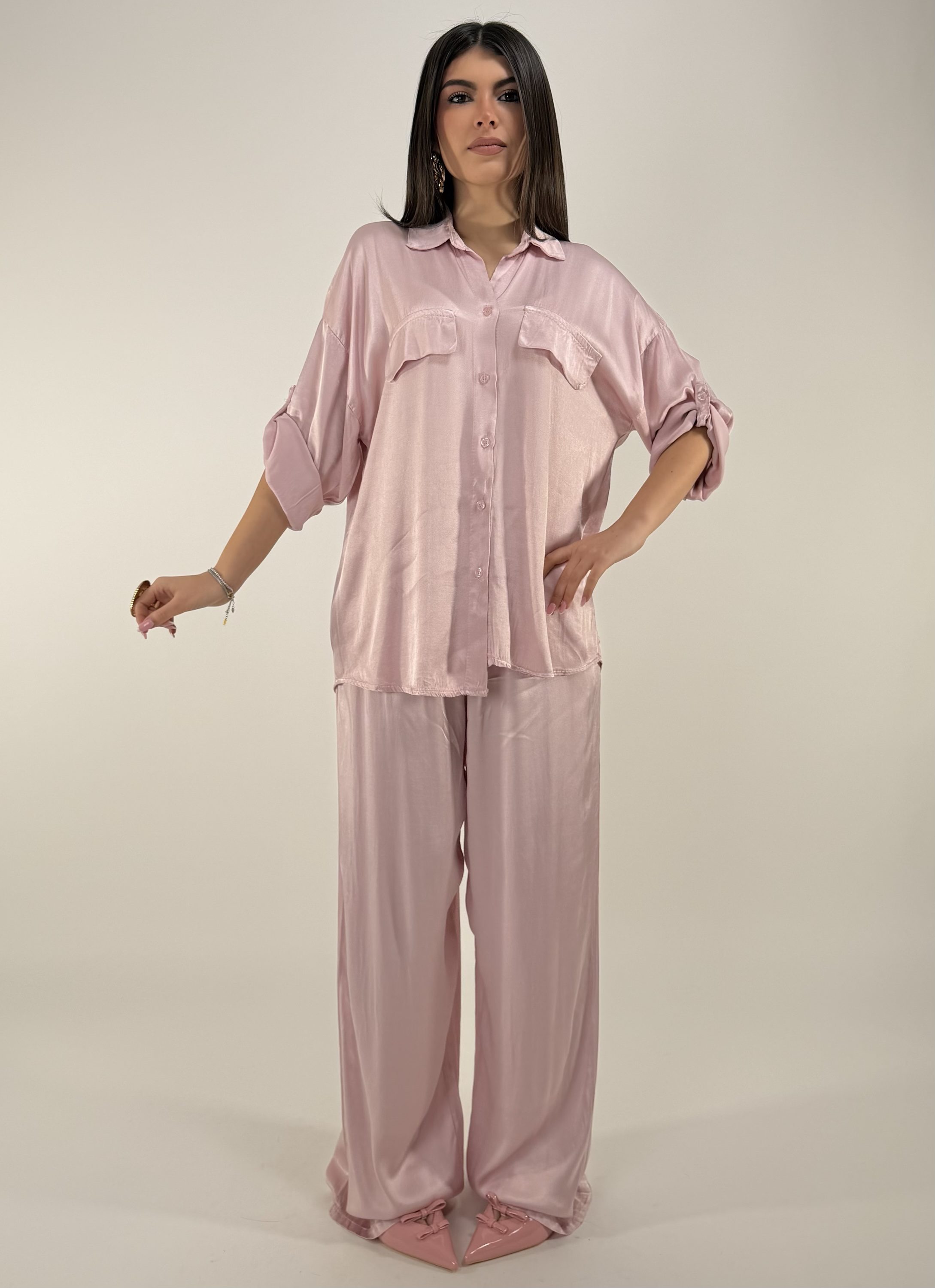 Consiglio da xs ad XL. Pantalone con elastico in vita, laccetto e tasche. Camicia con bottoni frontali e sulle maniche. La modella รจ una taglia S ed รจ alta 1.65cm