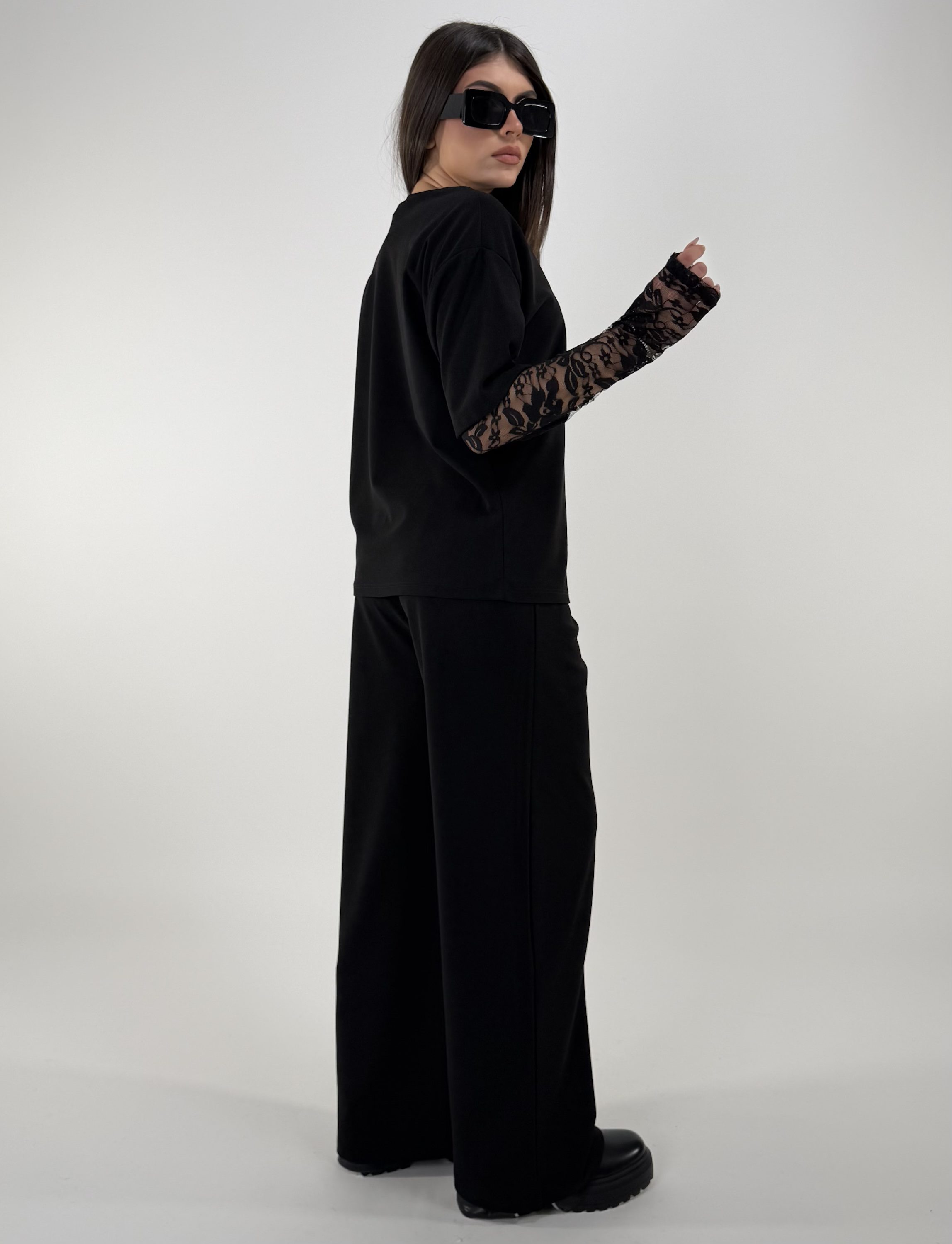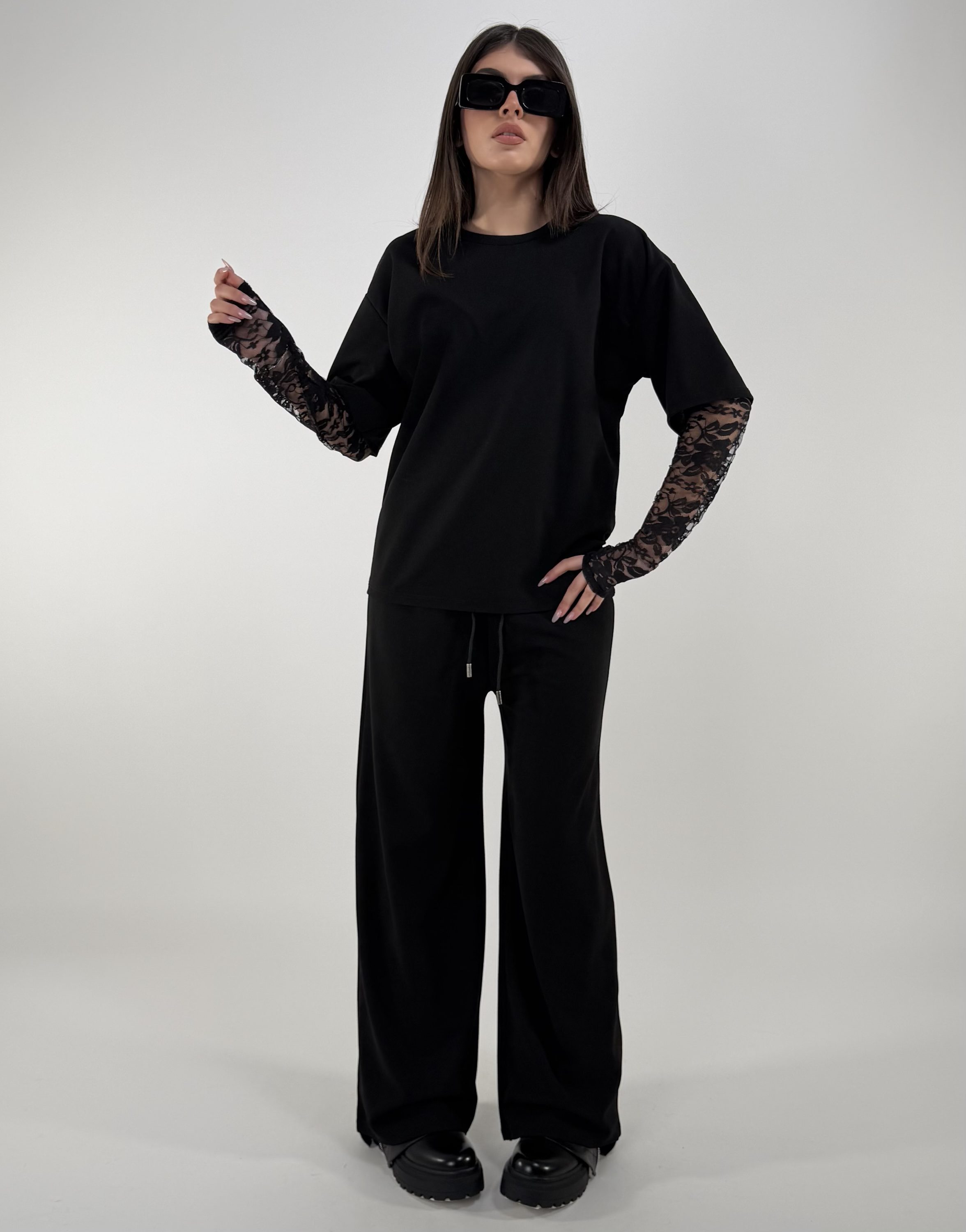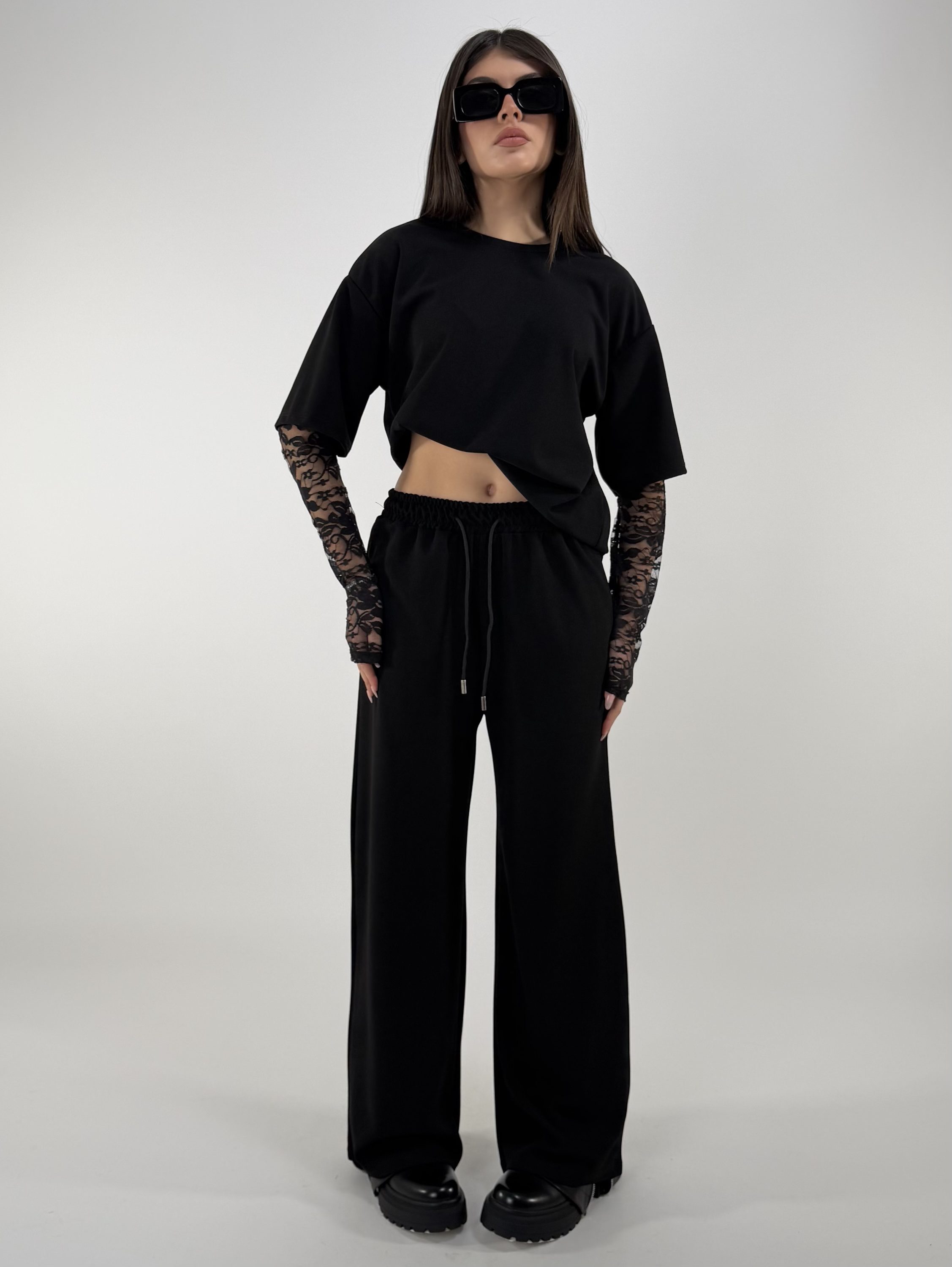 Consiglio da xs ad XL. Pantalone con laccetti, tasche, con elastico in vita. Maglia oversize, con maniche in pizzo. La modella è una taglia S ed è alta 1.65cm