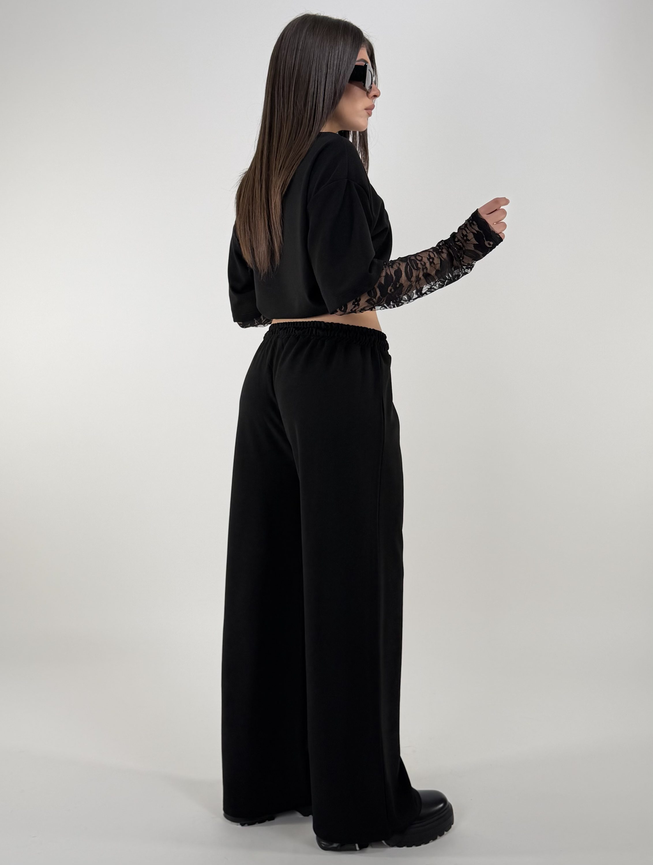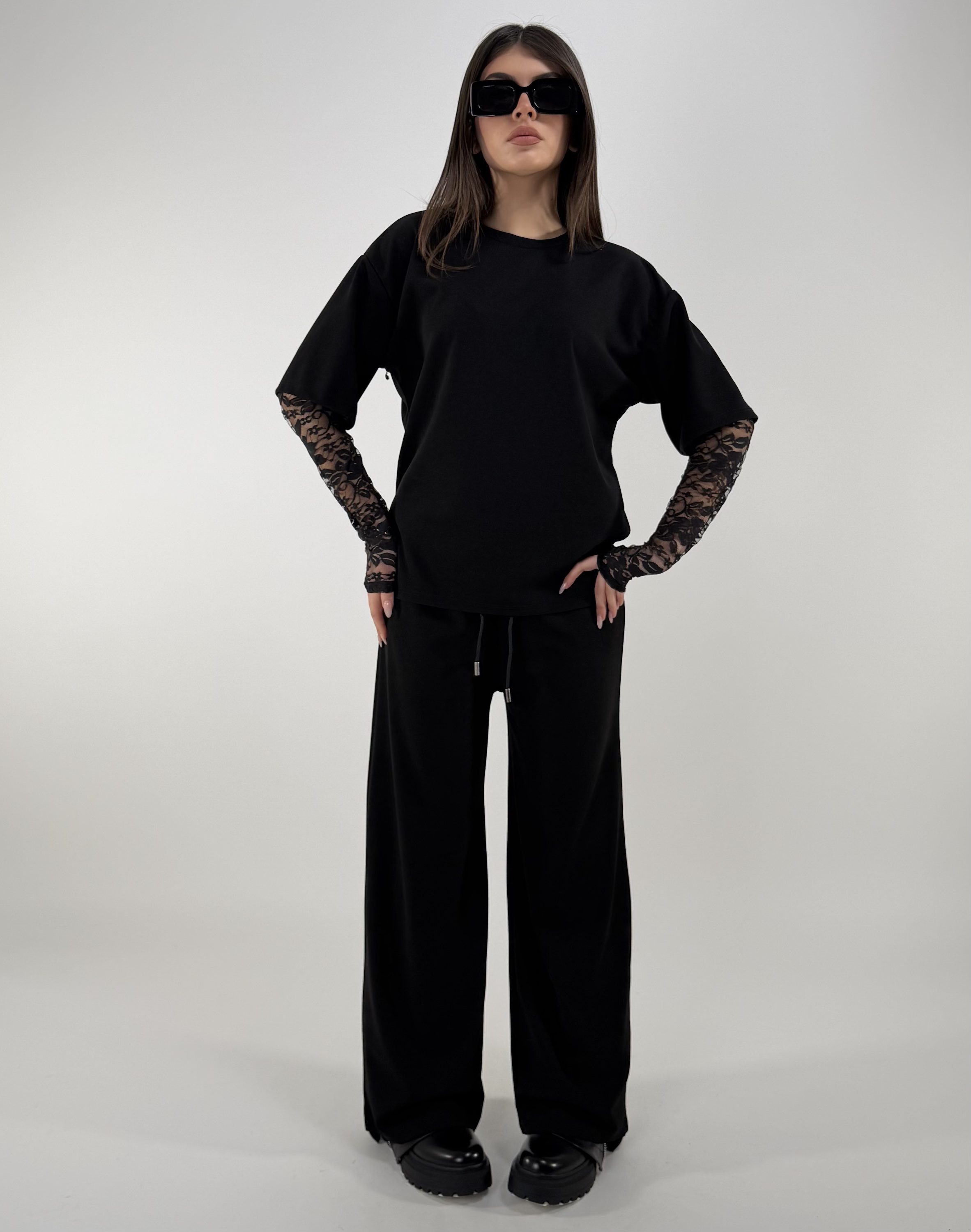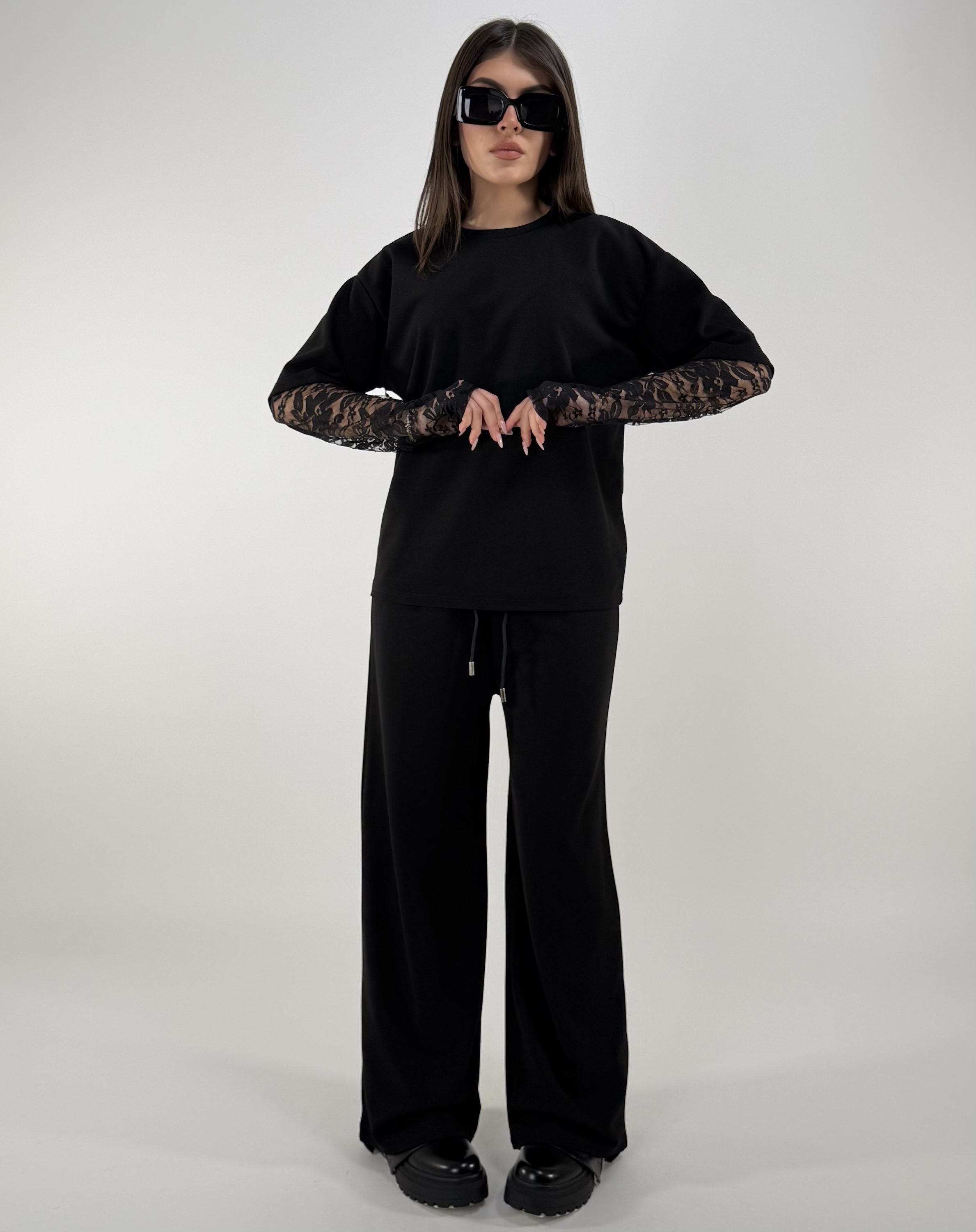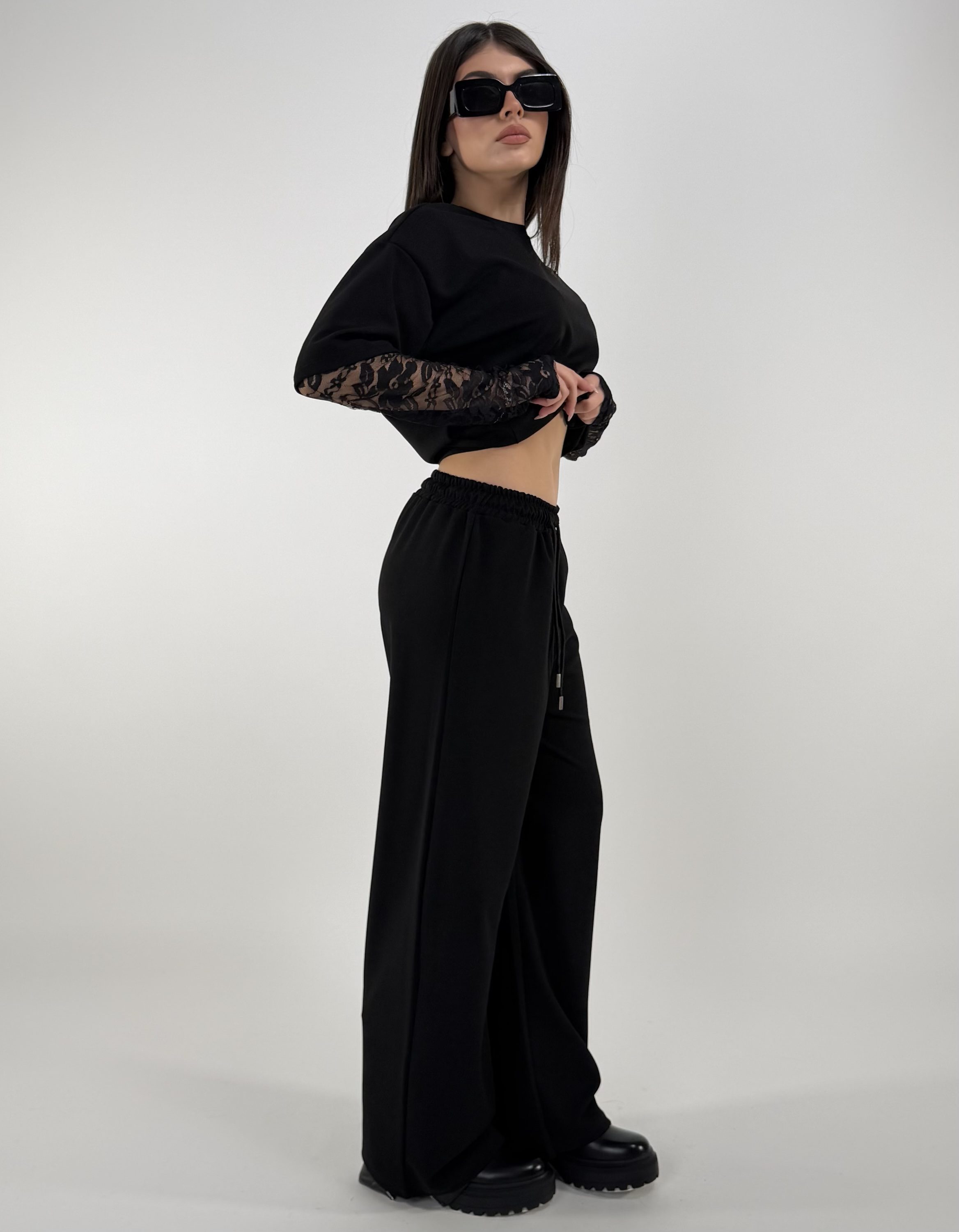 Consiglio da xs ad XL. Pantalone con laccetti, tasche, con elastico in vita. Maglia oversize, con maniche in pizzo. La modella è una taglia S ed è alta 1.65cm