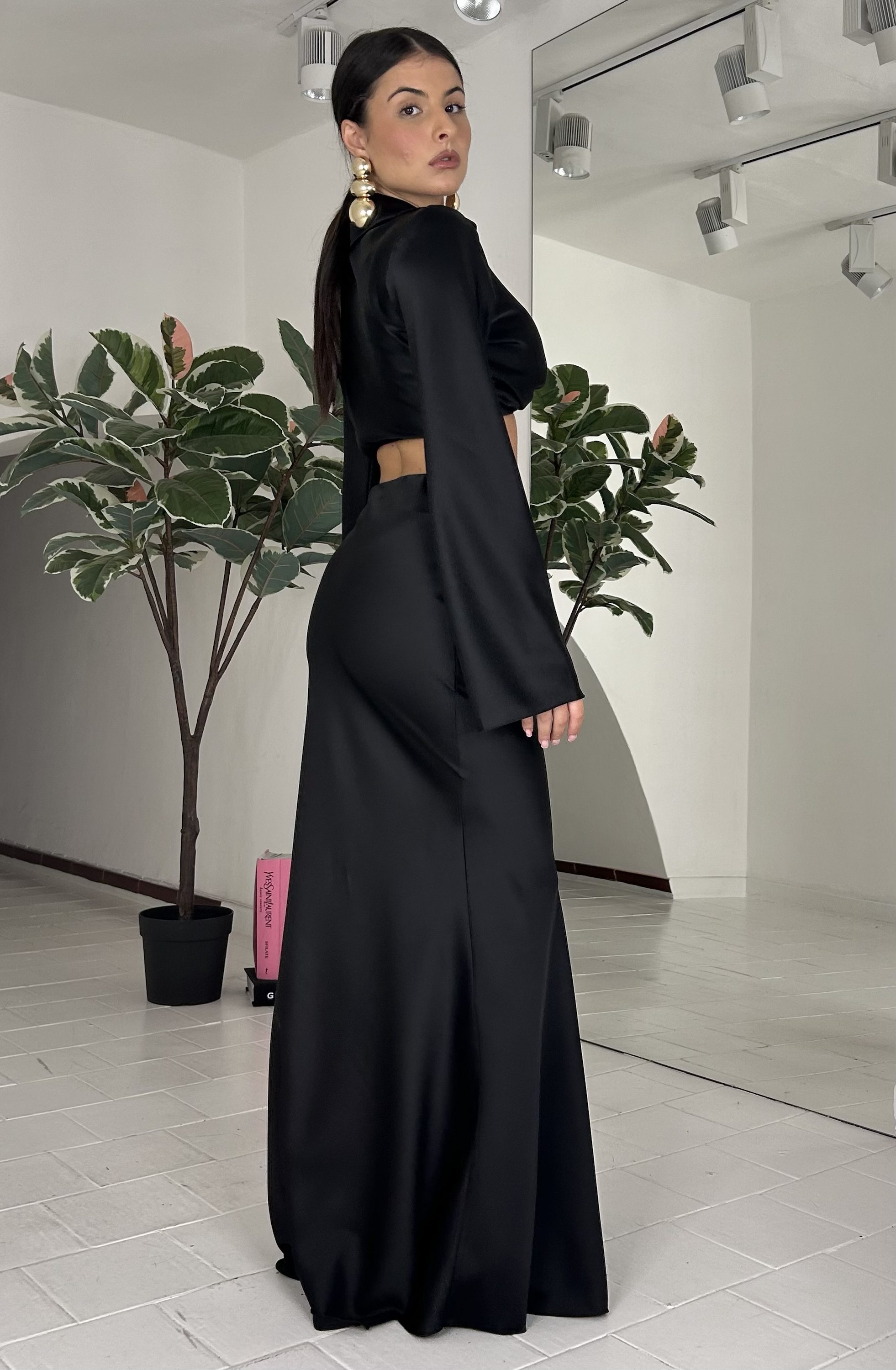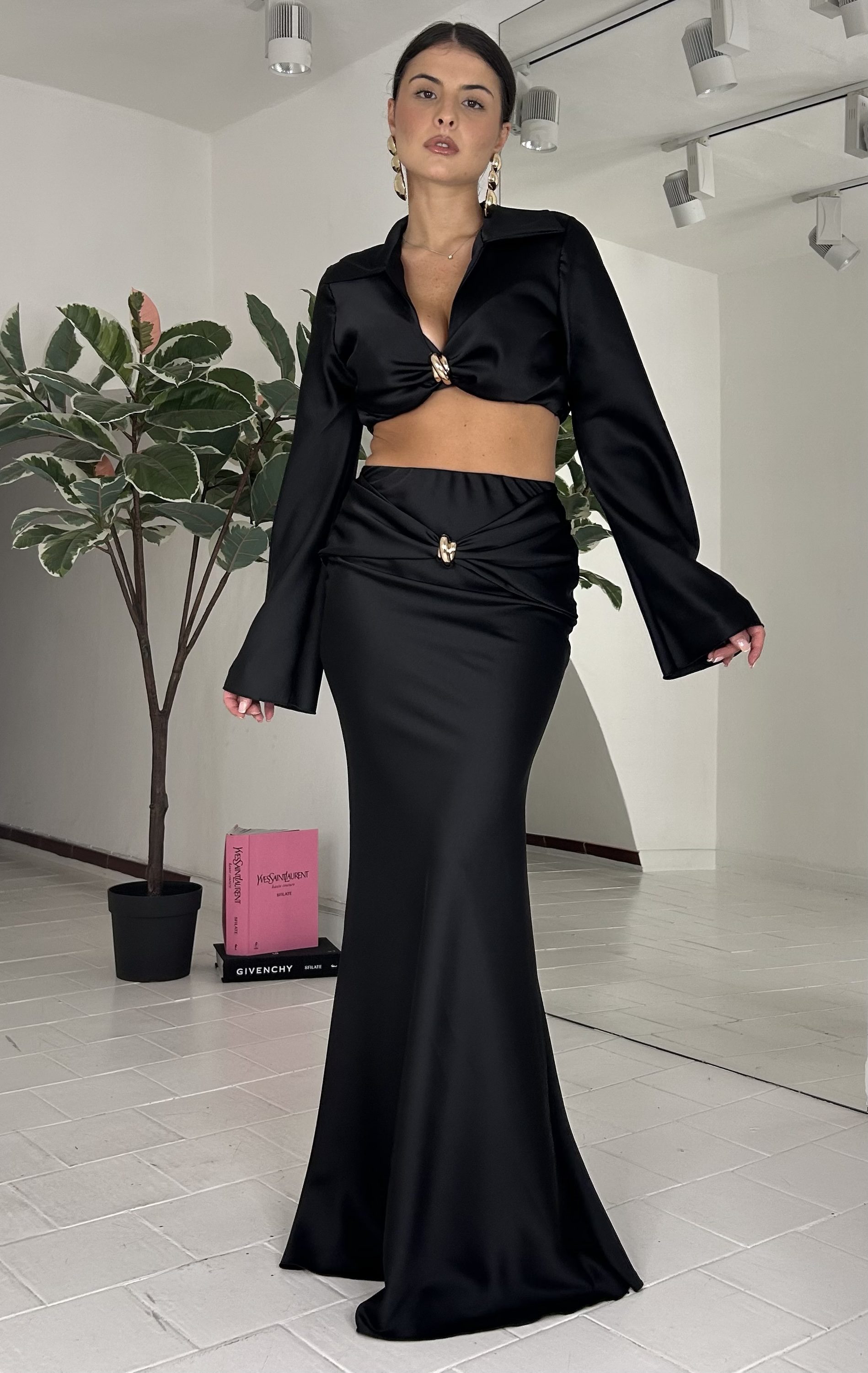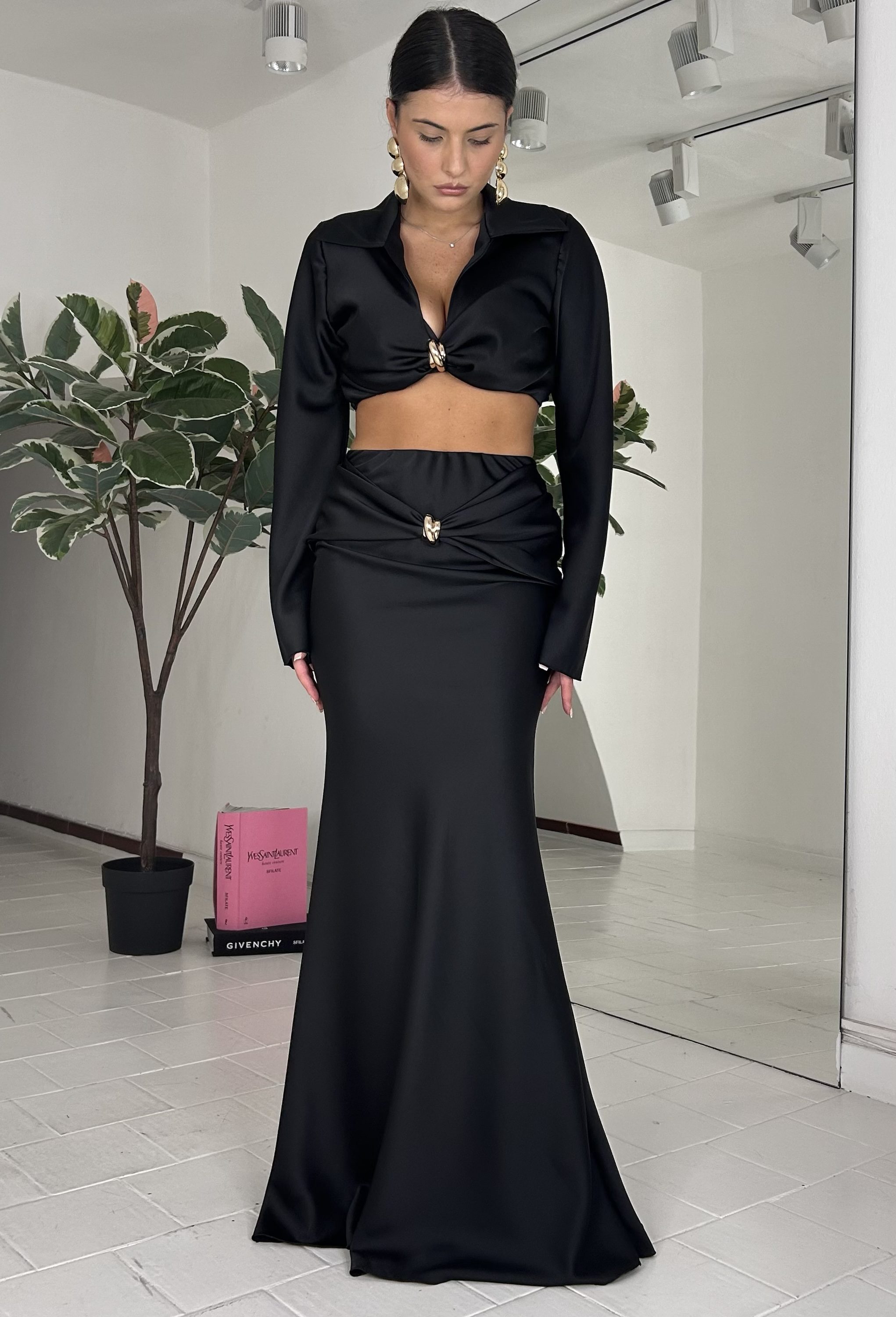 Consiglio da xs ad M, con applicazione oro, top con elastico alla base. La modella รจ una taglia S ed รจ alta 1.60cm