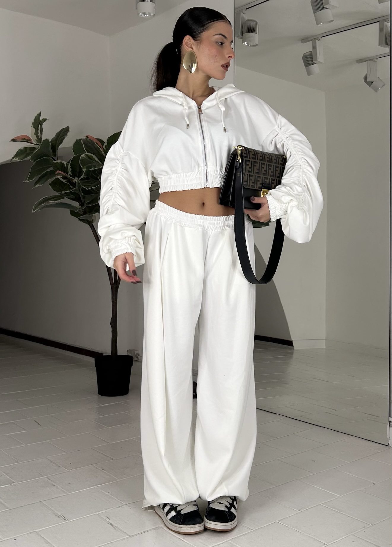 Consiglio da xs ad XL, felpa crop, manica strutturata, pantalone con tasche. La modella รจ una taglia S ed รจ alta 1.60cm