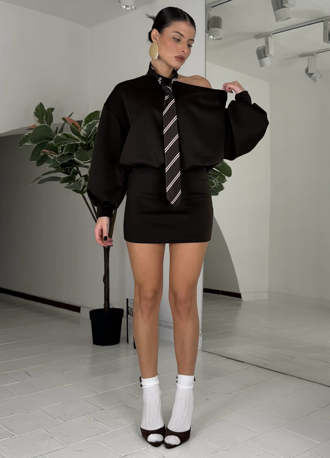 Consiglio da xs ad L, in felpa, oversize, cravatta inclusa. La modella รจ una taglia S ed รจ alta 1.60cm