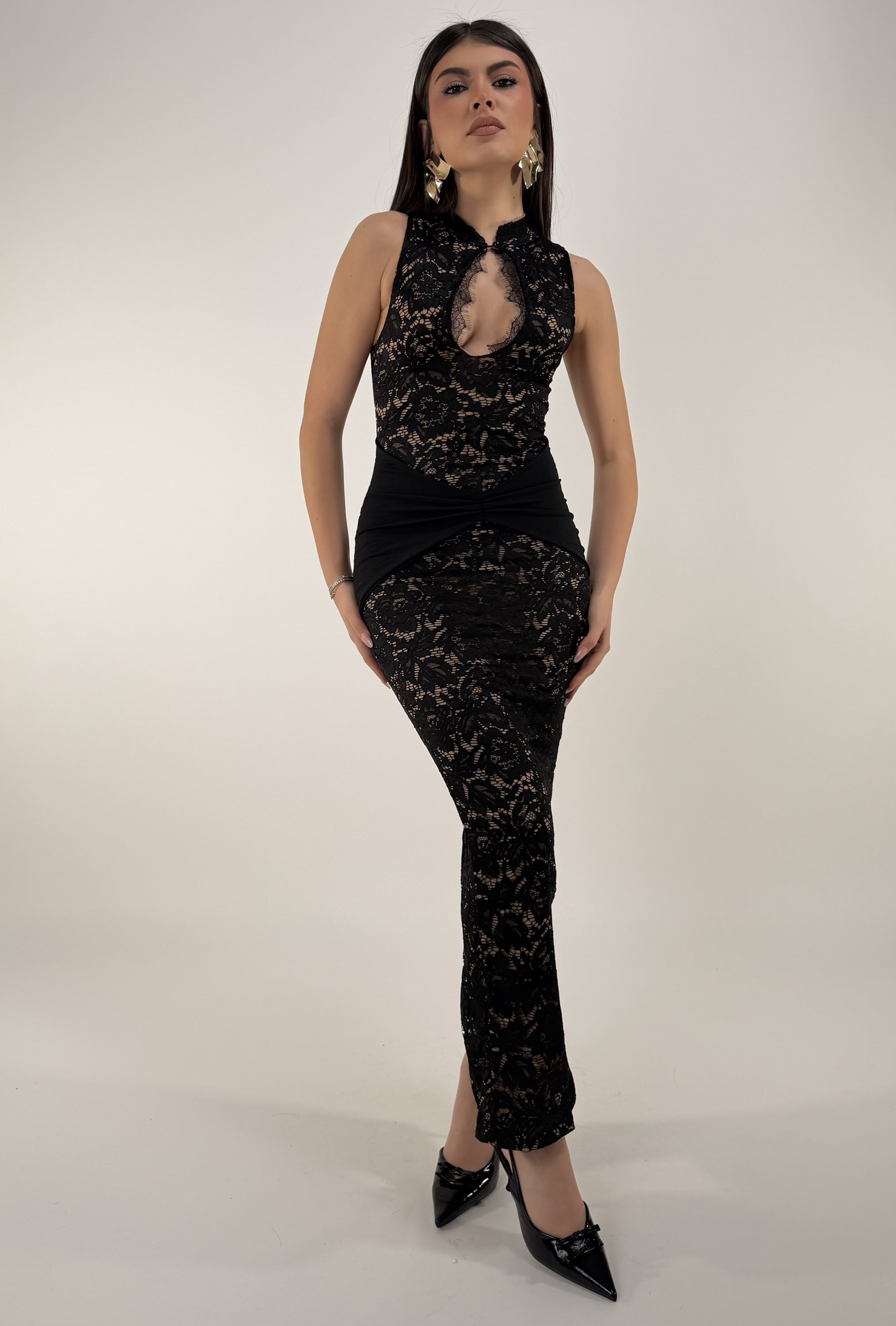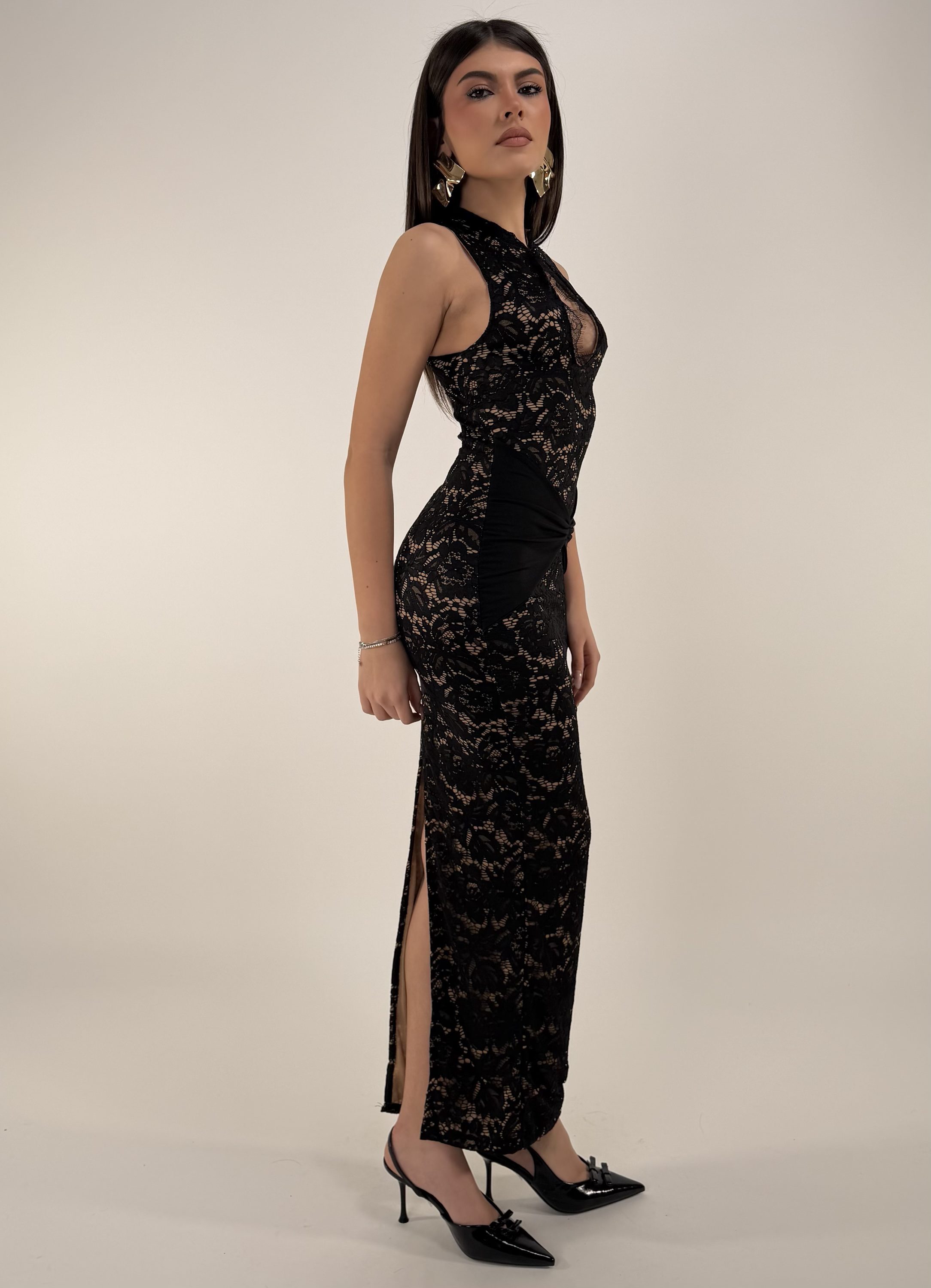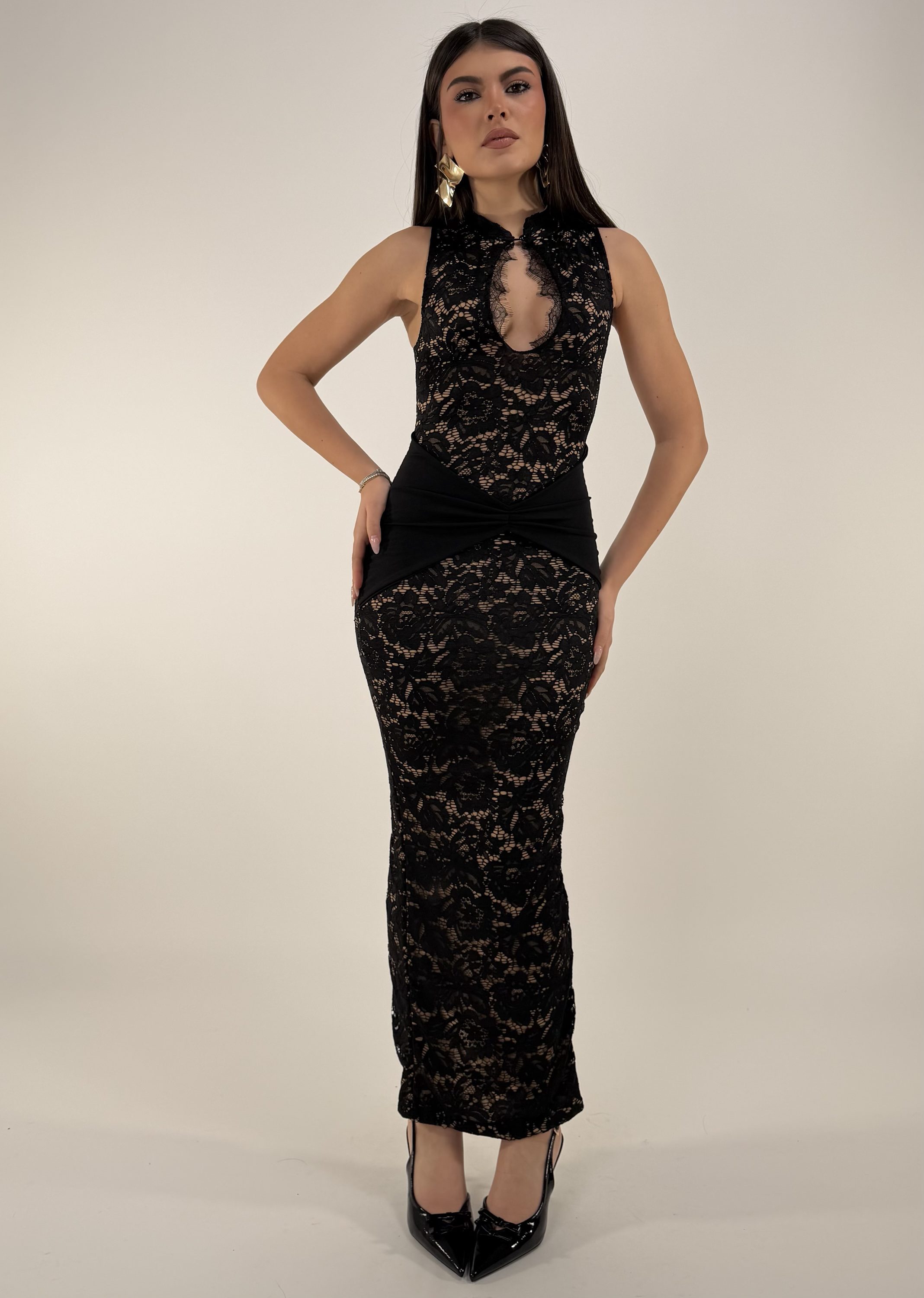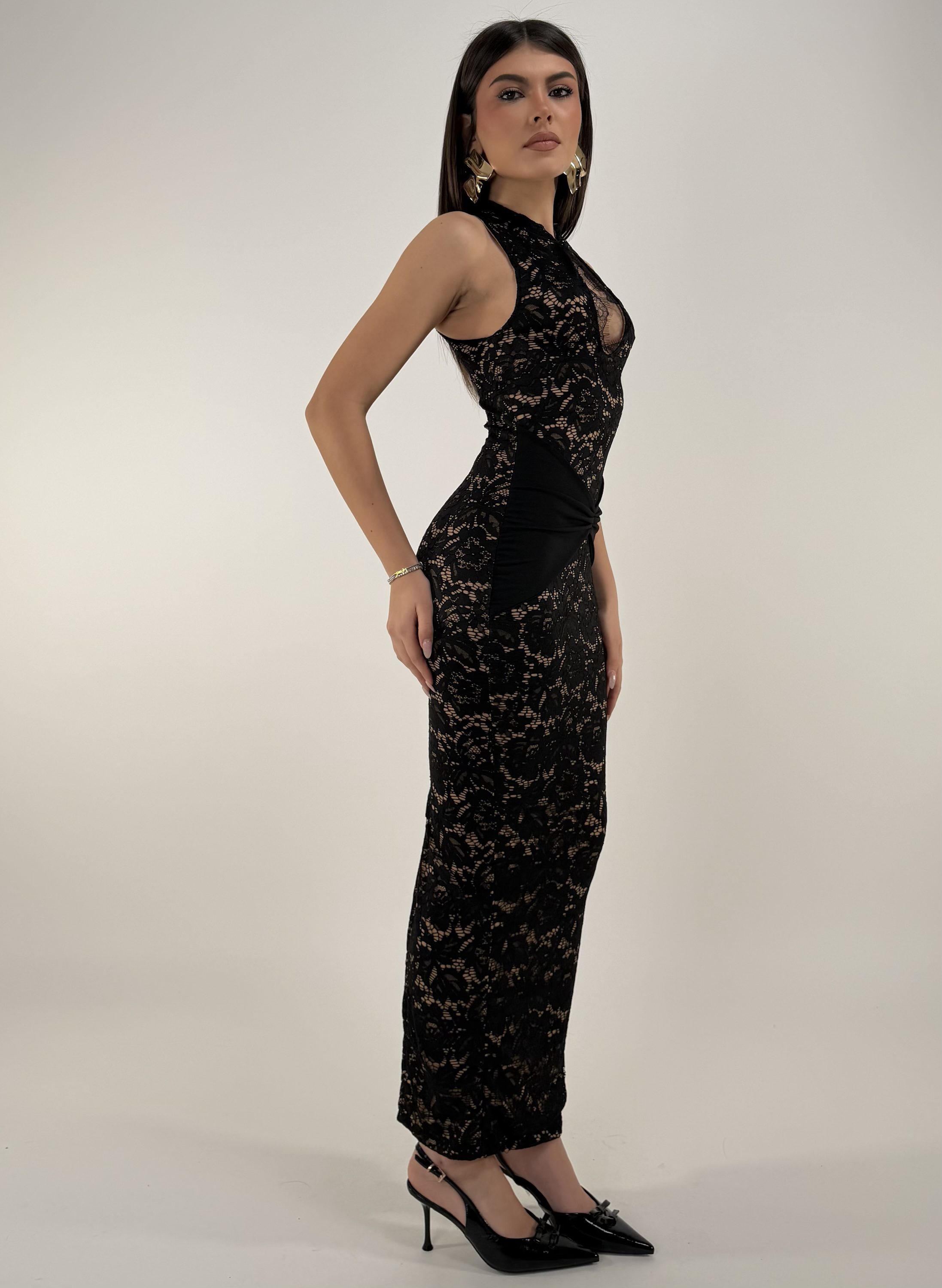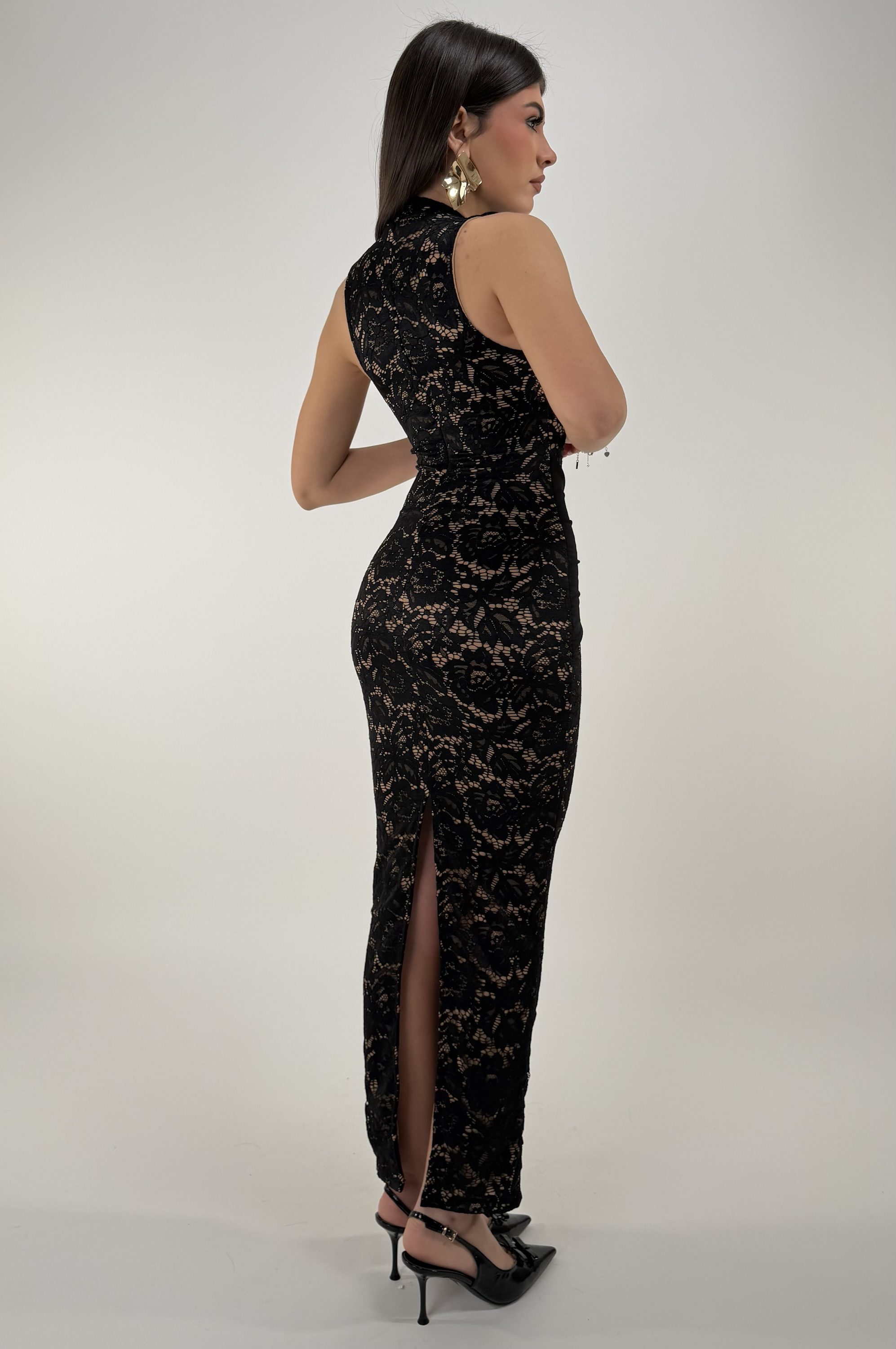 Consiglio da xs ad L, zip sul retro, con bottone sul collo. La modella รจ alta 1,65cm ed รจ una taglia S