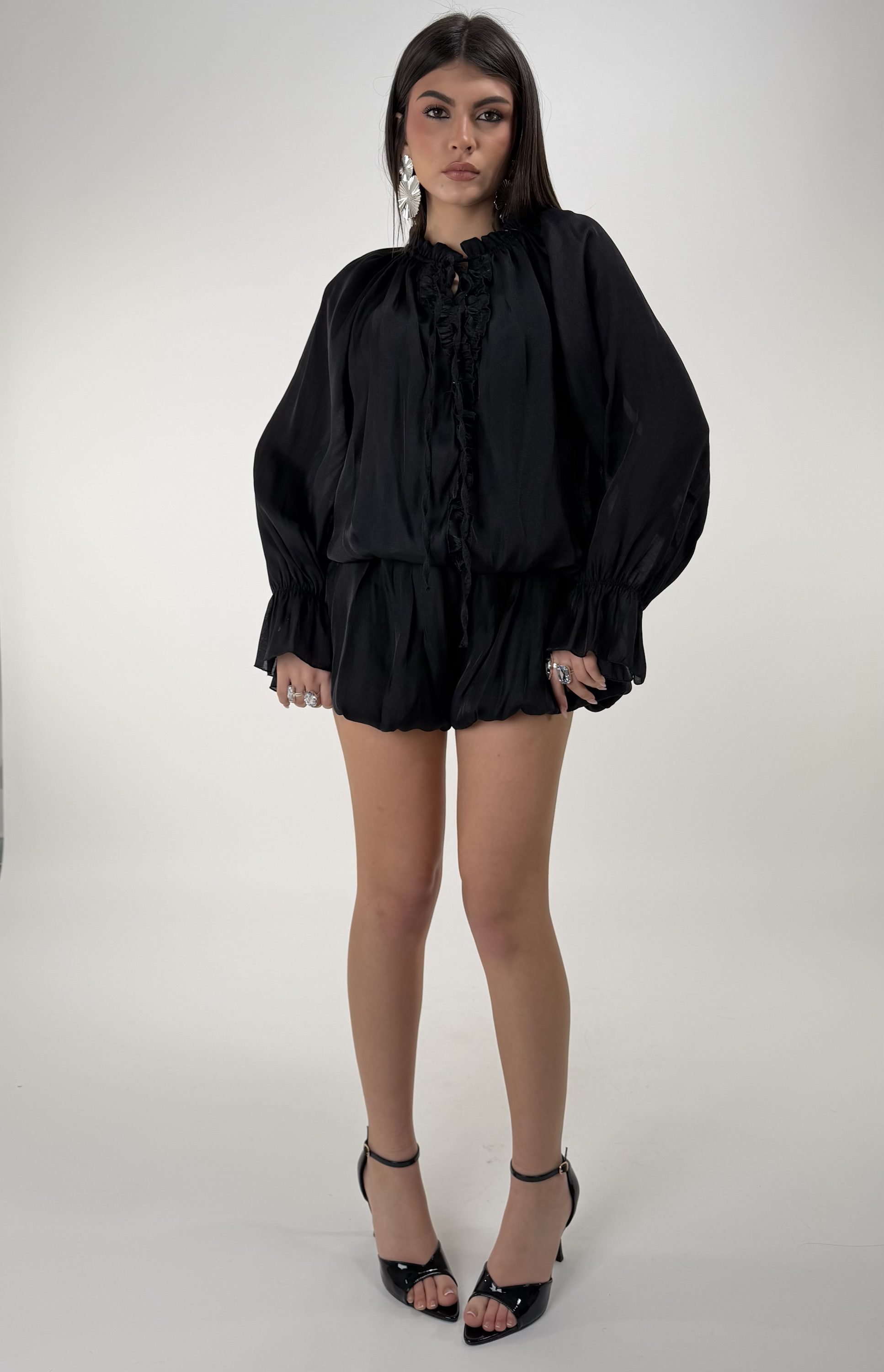 Consiglio da xs ad XL. Elastico in vita e sui polsi, fiocco regolabile sul davanti, con pantaloncino. La modella รจ una taglia S ed รจ alta 1.65cm