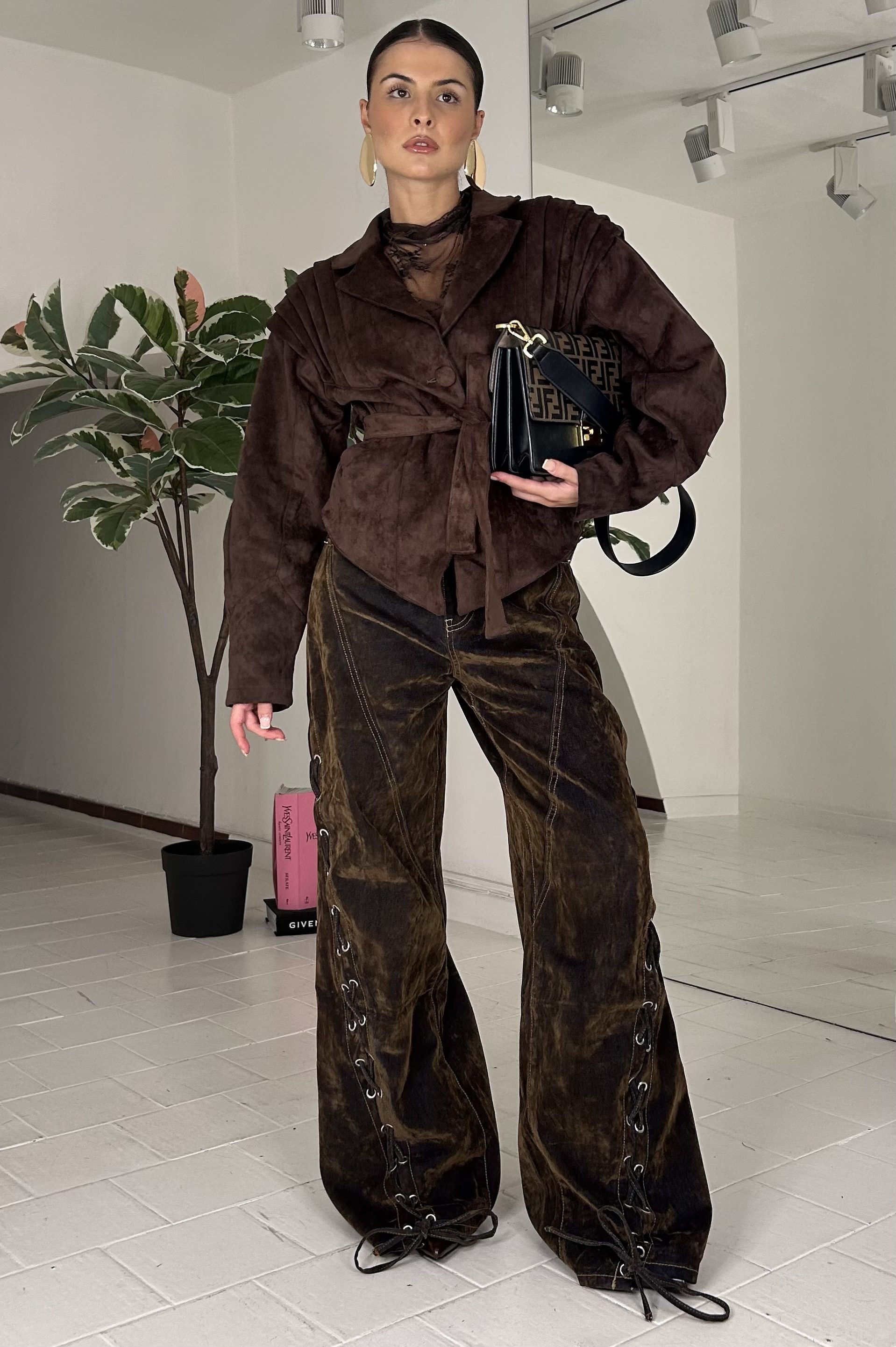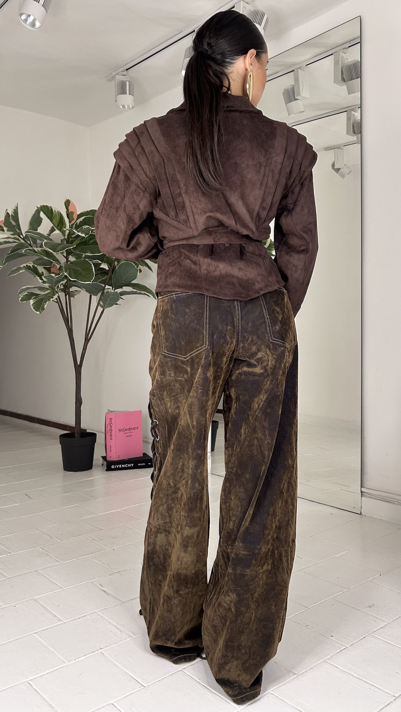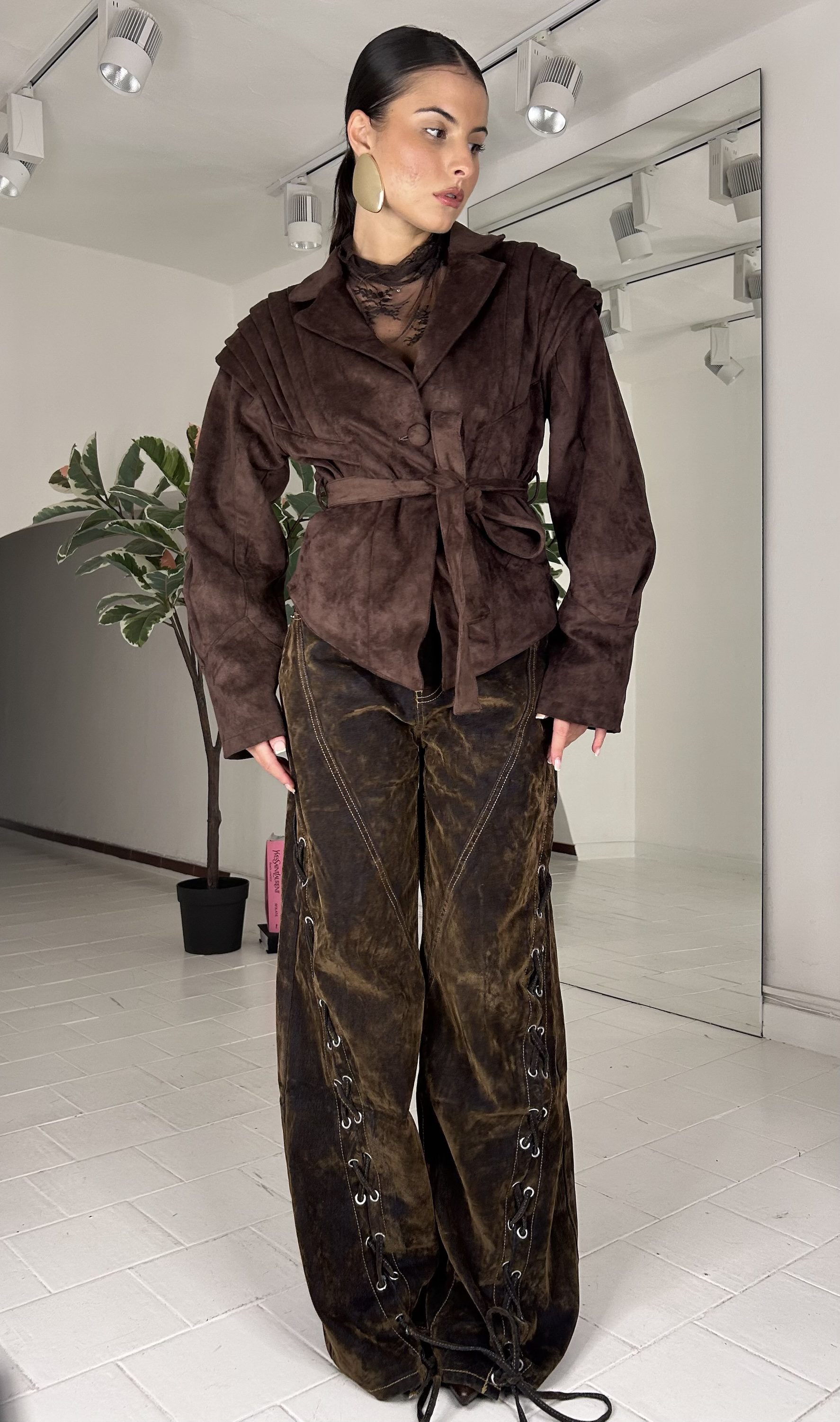 Consiglio da xs ad L, in camoscio, manica a palloncino, con cintura e bottoni, spalla strutturata. La modella è una taglia S