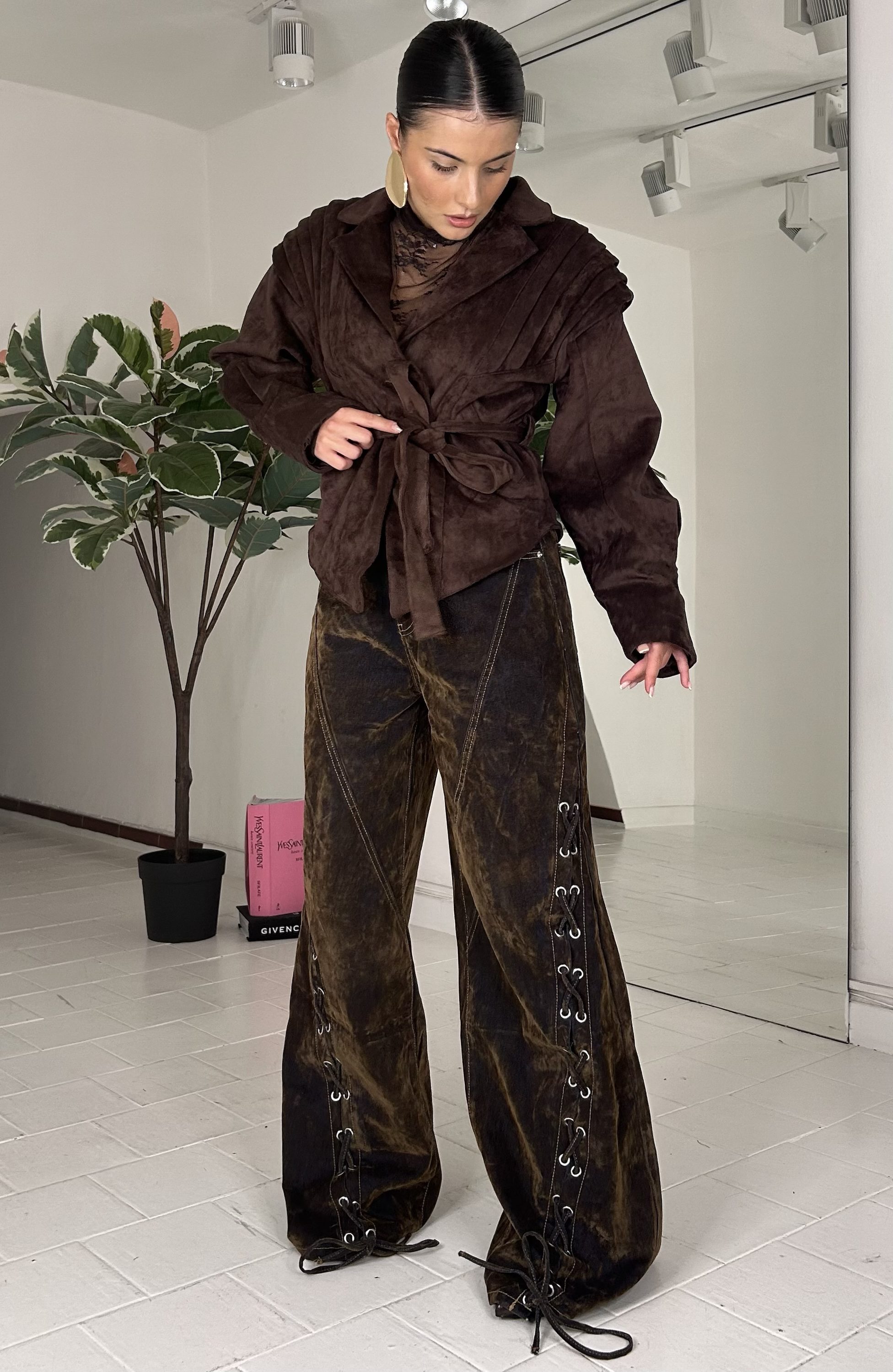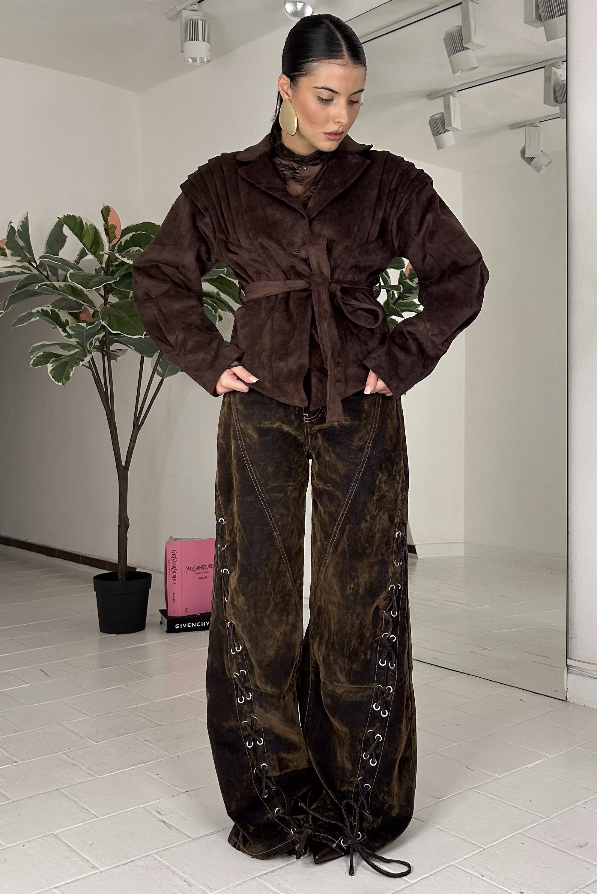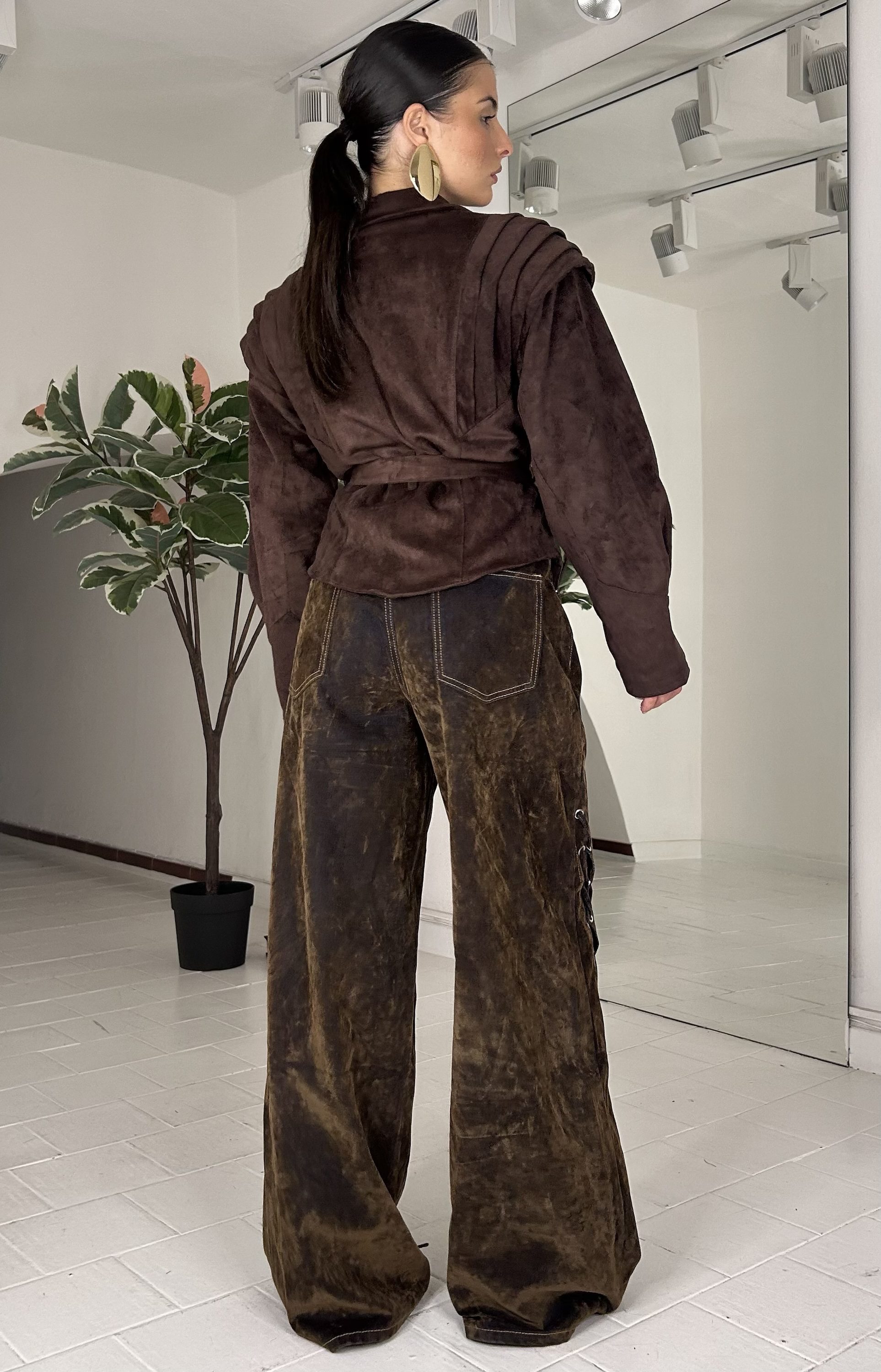 Consiglio da xs ad L, in camoscio, manica a palloncino, con cintura e bottoni, spalla strutturata. La modella è una taglia S