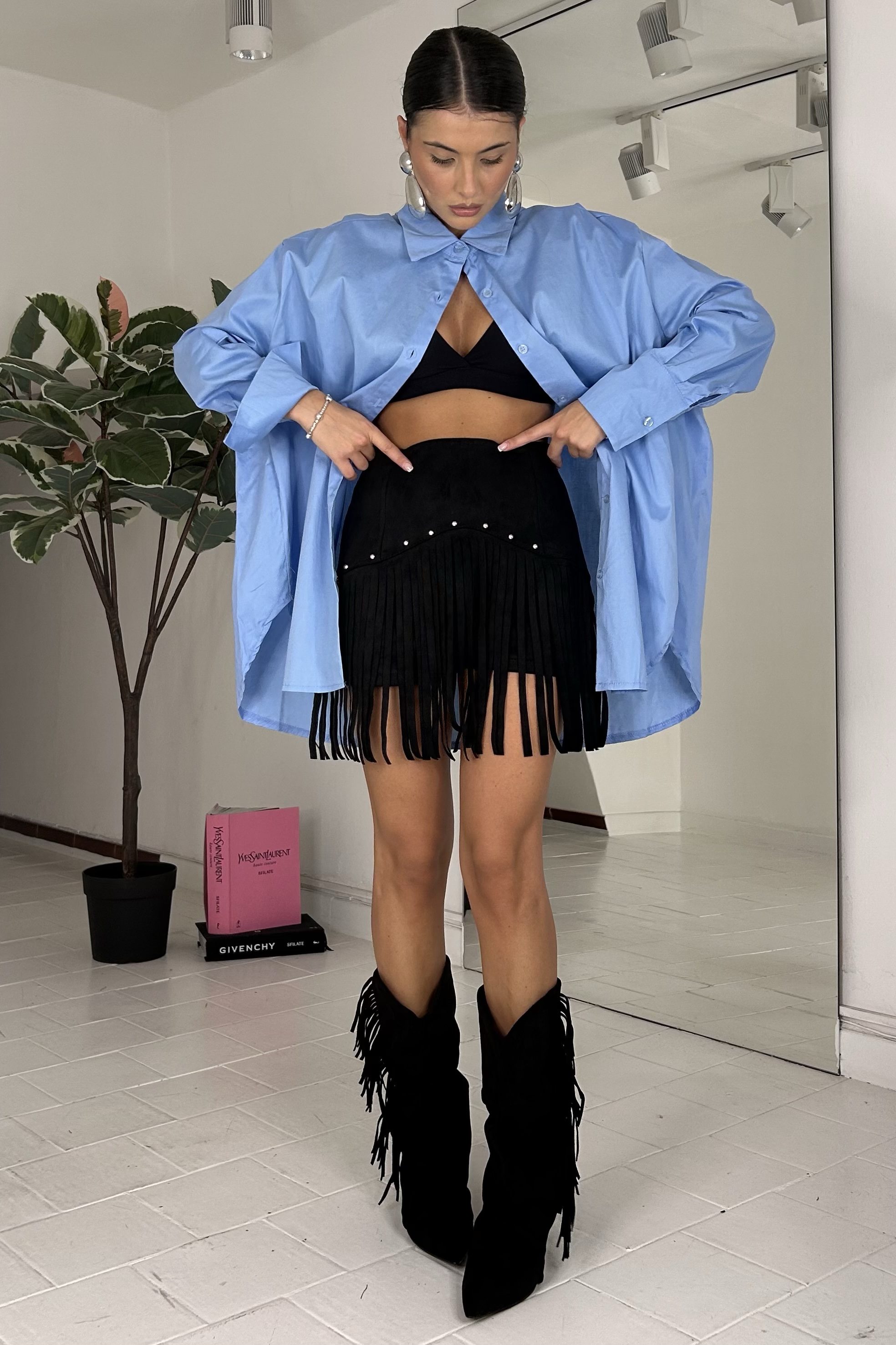 Consiglio da xs ad L, in camoscio, con borchie argento. La modella รจ una taglia S ed รจ alta 1,60cm