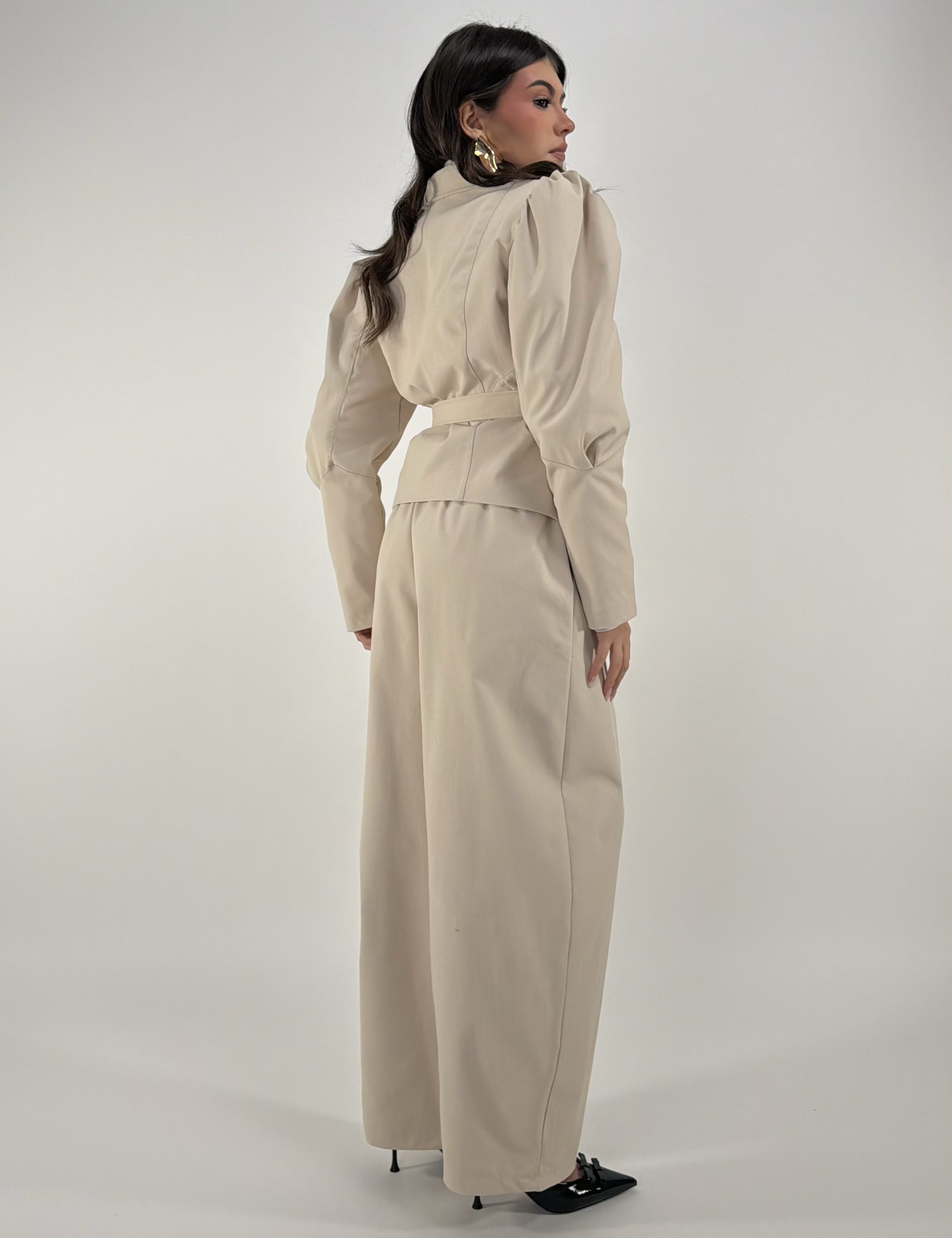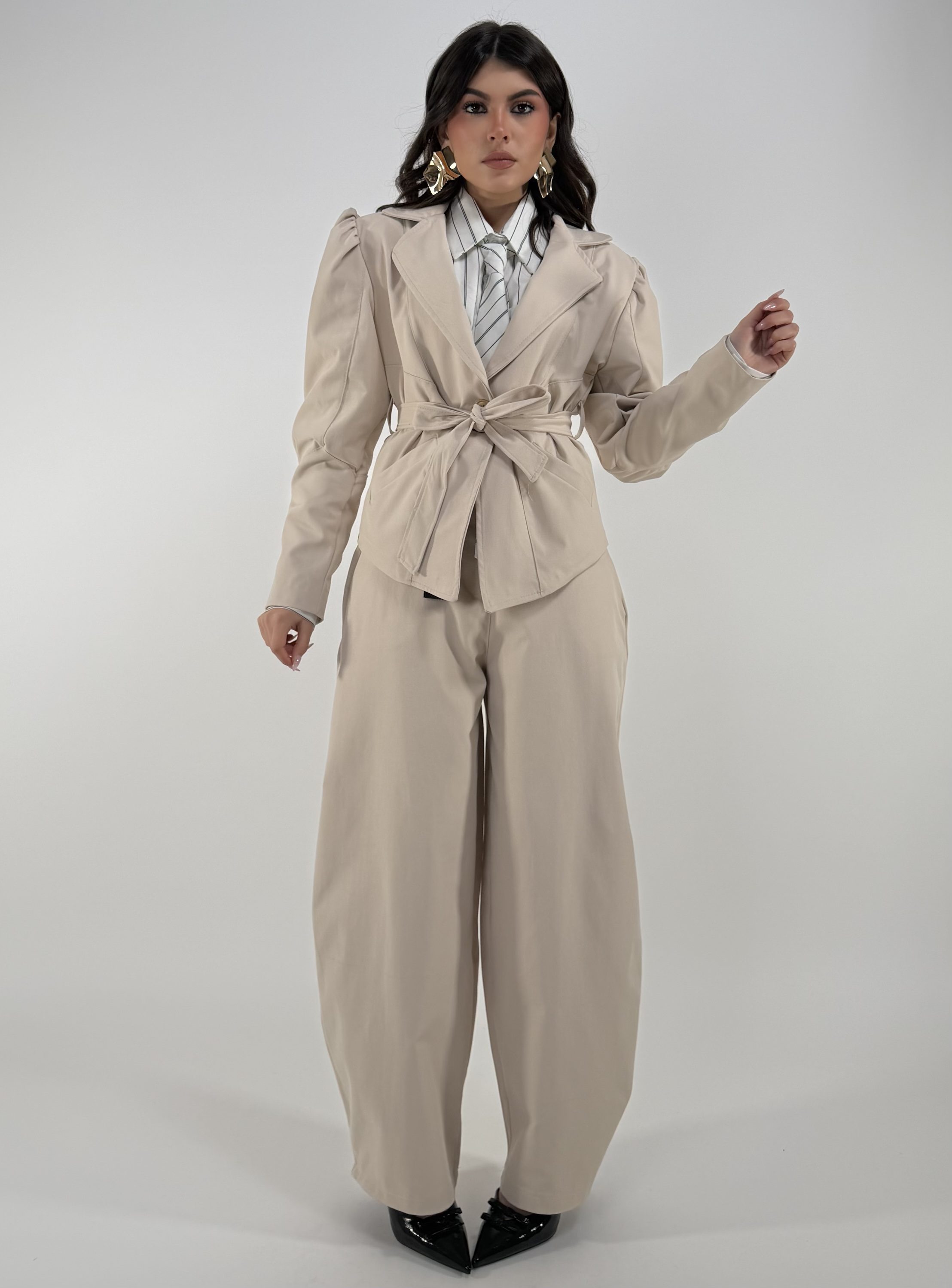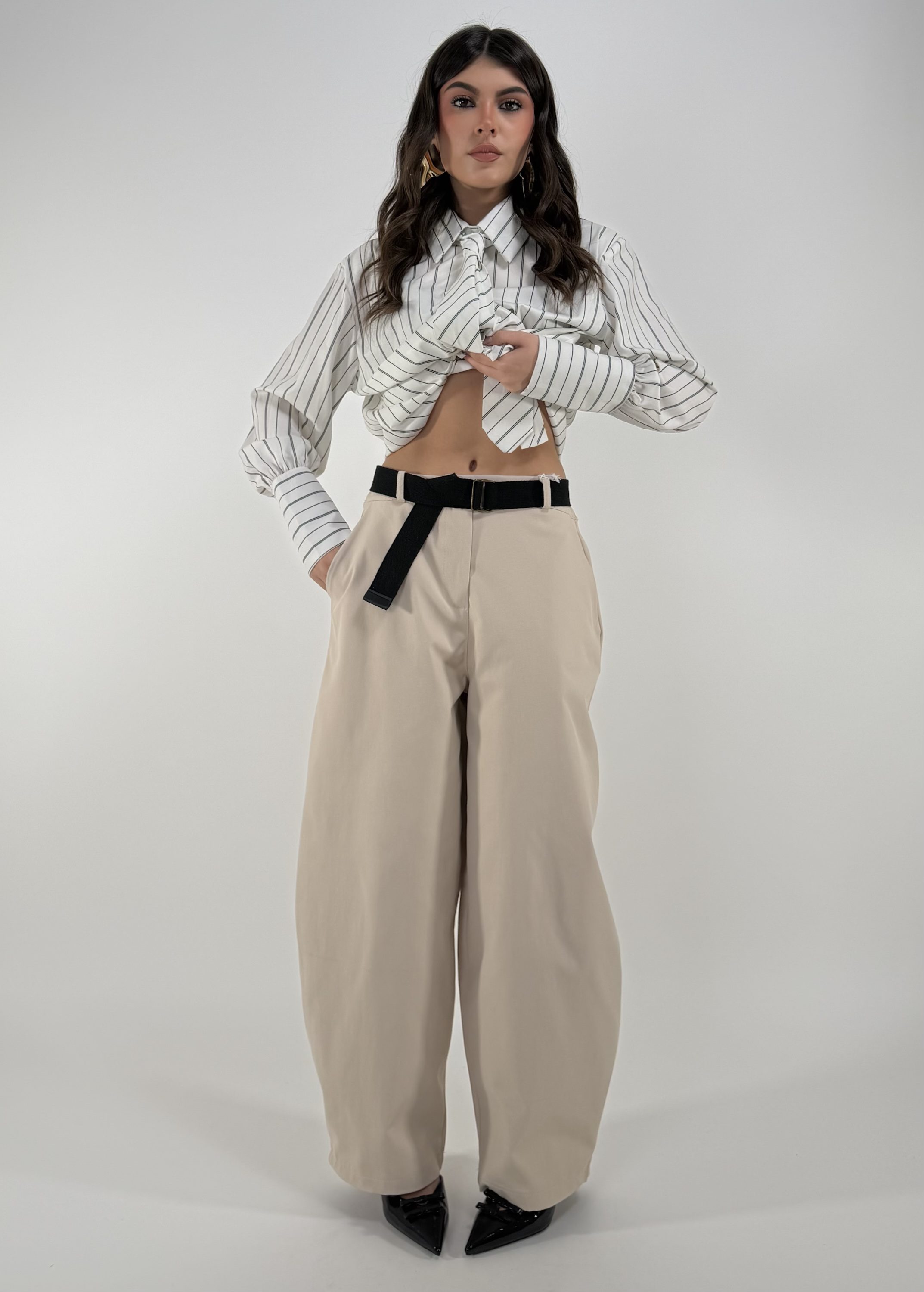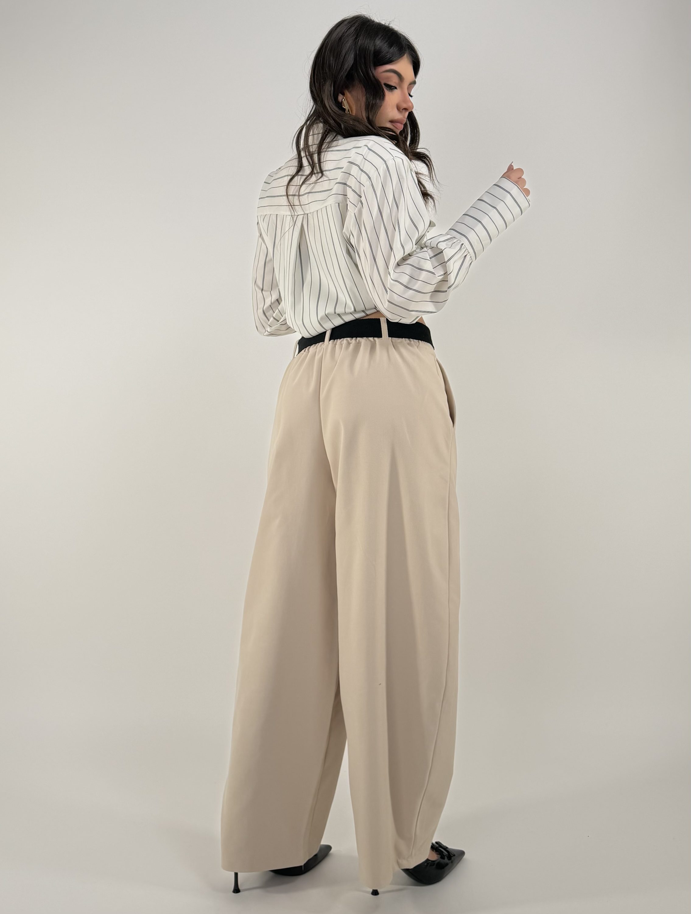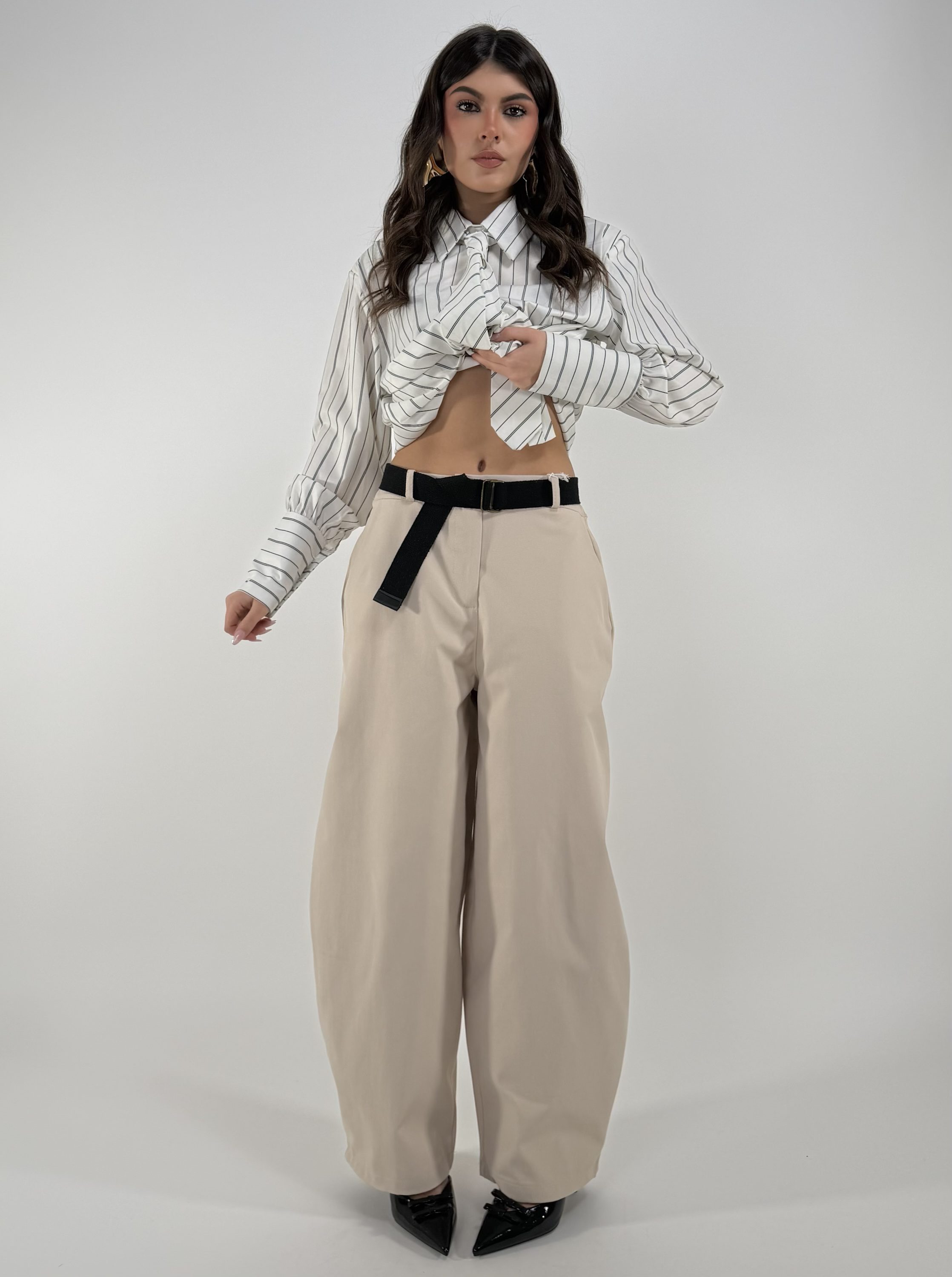 Consiglio da xs ad L, con zip, bottone, cintura inclusa , tasche, elastico sul retro. La modella รจ una taglia S ed รจ alta 1.65cm