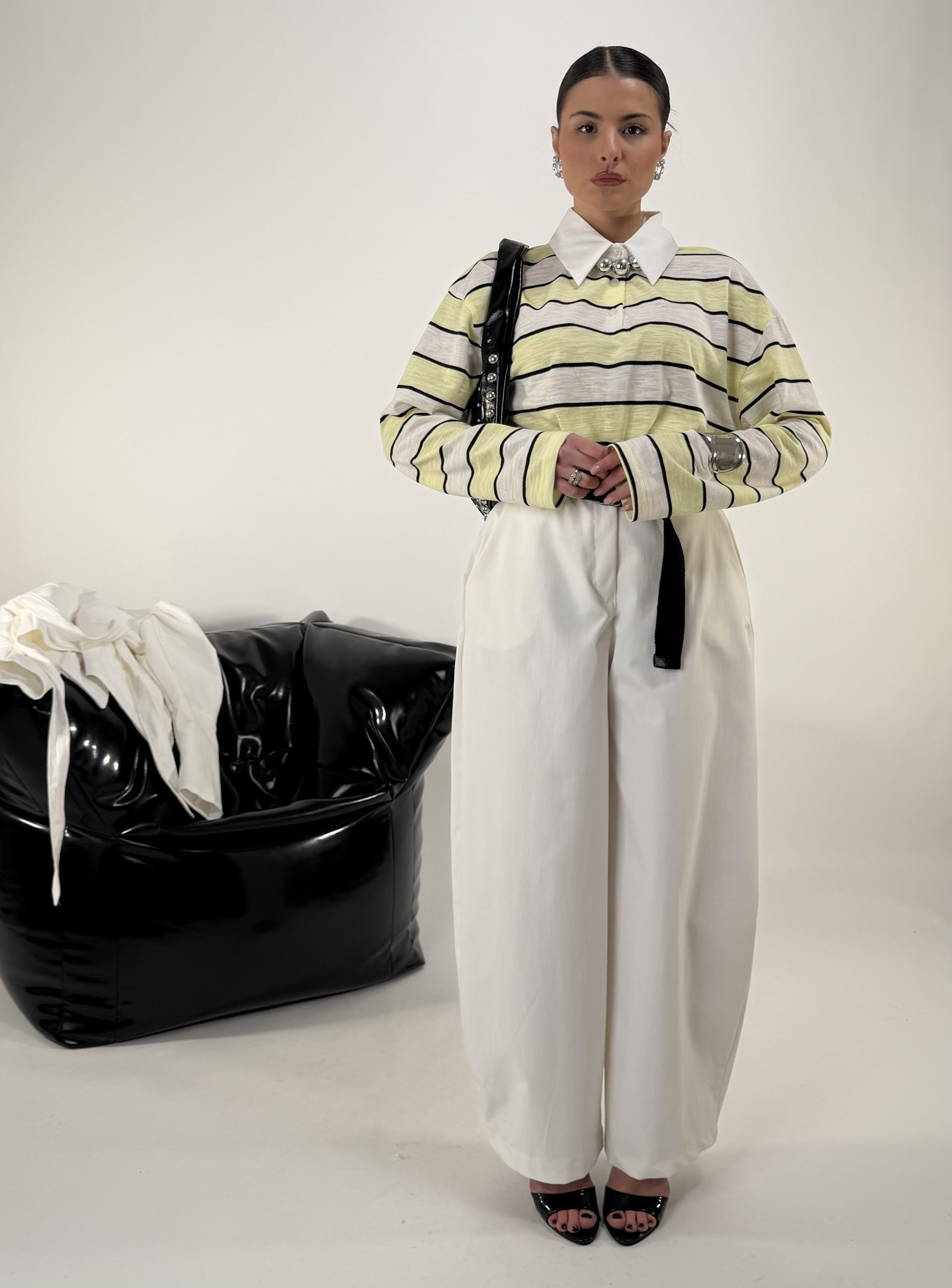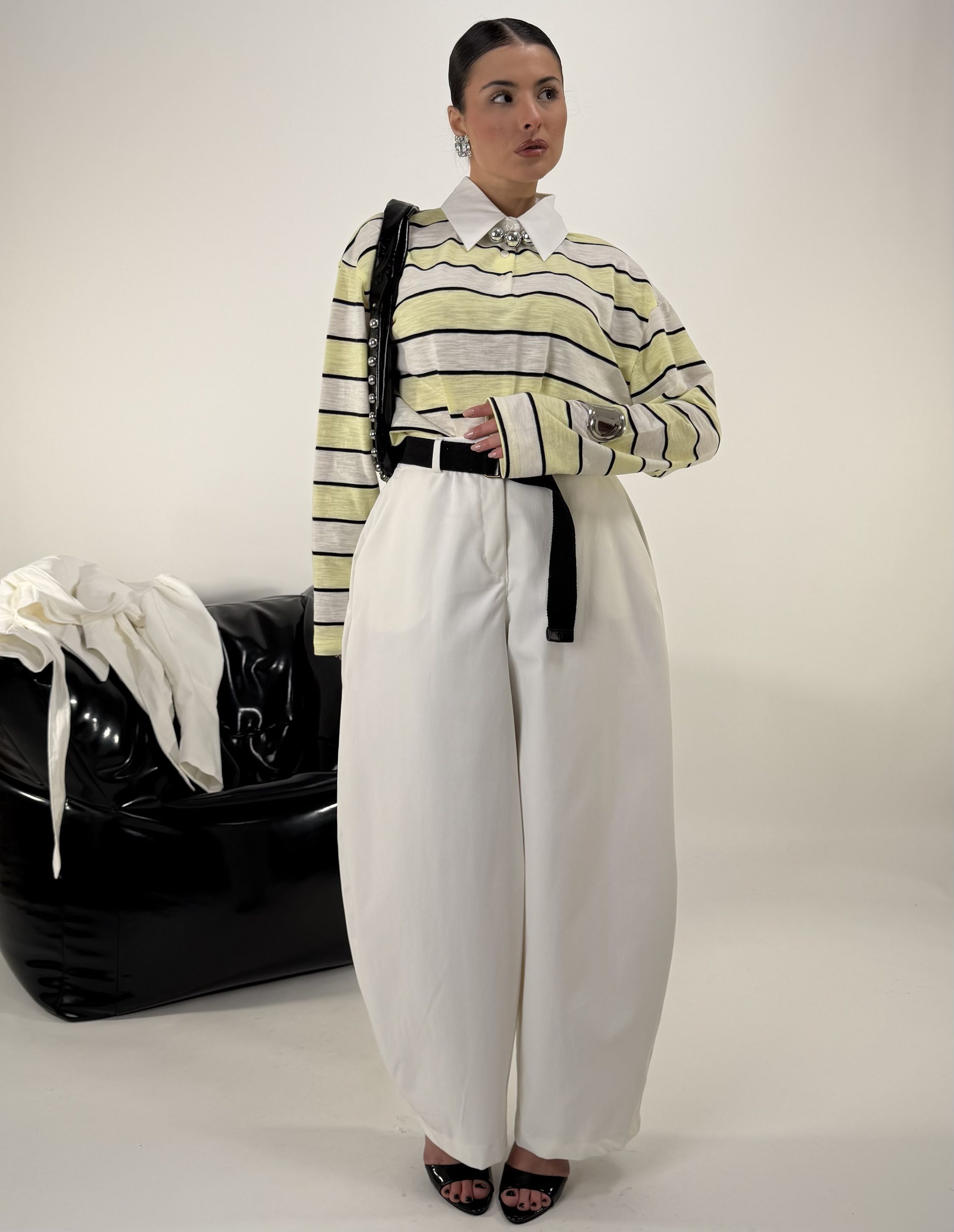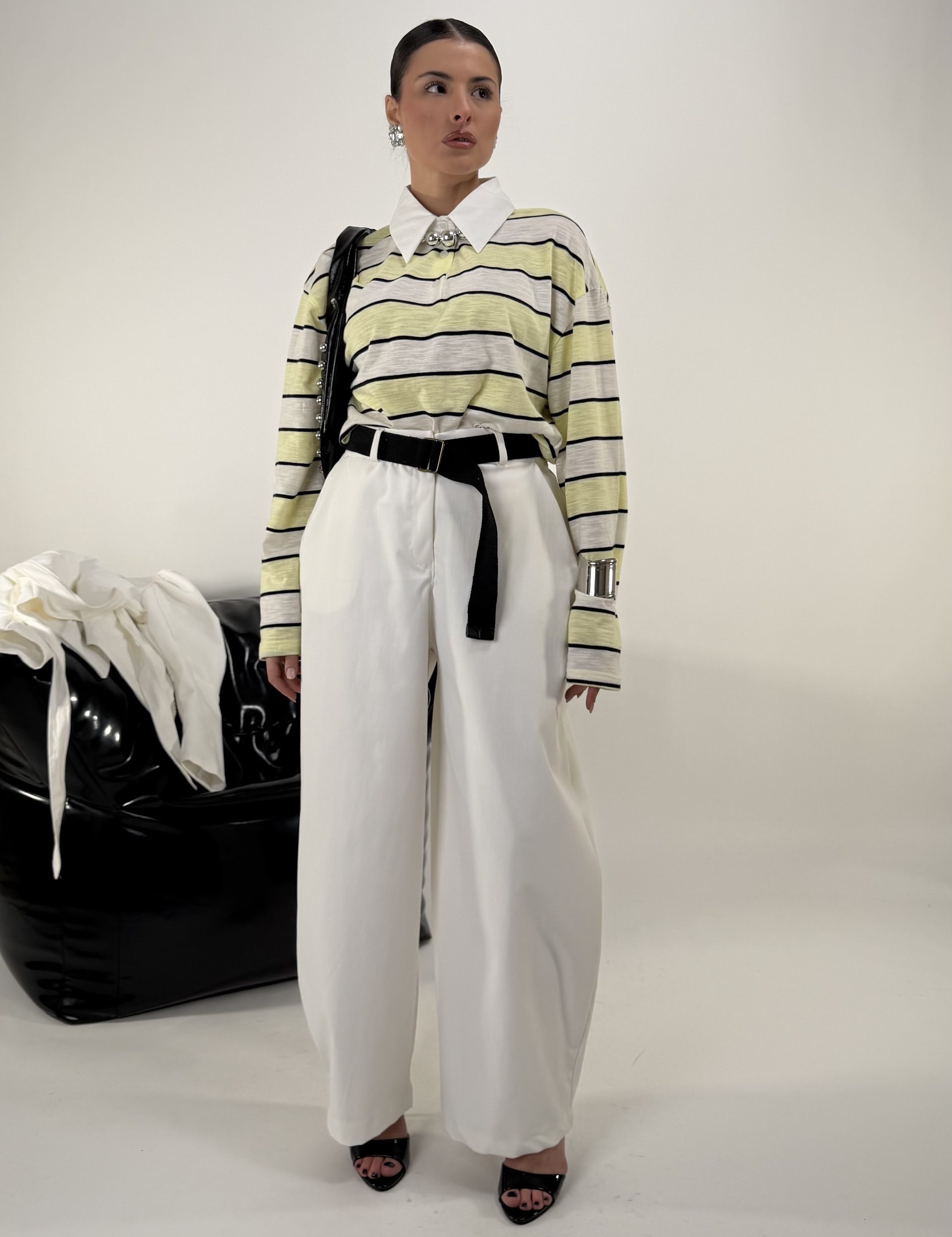 Consiglio da xs ad L, con tasche, cintura inclusa, elastico sui retro, con bottone e zip. La modella รจ una taglia S ed รจ alta 1.60cm
