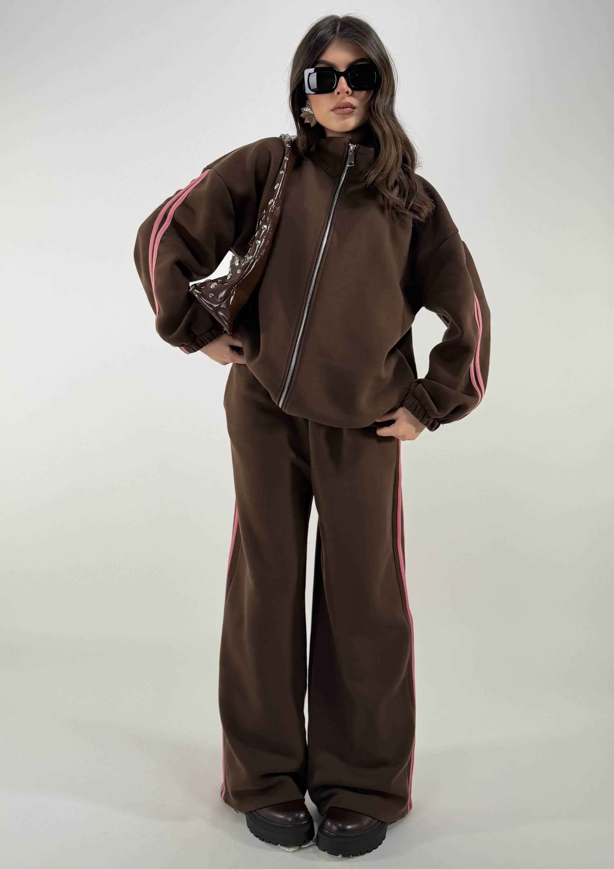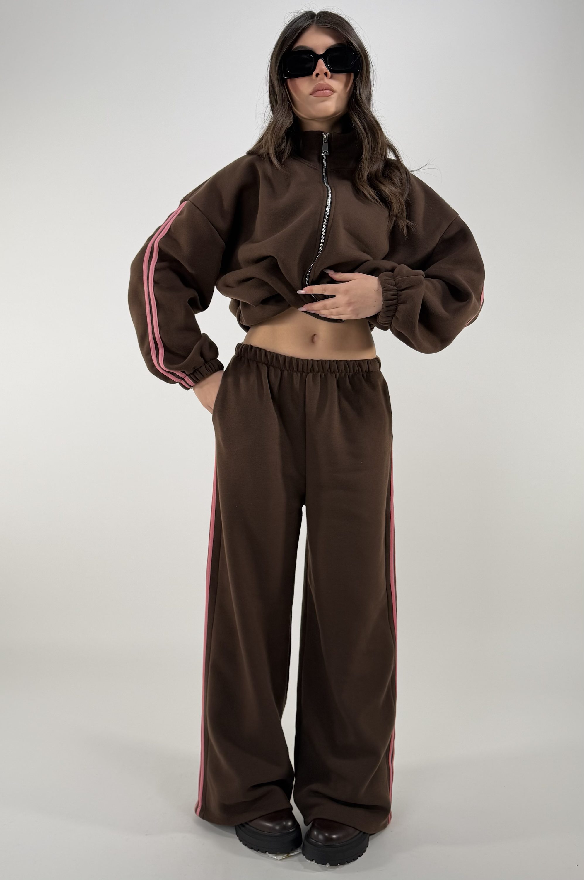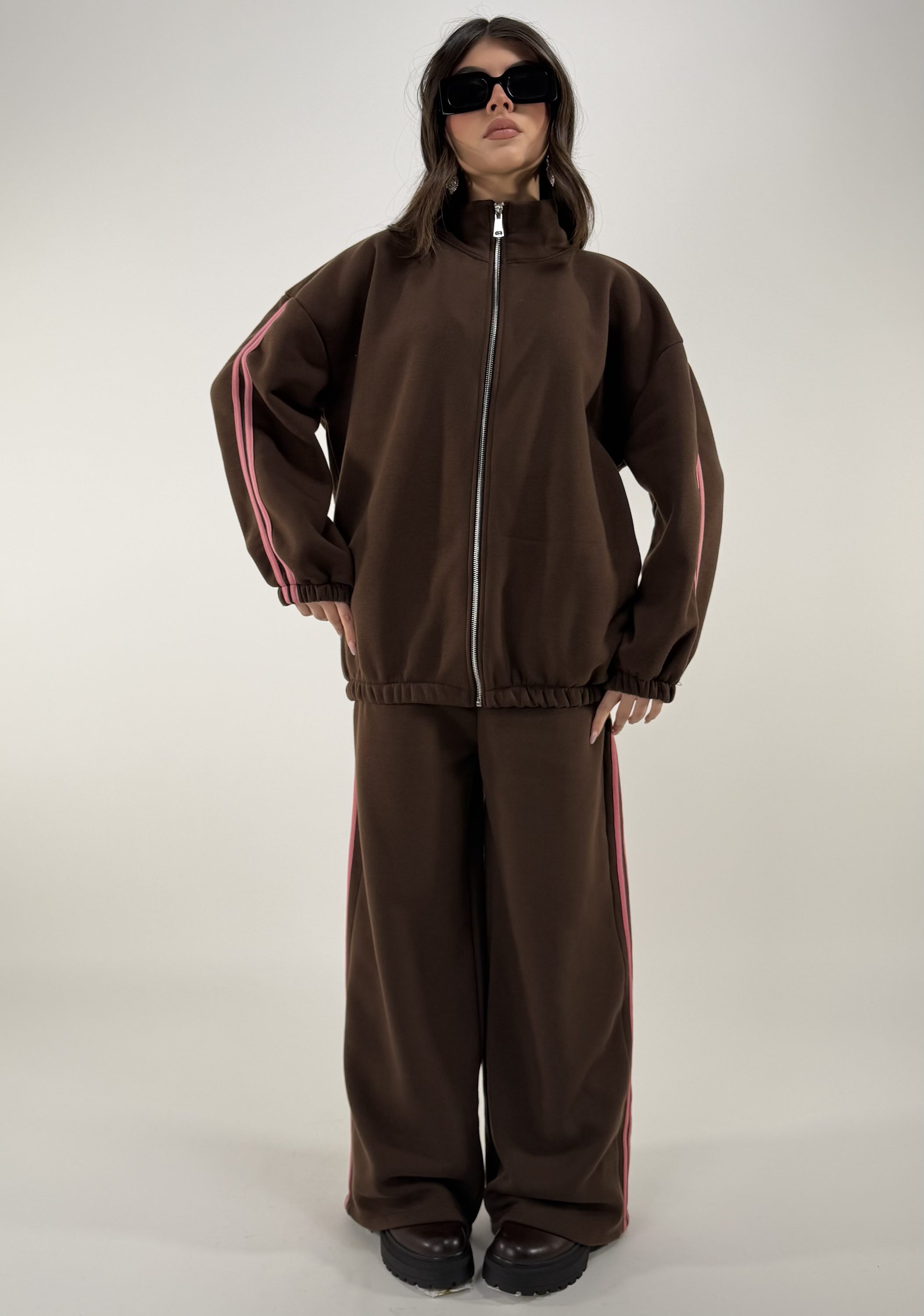 Consiglio da xs ad XL. Pantalone con elastico in vita e tasche; giacca con zip, elastico alla base e sui polsi,con tasche. La modella รจ una taglia S ed รจ alta 1.65cm