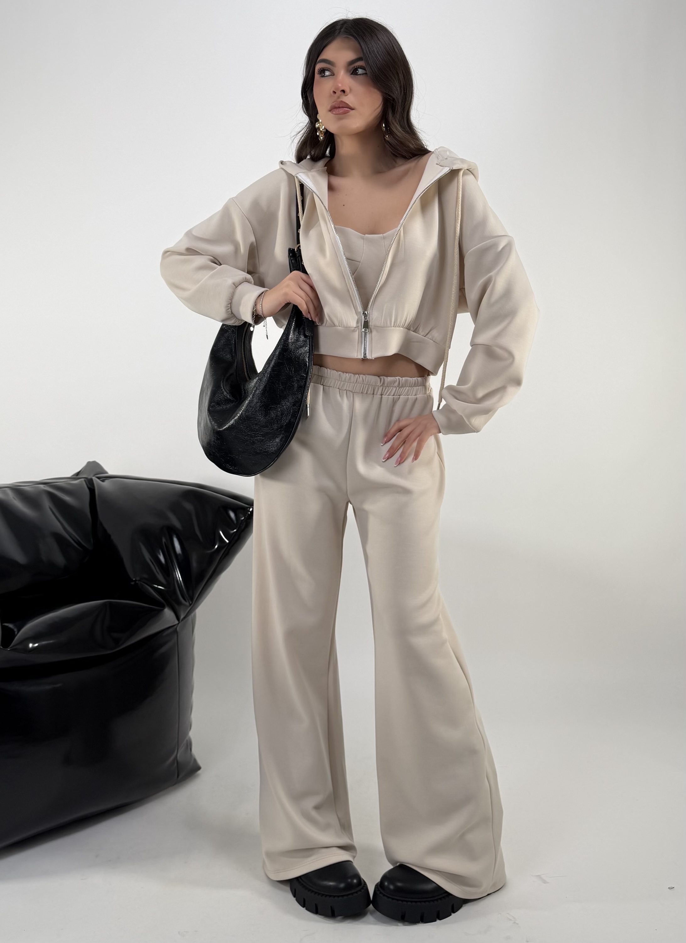 Set di 3 pezzi. Consiglio da xs ad XL, pantalone con elastico in vita. Top elasticizzato. Felpa con cappuccio, zip. La modella รจ una taglia S ed รจ alta 1.65cm