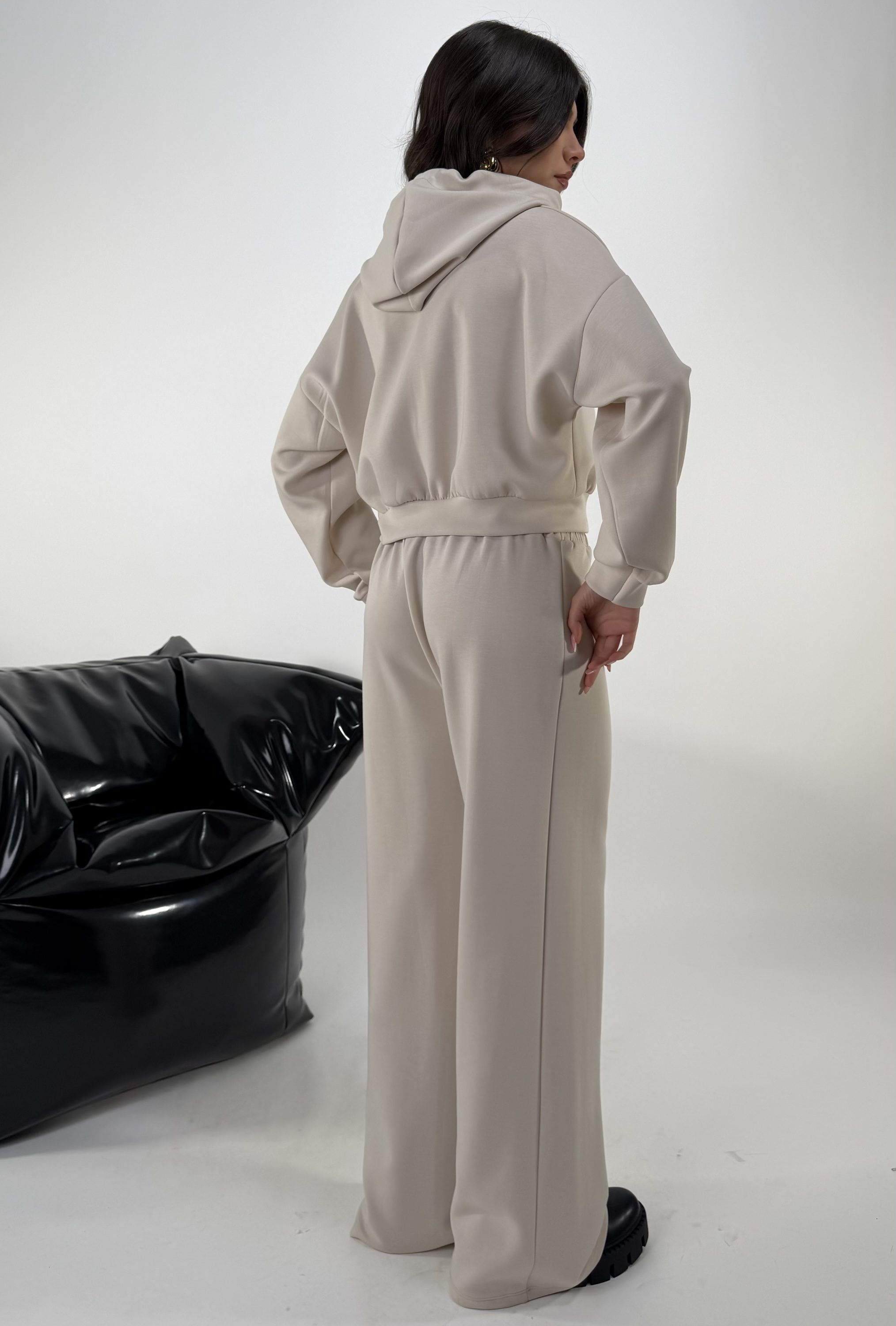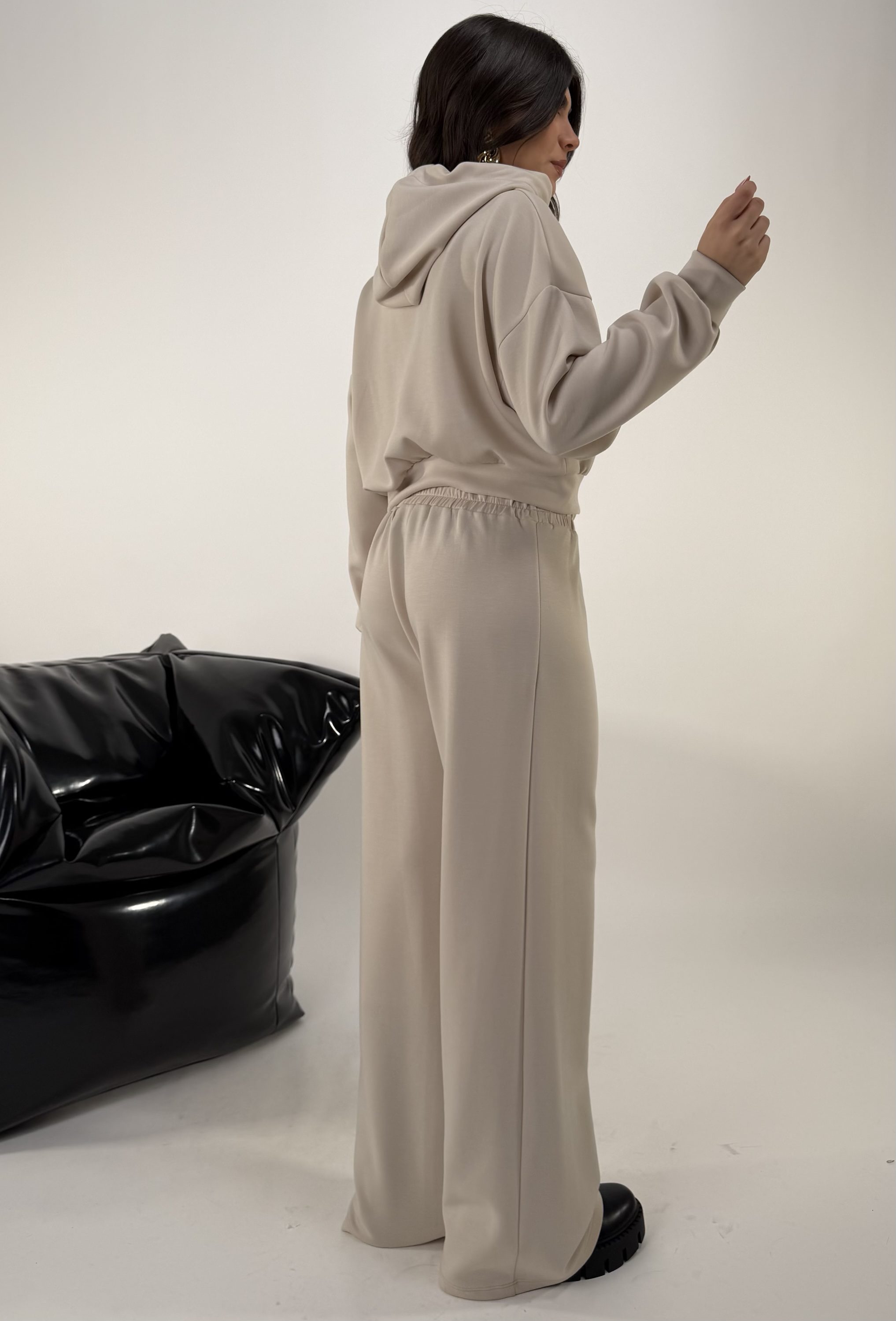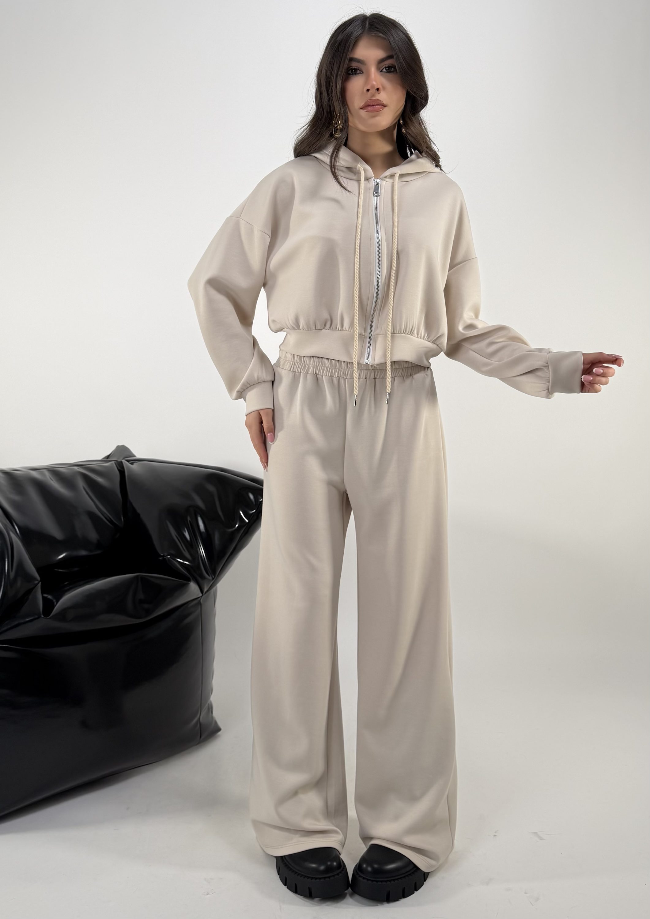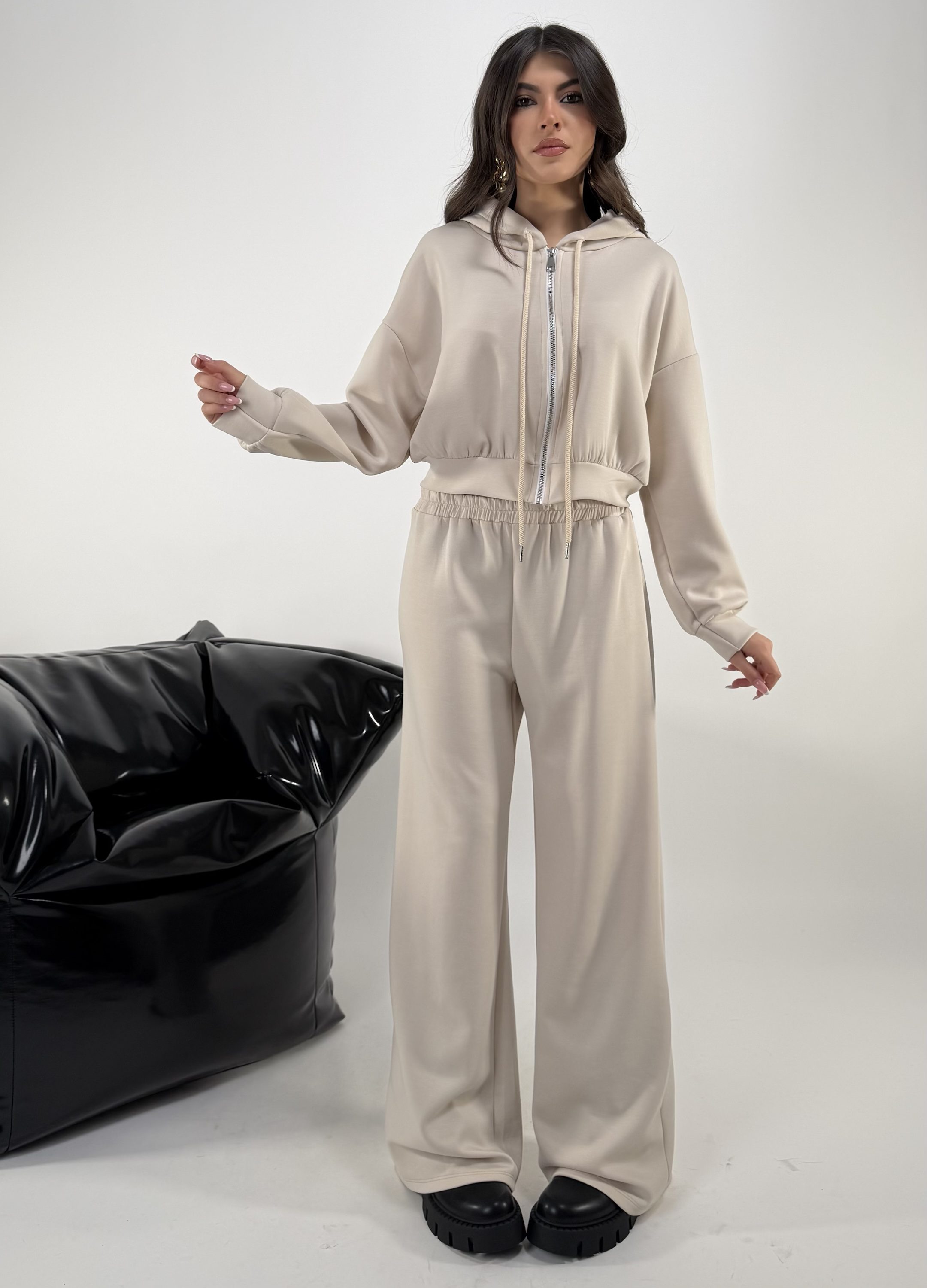 Set di 3 pezzi. Consiglio da xs ad XL, pantalone con elastico in vita. Top elasticizzato. Felpa con cappuccio, zip. La modella รจ una taglia S ed รจ alta 1.65cm