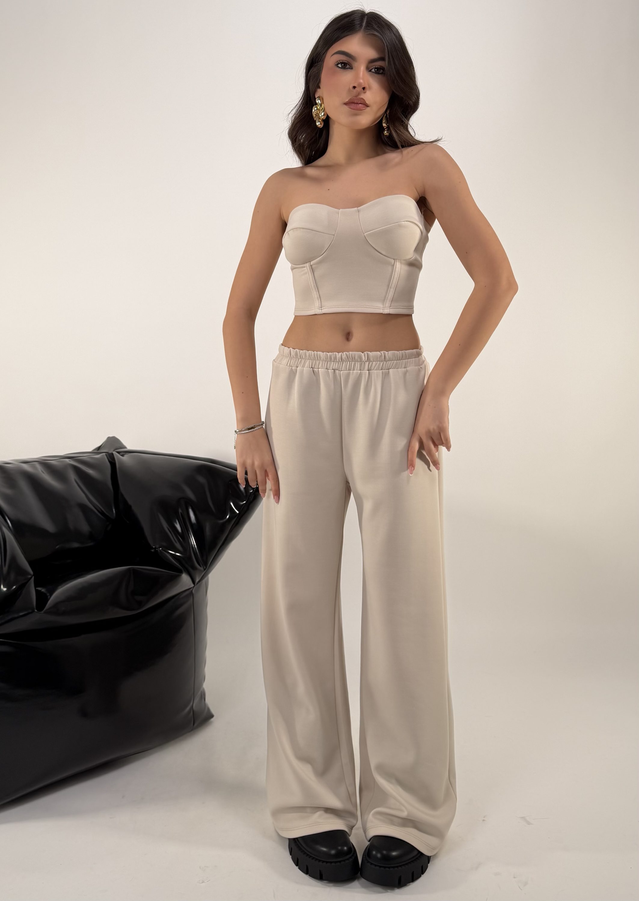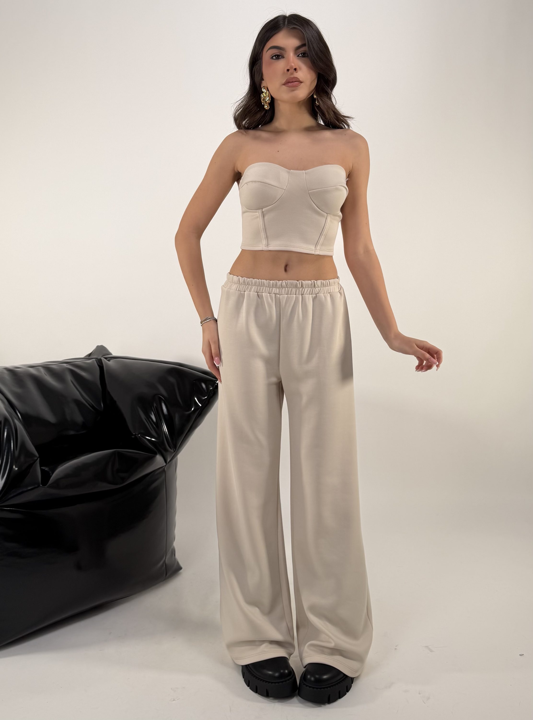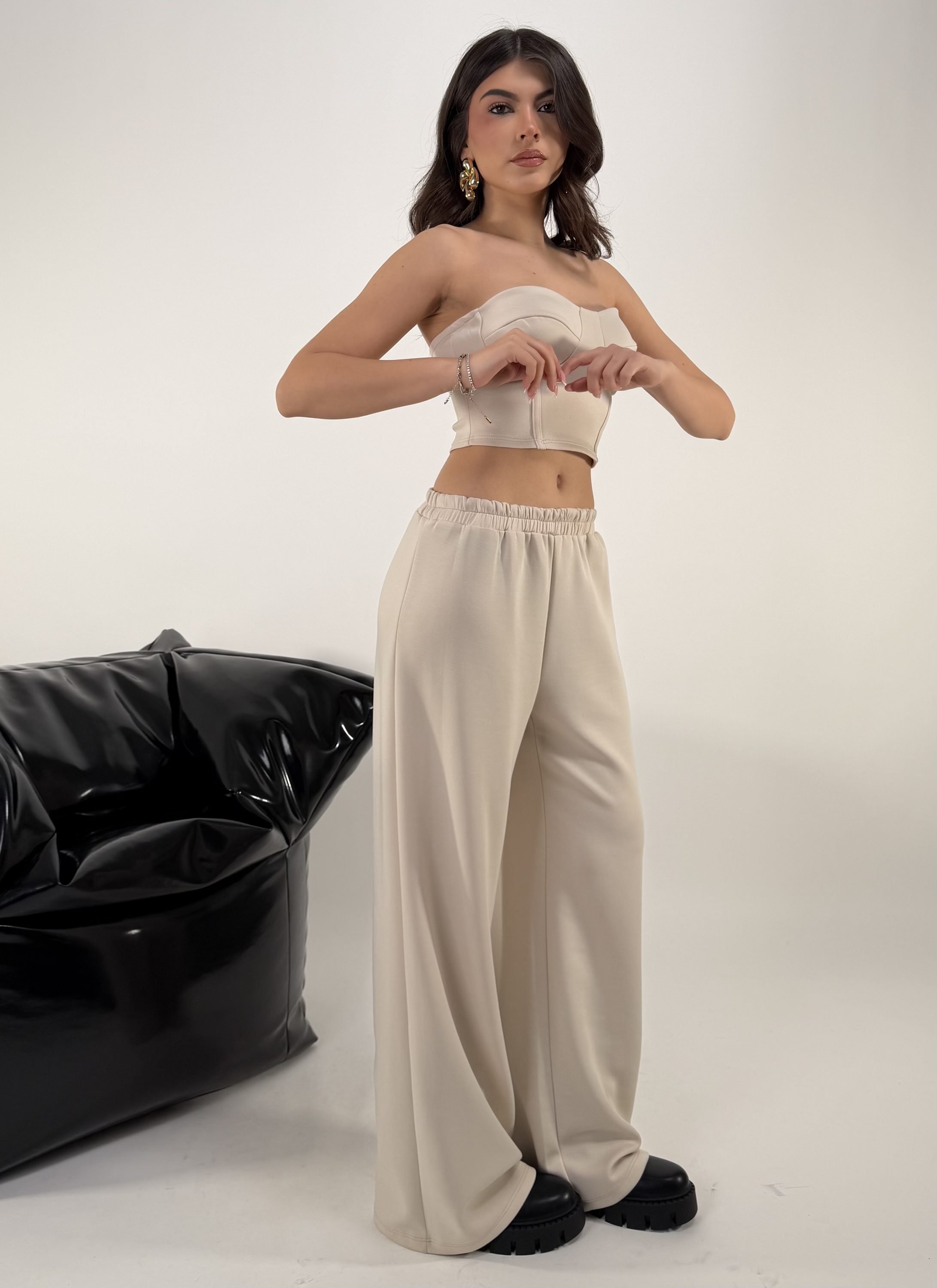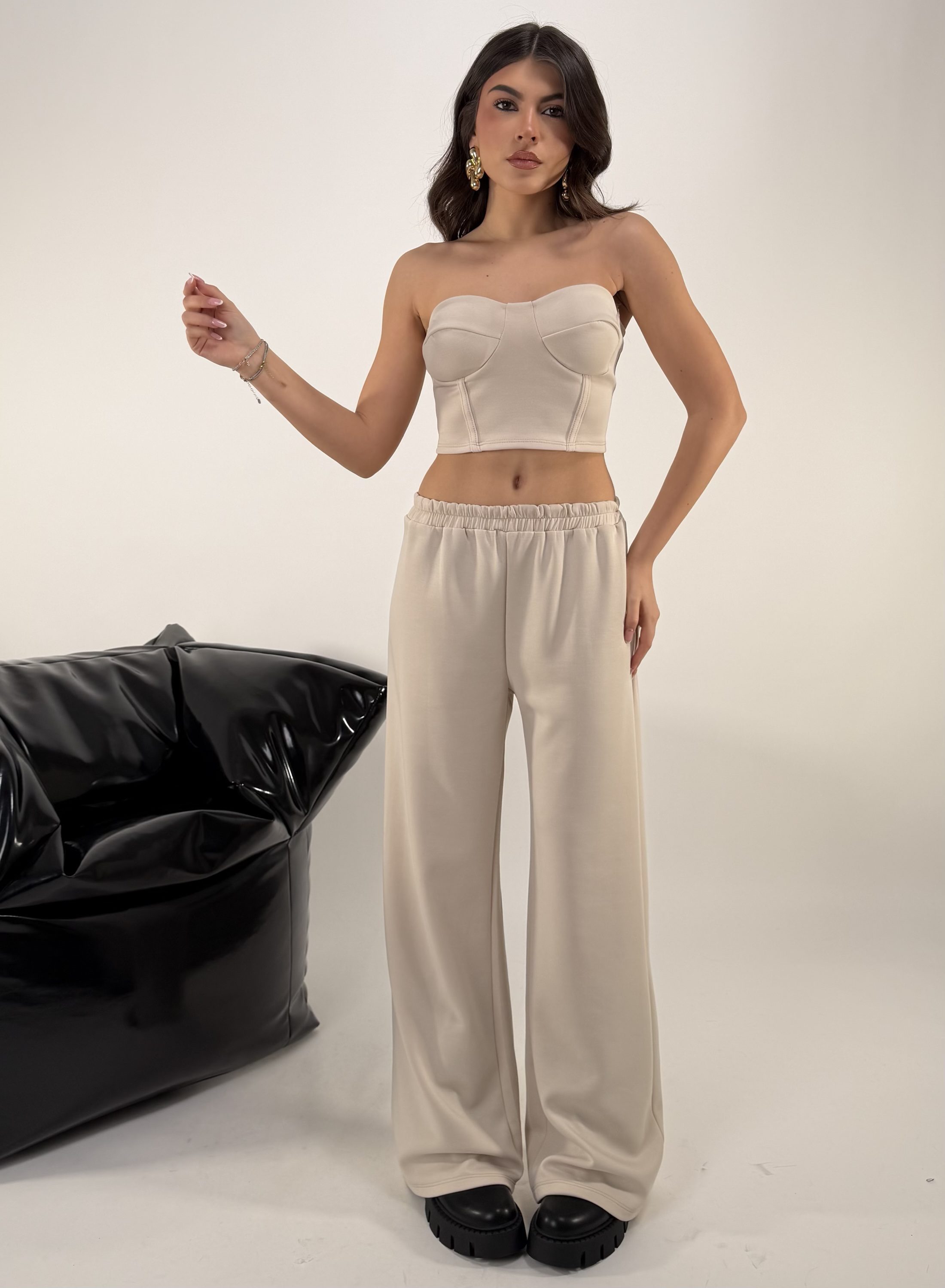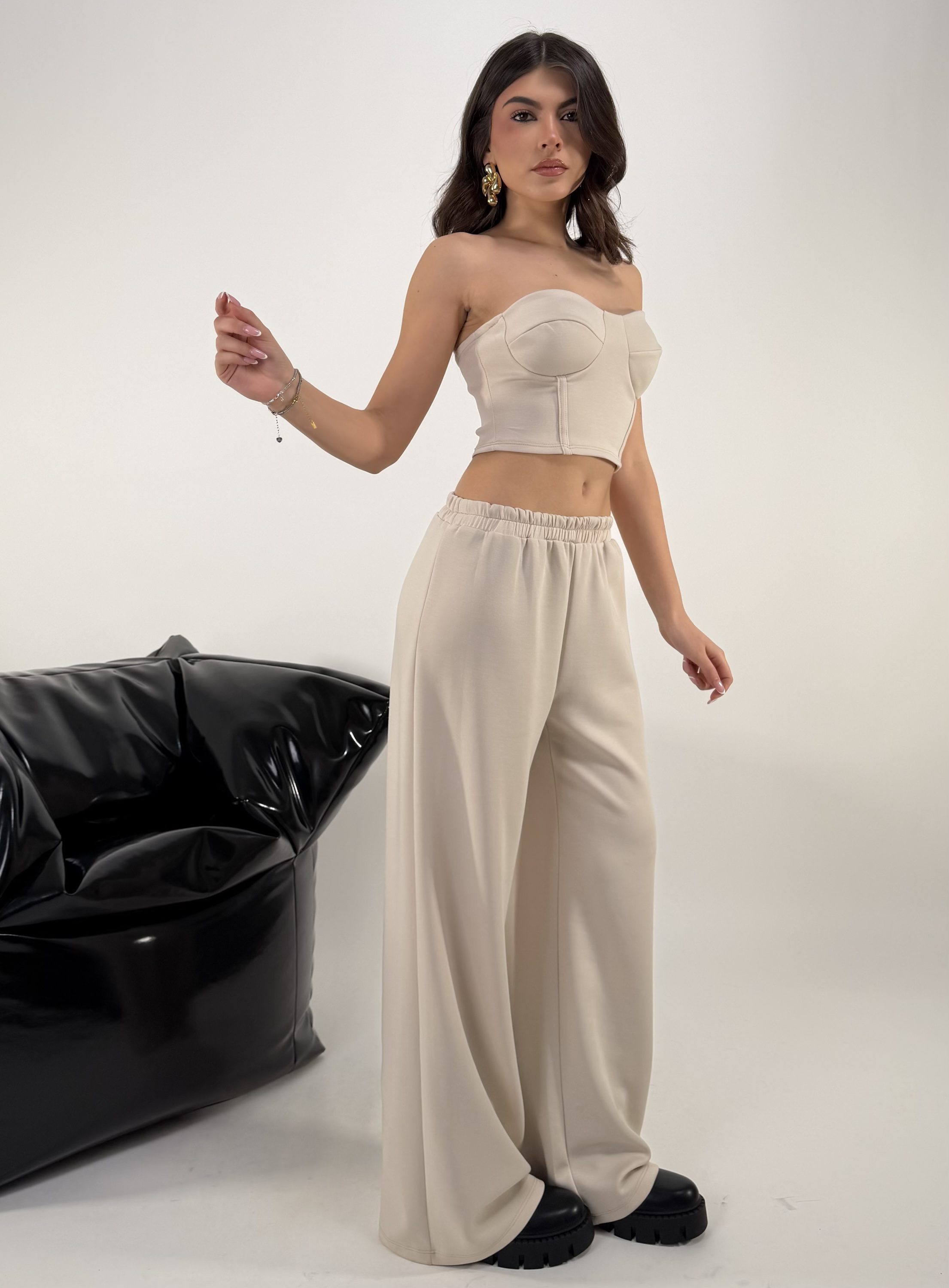 Set di 3 pezzi. Consiglio da xs ad XL, pantalone con elastico in vita. Top elasticizzato. Felpa con cappuccio, zip. La modella รจ una taglia S ed รจ alta 1.65cm