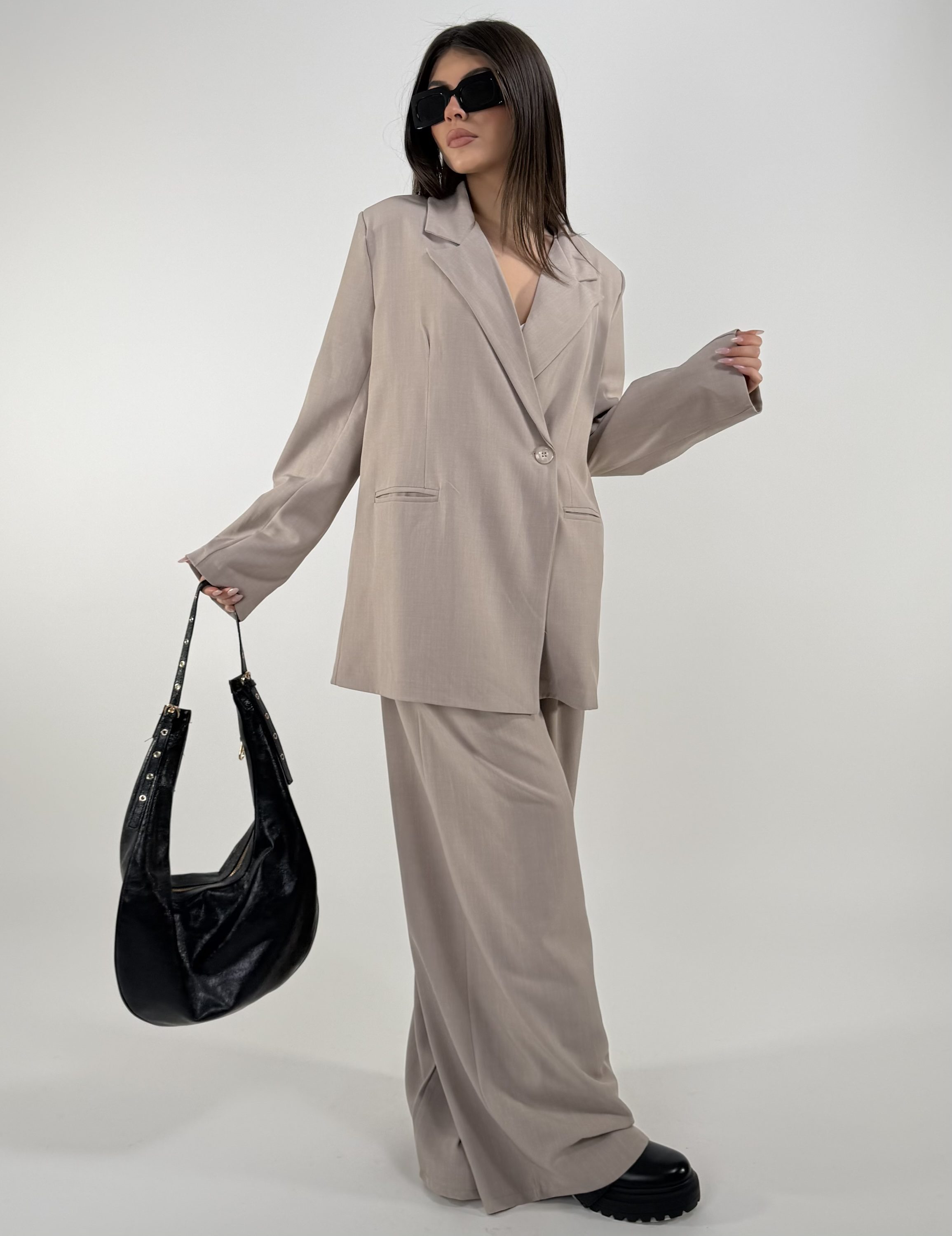 Consiglio da xs ad XL. Pantalone con elastico sul retro, con cintura inclusa, passanti, zip, bottone e tasche. Blazer con spalline rinforzate e bottoni. La modella รจ una taglia S ed รจ alta 1.65cm