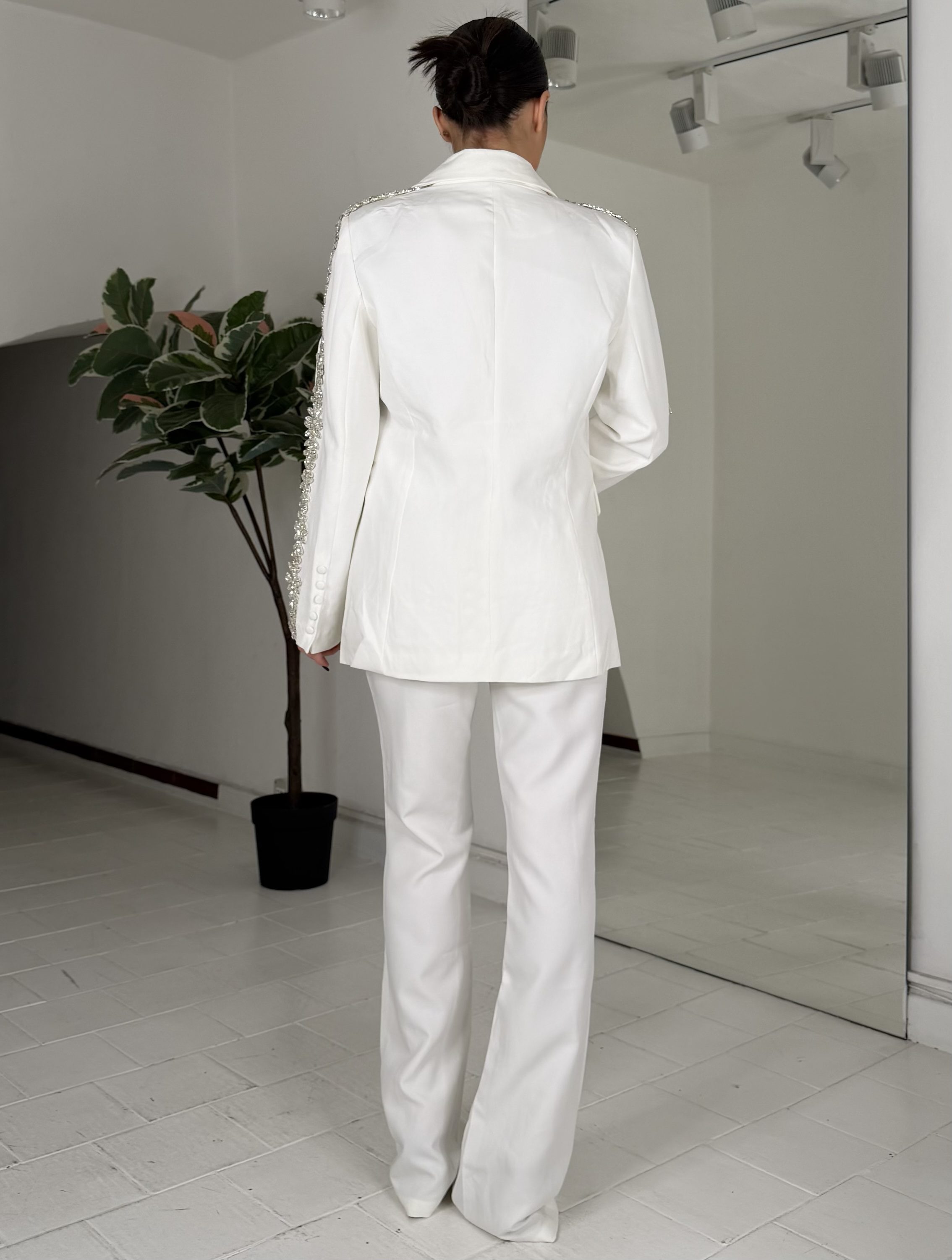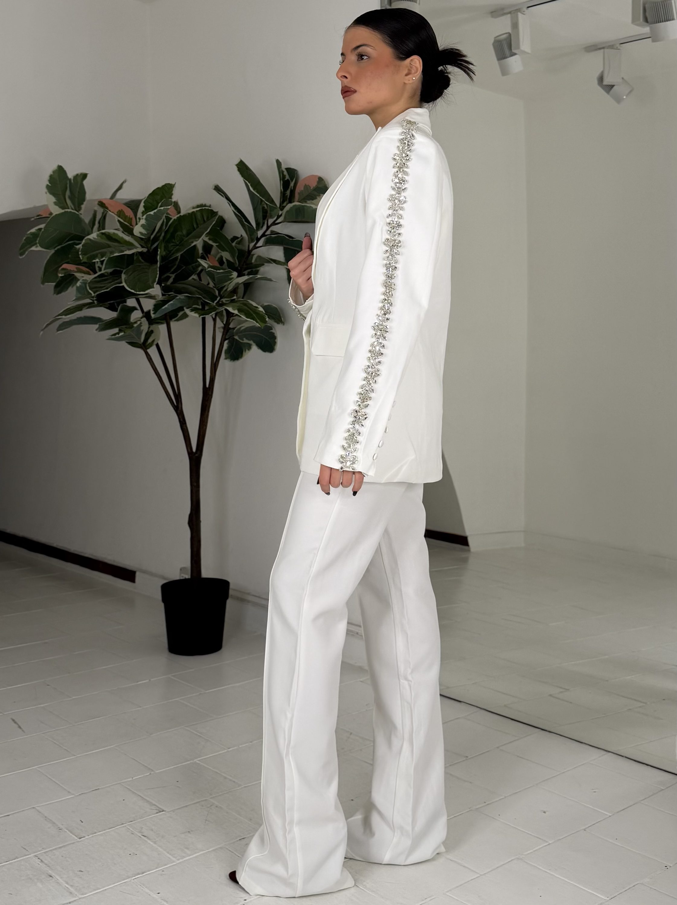 strutturato, top Quality, foderato, pantalone con bottone. La modella รจ una taglia S ed รจ alta 1.60cm