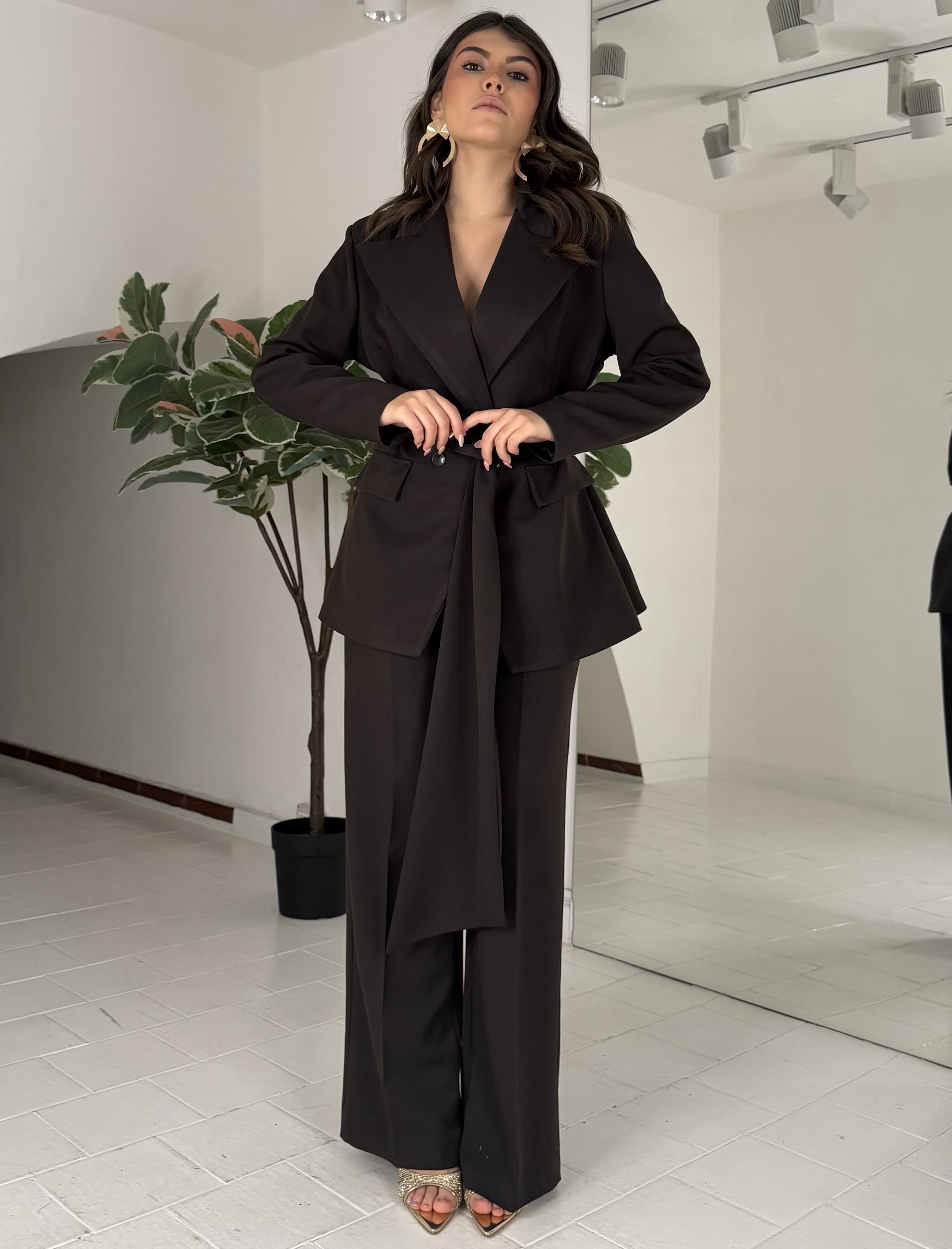 Consiglio da xs ad L. Blazer con spalline, bottoni, cintura rimovibile. Pantalone con elastico sul retro, bottone, zip e passanti. La modella รจ una taglia S ed รจ alta 1.65cm