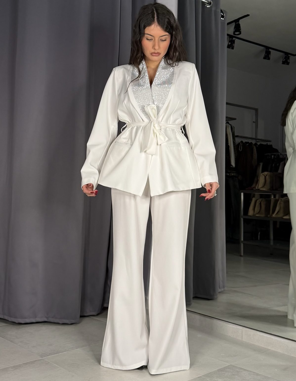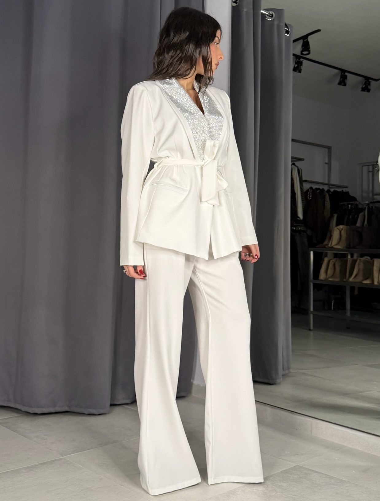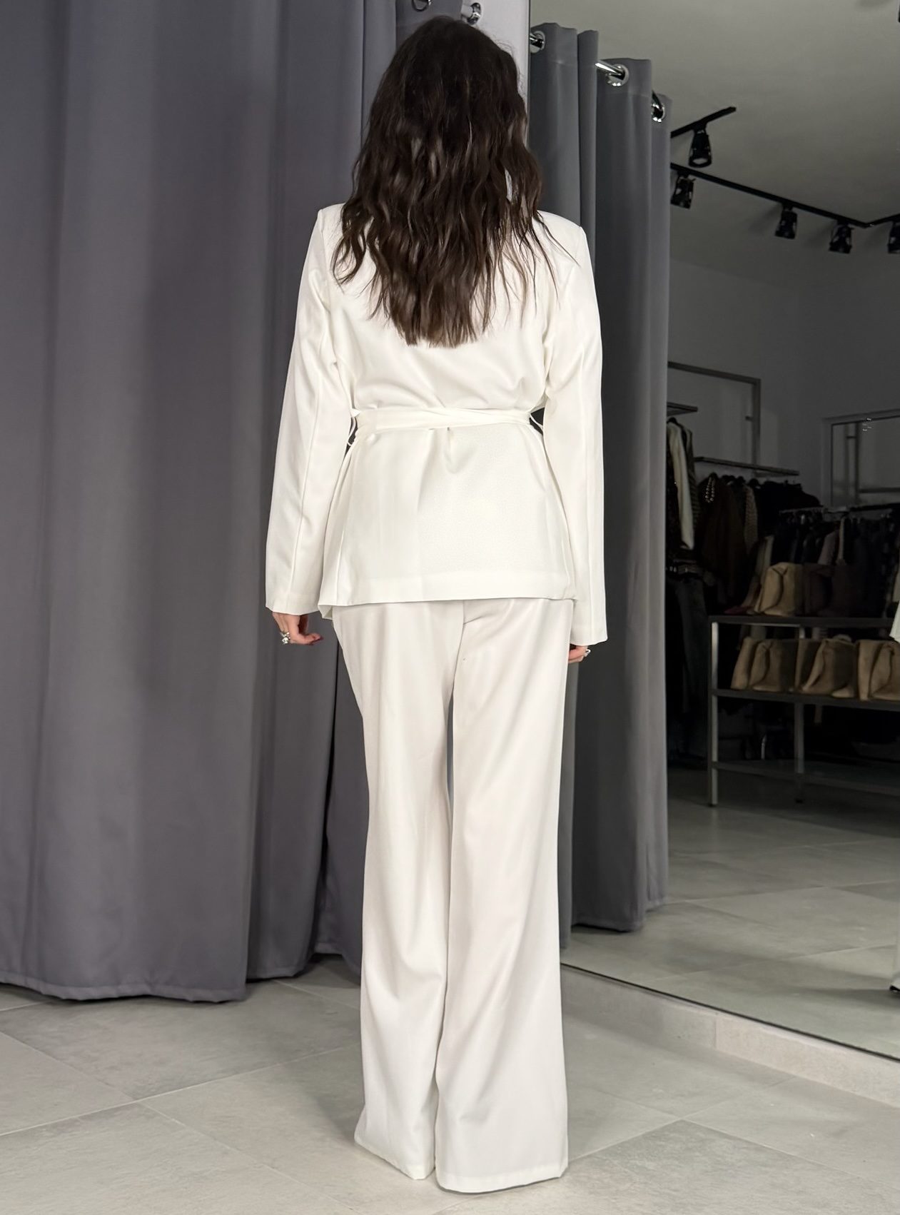 Consiglio da xs ad L, blazer foderato, con cintura. Pantalone con passanti, bottone ed elastico sul retro.