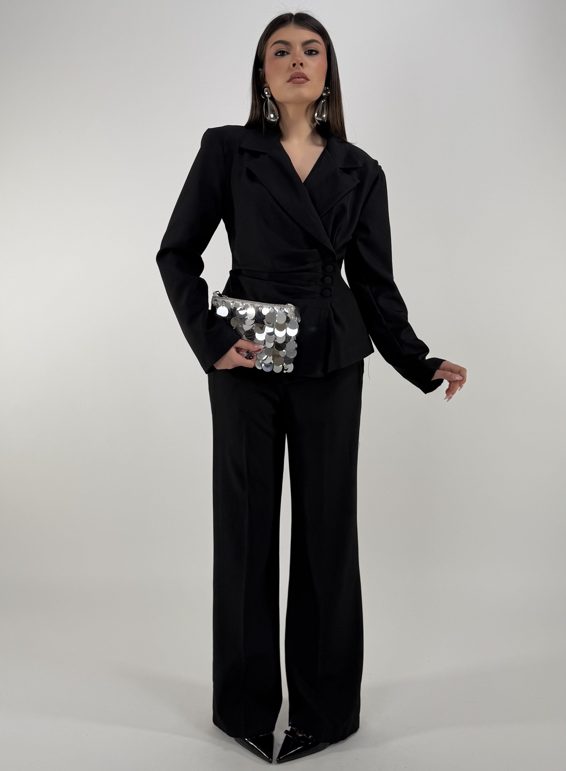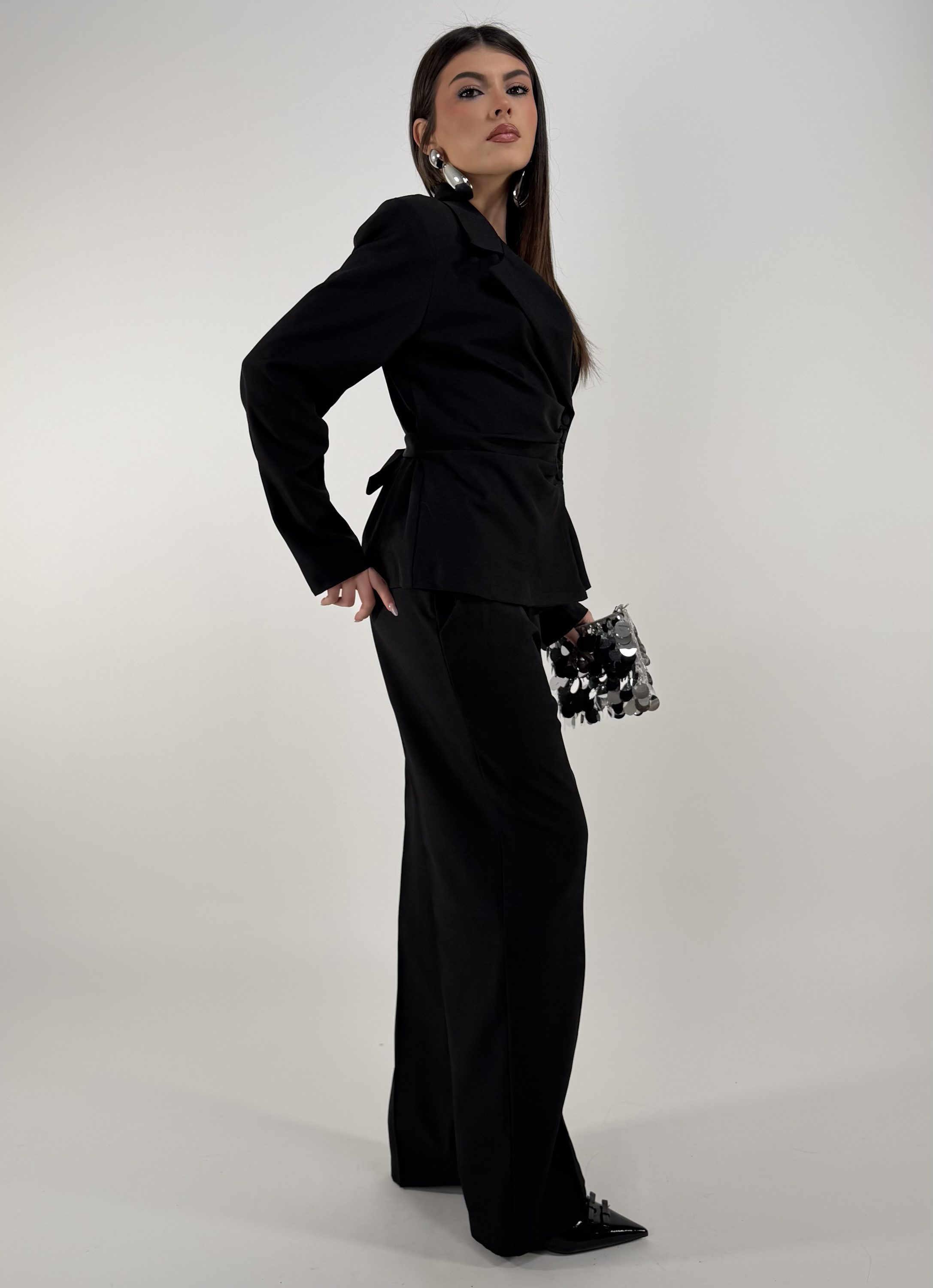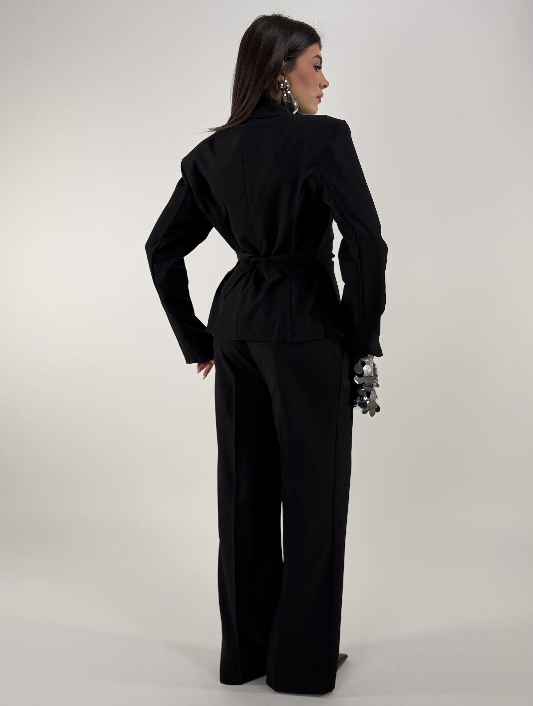Consiglio da xs ad XL. Pantalone con elastico sul retro, passanti, bottone, zip e tasche. Blazer con spalline rinforzate, con bottoni e fiocco regolabile sul retro. La modella รจ una taglia S ed รจ alta 1.65cm