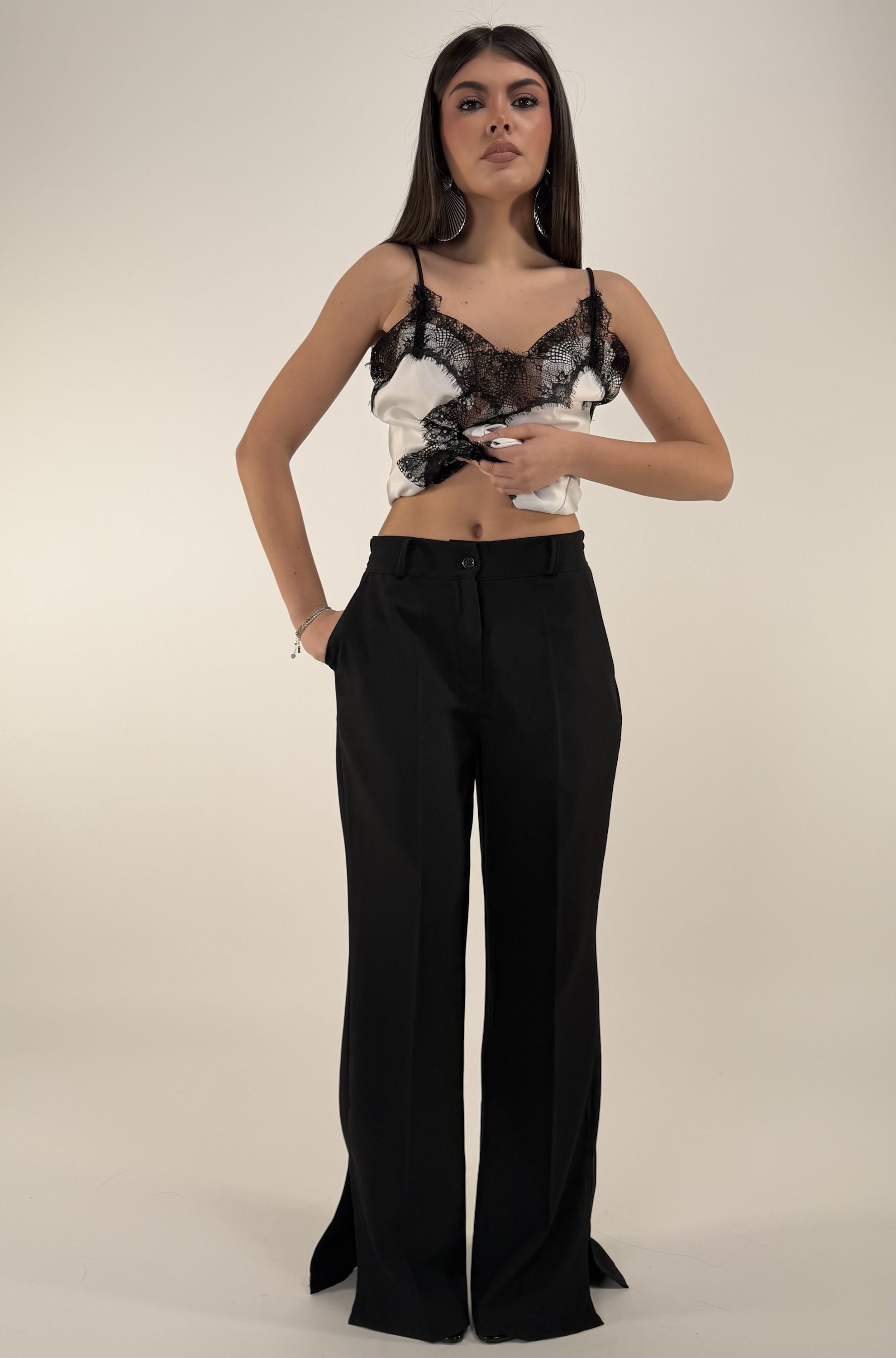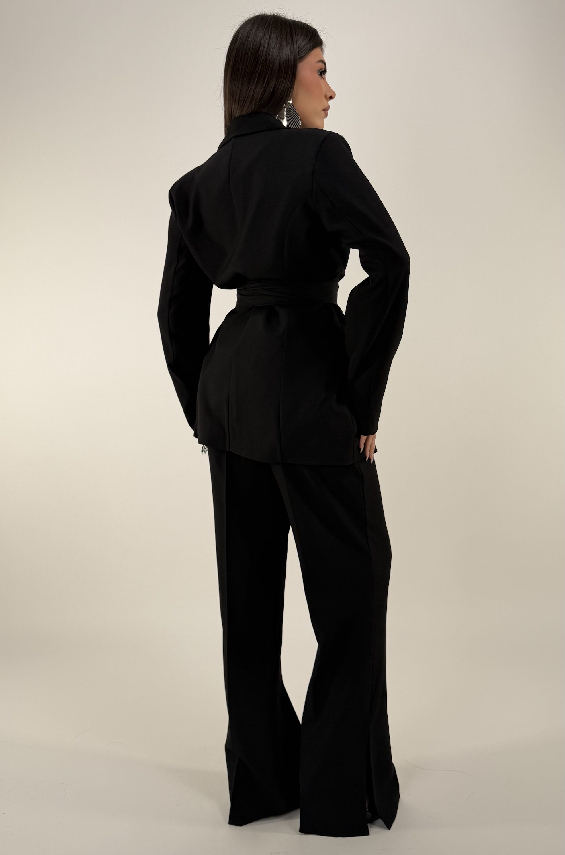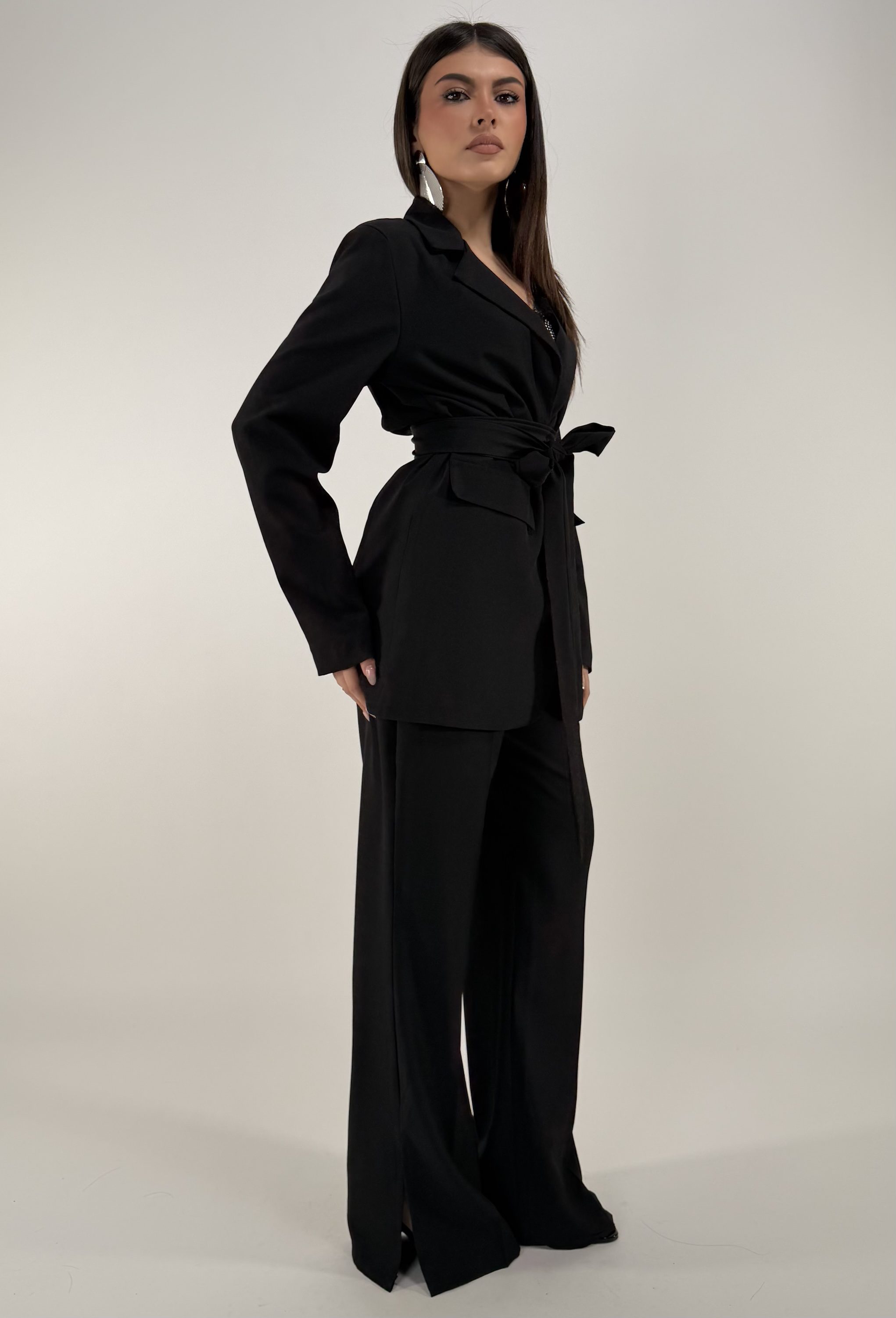 Consiglio da xs ad XL. Pantalone con elastico sul retro, passanti, bottone, zip, e tasche. Blazer con bottone, cintura regolabile e rimovibile, con spalline. La modella รจ una taglia S ed รจ alta 1.65cm
