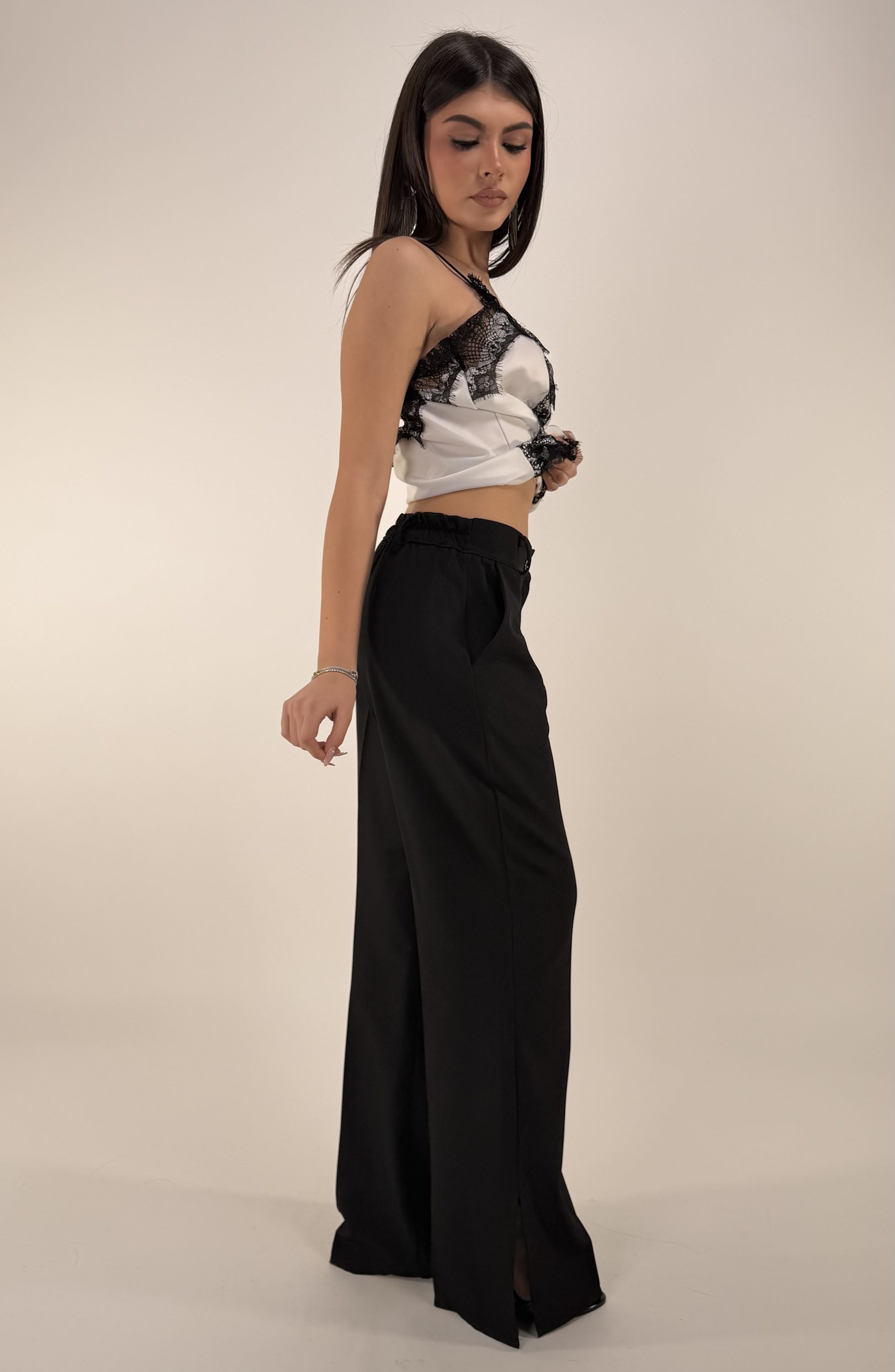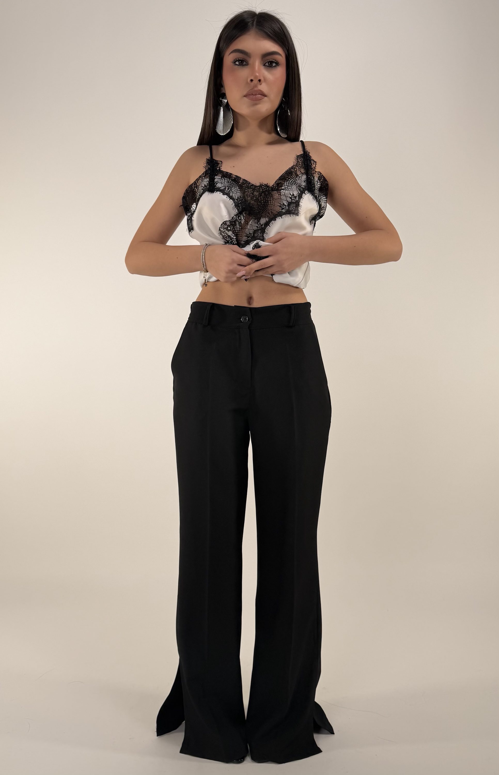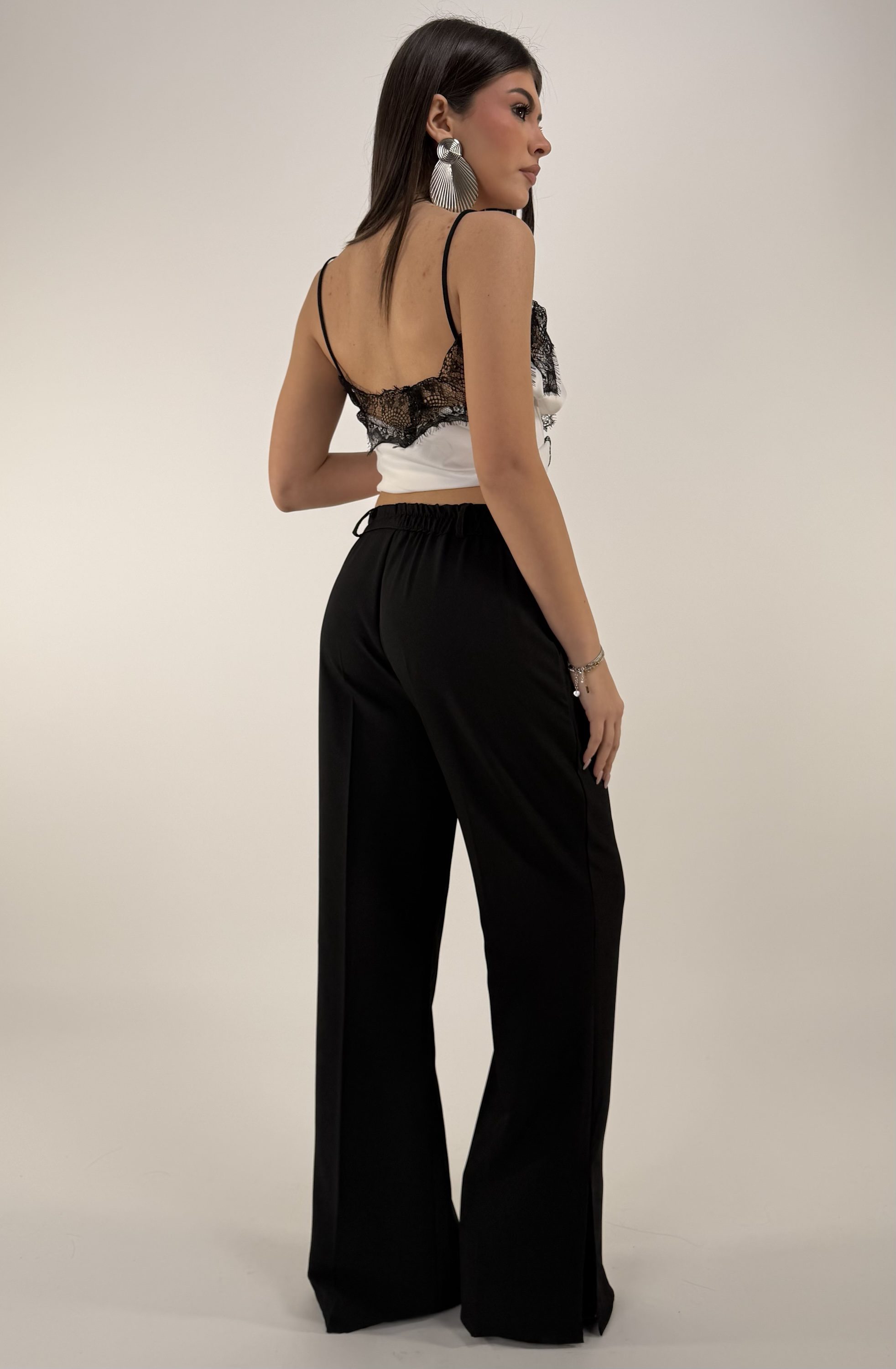 Consiglio da xs ad XL. Pantalone con elastico sul retro, passanti, bottone, zip, e tasche. Blazer con bottone, cintura regolabile e rimovibile, con spalline. La modella รจ una taglia S ed รจ alta 1.65cm