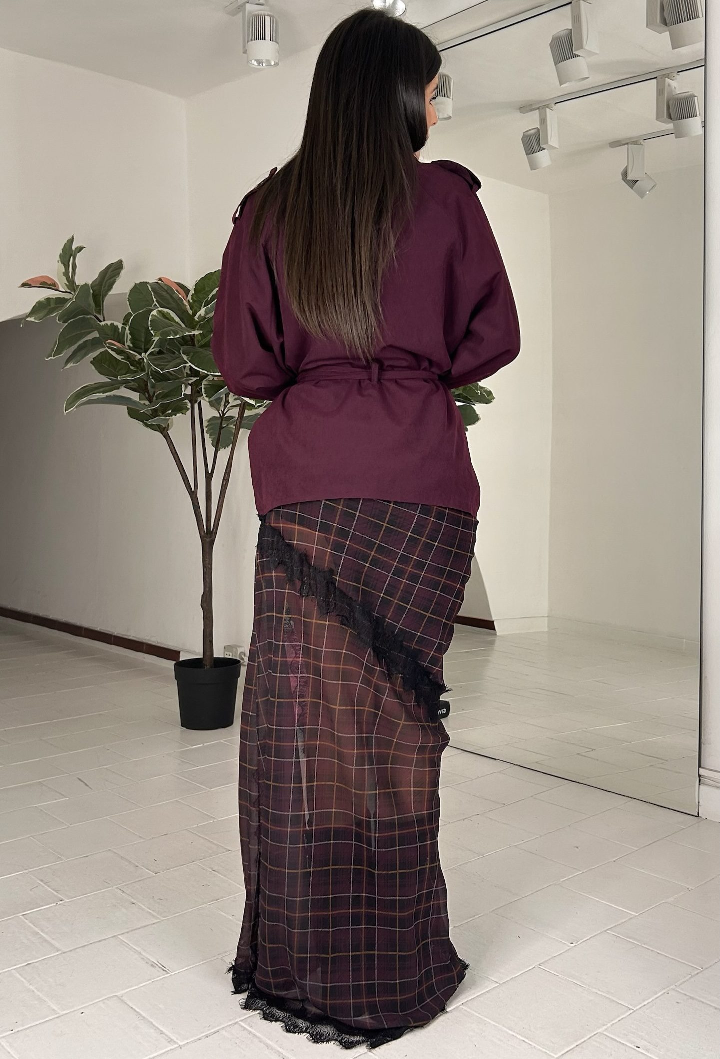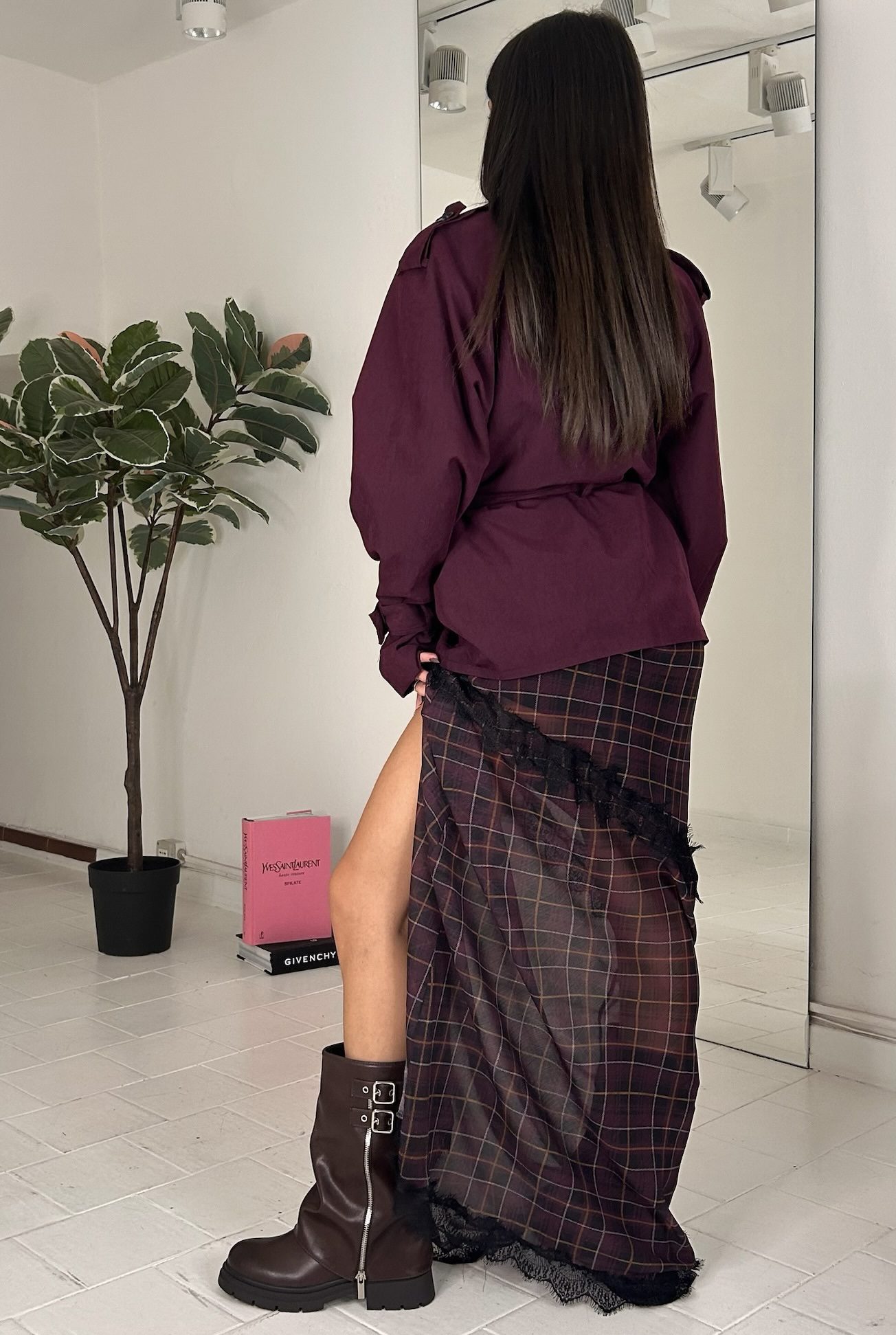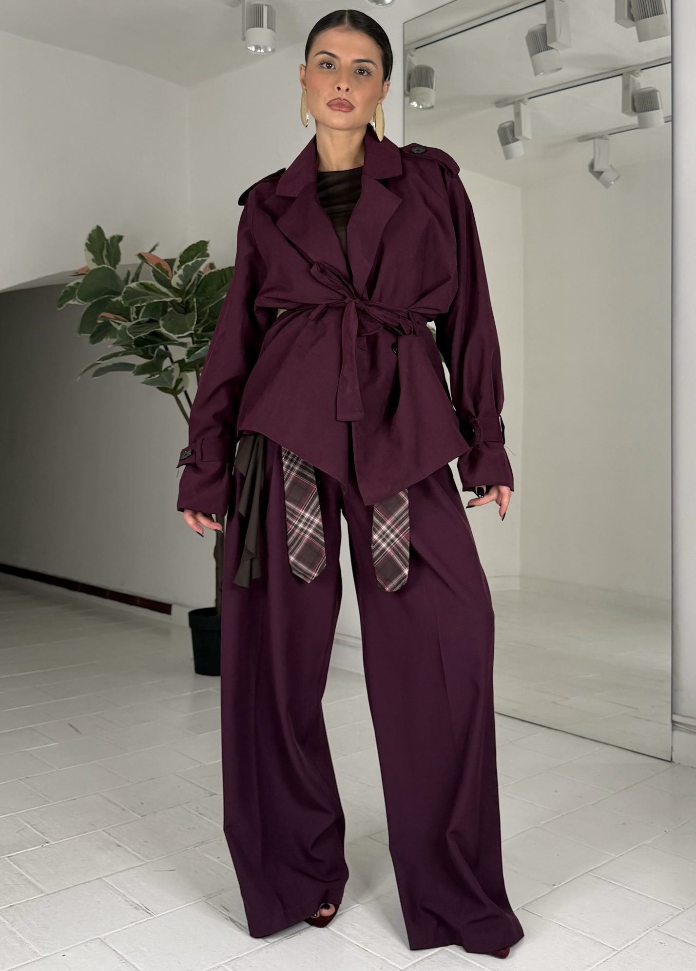 Consiglio da xs ad XL, foderato, in misto camoscio, con cintura, bottoni, applicazioni maniche e spalle. La modella รจ una taglia S