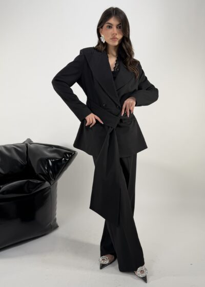 38,00 €Consiglio da xs ad L. Pantalone con elastico sul retro, passanti, bottone e zip. Blazer con bottoni, con spalline rinforzate La modella è una taglia S ed è alta 1.65cm