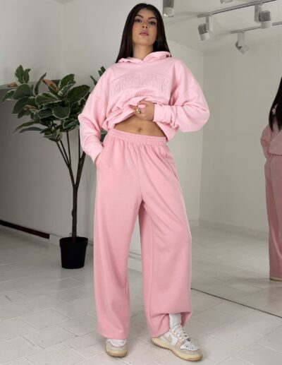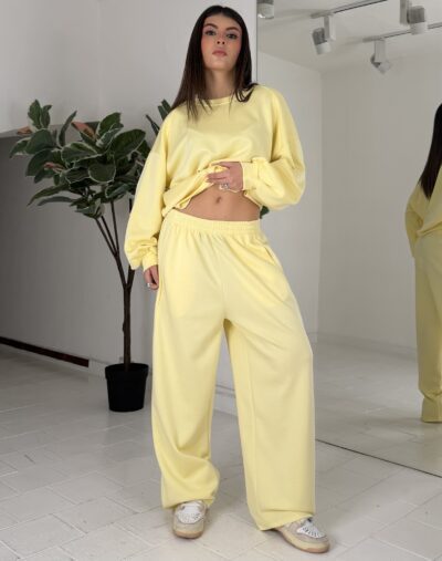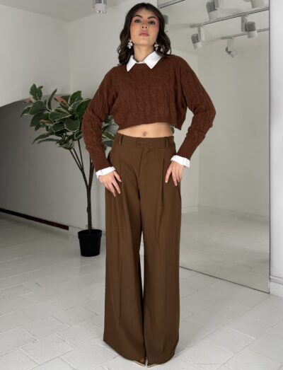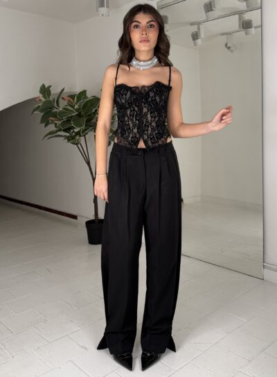 Consiglio da xs ad L. Blazer Crop, con spalline e bottoni. Pantalone con elastico sul retro, con bottone, zip, passanti e tasche. Dettaglio bottoni sulla base del pantalone. La modella è alta 1.65cm ed è una taglia S